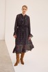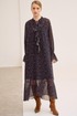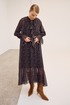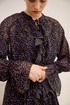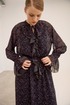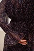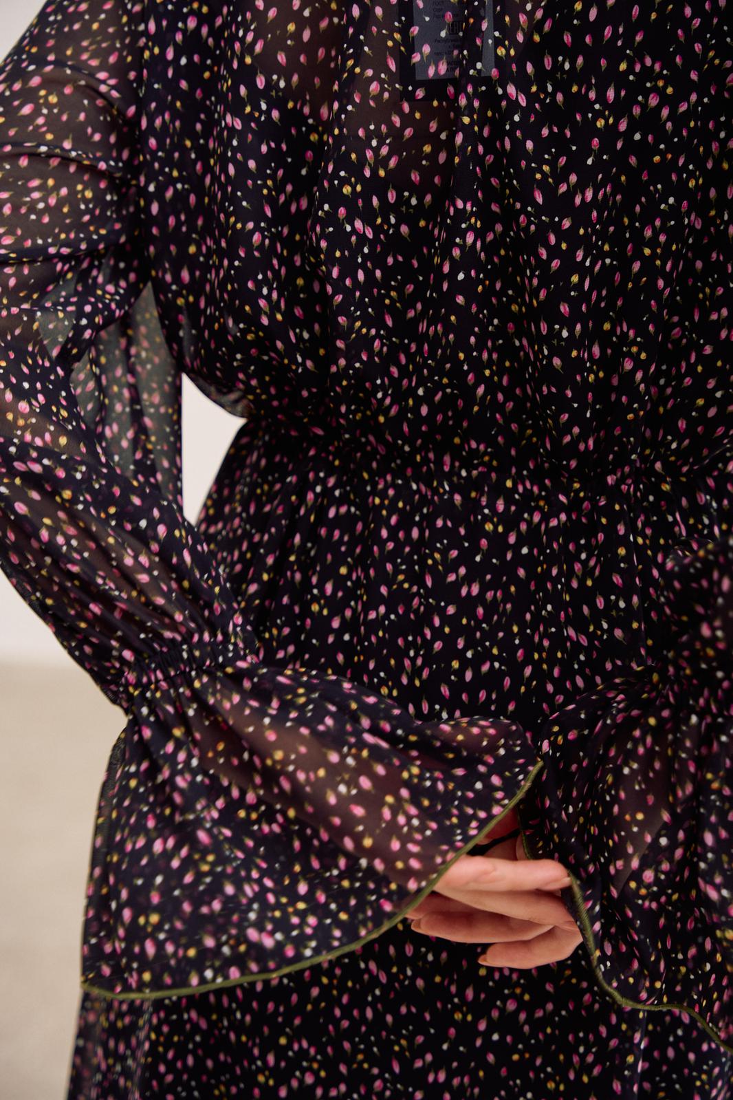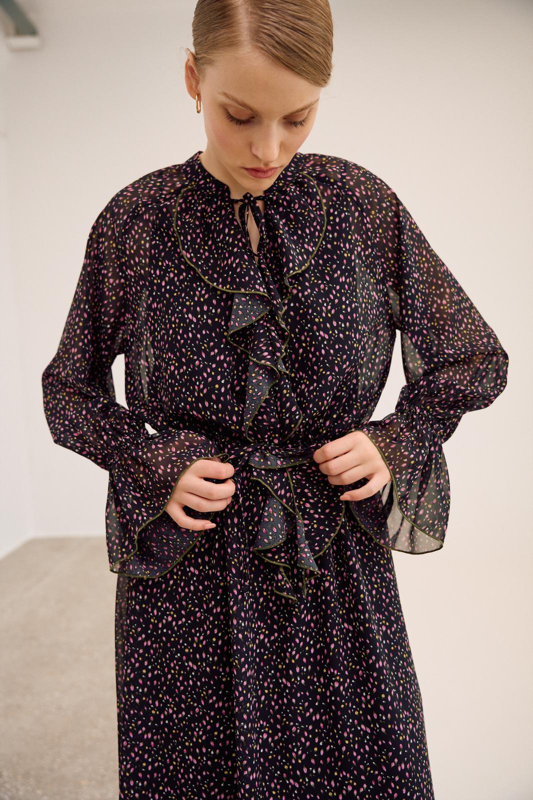 Платье свободного кроя, выполнено из шифона, дизайн горох. Рукав длинный реглан, по низу рукава резинка. Глубокий V-образный вырез горловины, в который вставлена рюша, по горловине стойка на завязку, по середине выреза застежка на навесной потайной крючок. По линии талии по переду и спинке кулиса на завязку, по низу платья притачной волан. В комплект входит платье-комбинация из трикотажной подкладки на бретелях.