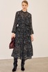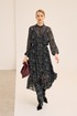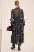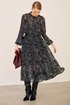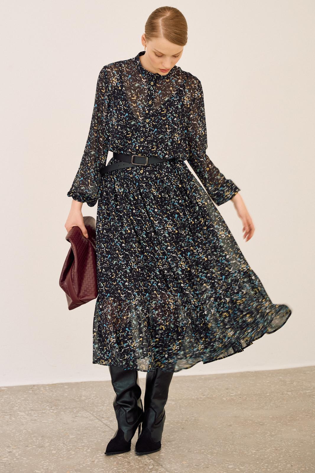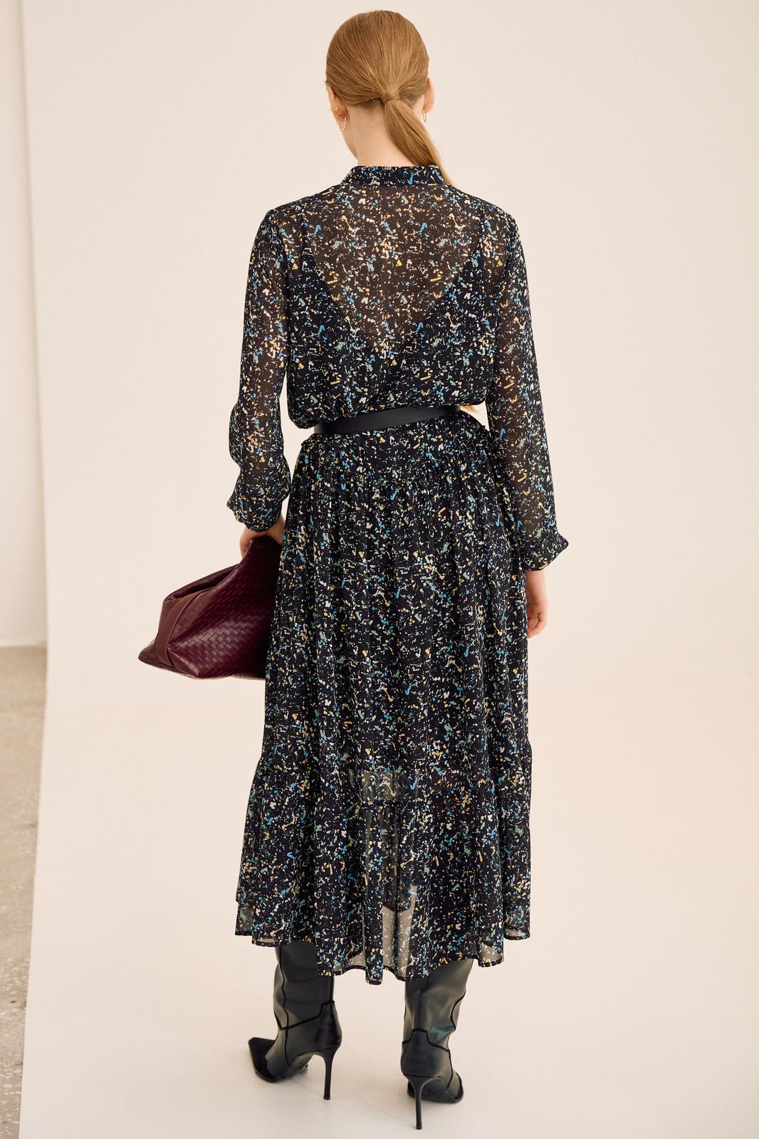 Шифоновое платье, которое идеально подойдёт для создания лёгкого многослойного образа. Платье состоит, из двух слоёв. Верхний слой выполнен из нежного шифона, нижний - это комбинация из трикотажной лёгкой подкладки. Платье свободного кроя «А»-силуэта с втачным длинным рукавом, по низу рукава притачная манжета на застёжку петли и пуговицы. По горловине стойка, по переду притачная планка, застёжка центральная на петли и пуговицы. К нижней части лифа платья ярусами нашиты воланы в сборку. В комплект входит кожаный ремень.