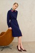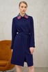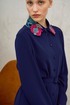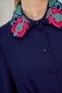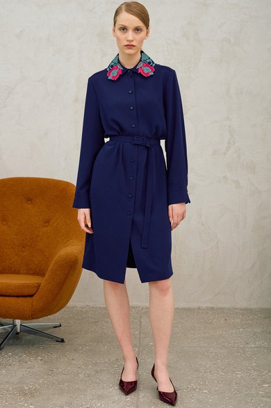 Платье-рубашка прямого силуэта с центральной застежкой на петли и пуговицы. Рукав длинный втачной с отрезной манжетой и застежкой на петли и пуговицы. Воротник рубашечного кроя, декорирован вышивкой. По спинке отрезная кокетка и складки. В комплекте съемный пояс.