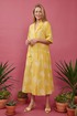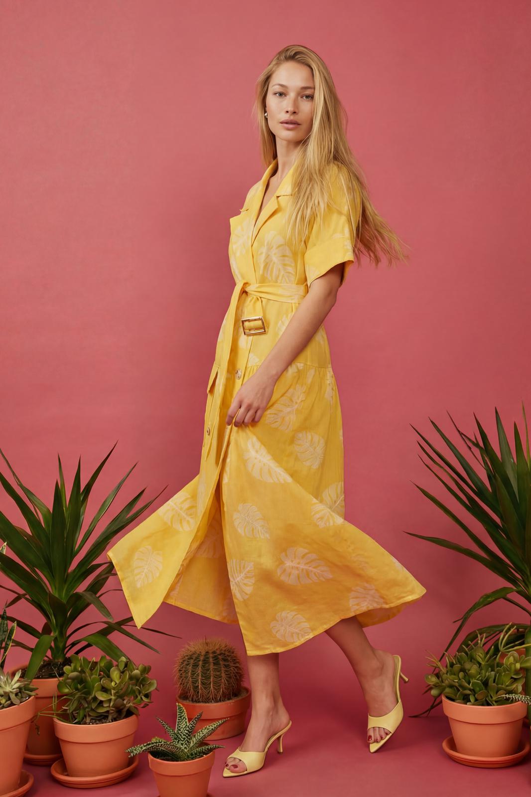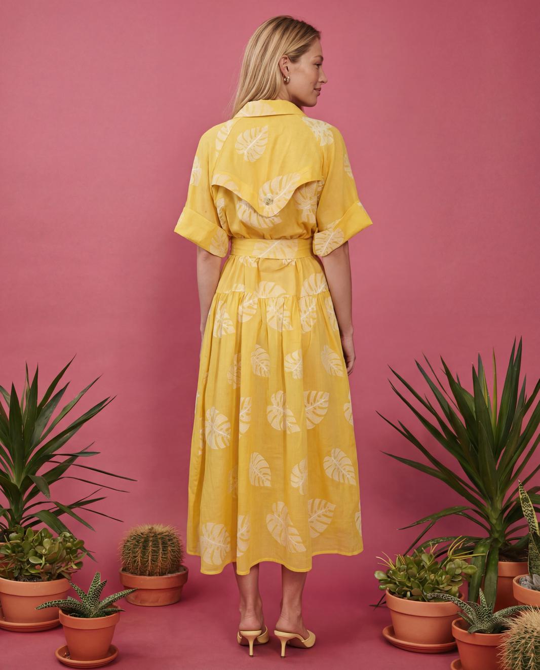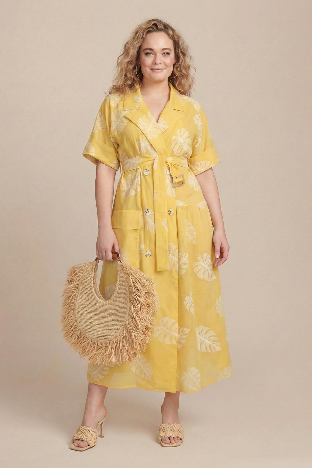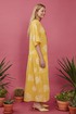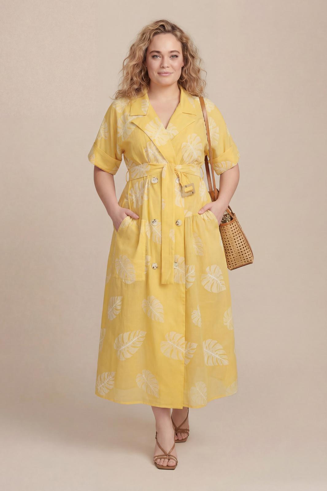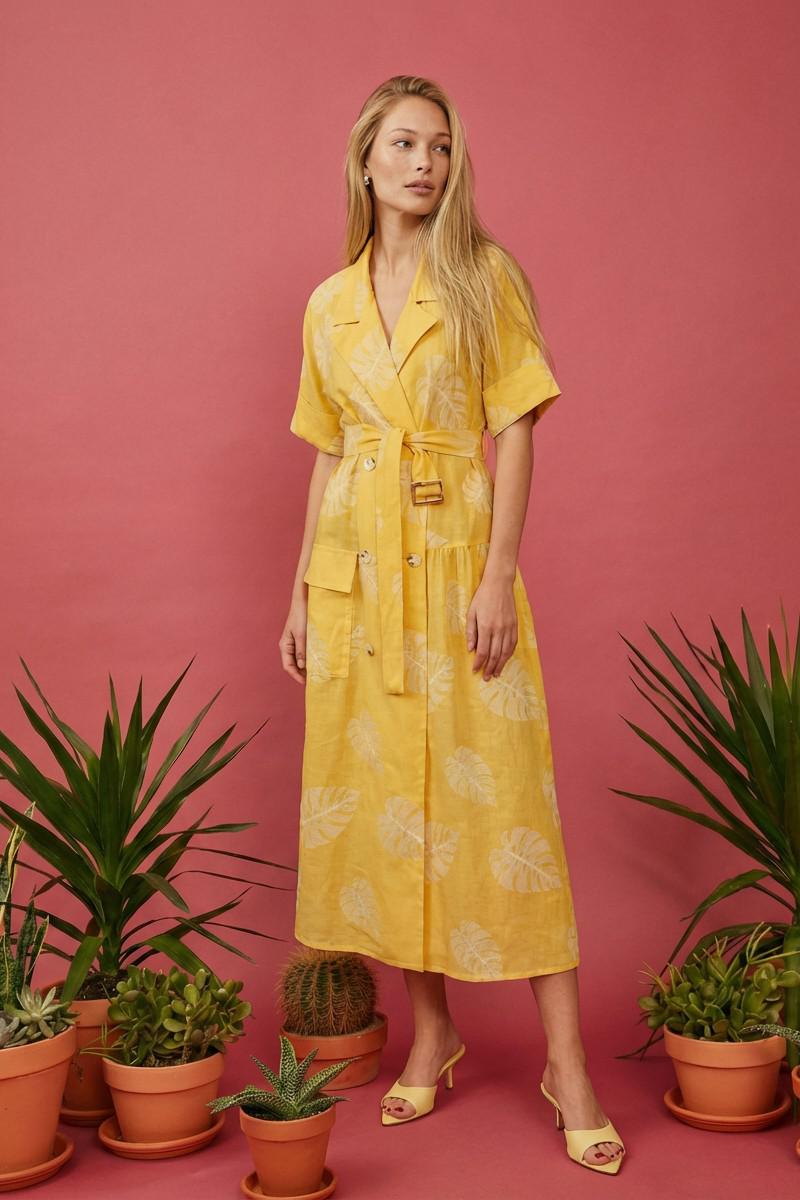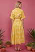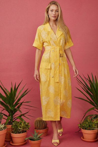 Платье свободного кроя, выполнено из хлопка. Линия плеча спущена, воротник рубашечного кроя. На правой части на уровне бедер платья накладной карман с отлетным клапаном. По левой стороне подрез на уровне бедер и от подреза на юбке платья сборка. По спинке отлетная кокетка, подрез на уровне бедер и сборка по юбке платья.