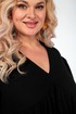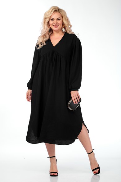 Платье женское, силуэт «трапеция». Длина миди. По низу платья выполнена фигурная отрезная кокетка. Нижний срез кокетки оформлен сборкой. По спинке встречная складка, выходящая из прямой кокетки.
