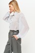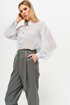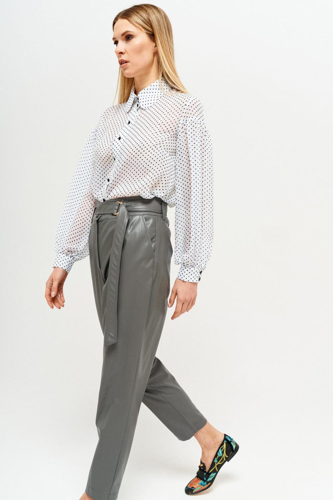 Воздушная блузка из шифона, свободного силуэта. Воротник рубашечного типа на притачной стойке овальной формы. Перед с нагрудными вытачками и центральной застежкой на петли и пуговицы на притачных планках. Рукав втачной длинный, с отрезной деталью и сборкой в верхней части, на притачной манжете с застежкой на петли и пуговицы и сборкой понизу.