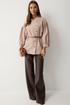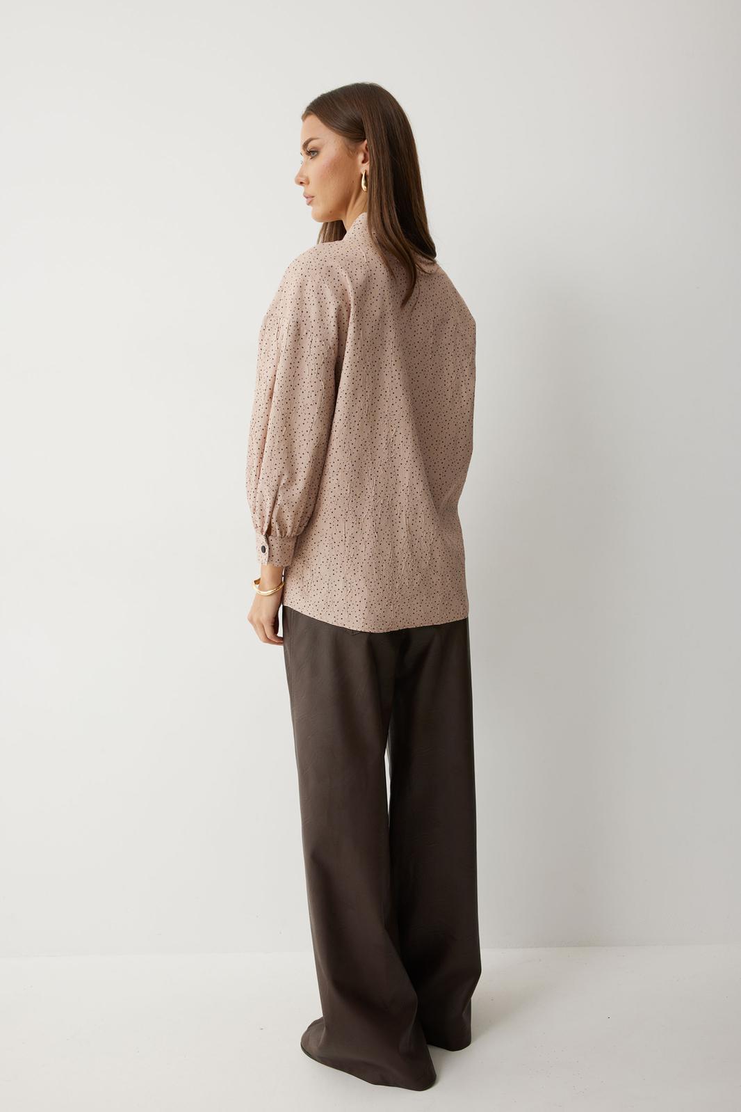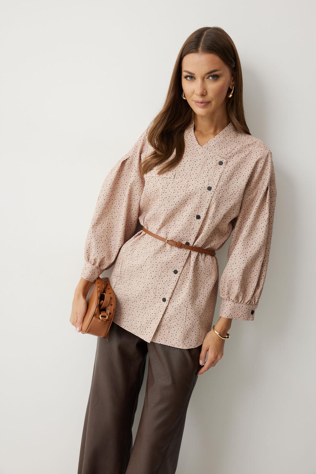 Ассиметричная блузка прямого силуэта. Низ фигурный. Рукав, спущенный с встречной складкой по центру. По низу манжета с застежкой на кнопку. По переду декоративная настрочная листочка. Ассиметричная двубортная застежка на кнопки. Воротник-стойка. Обращаем ваше внимание, что фурнитура может незначительно отличаться от фото.