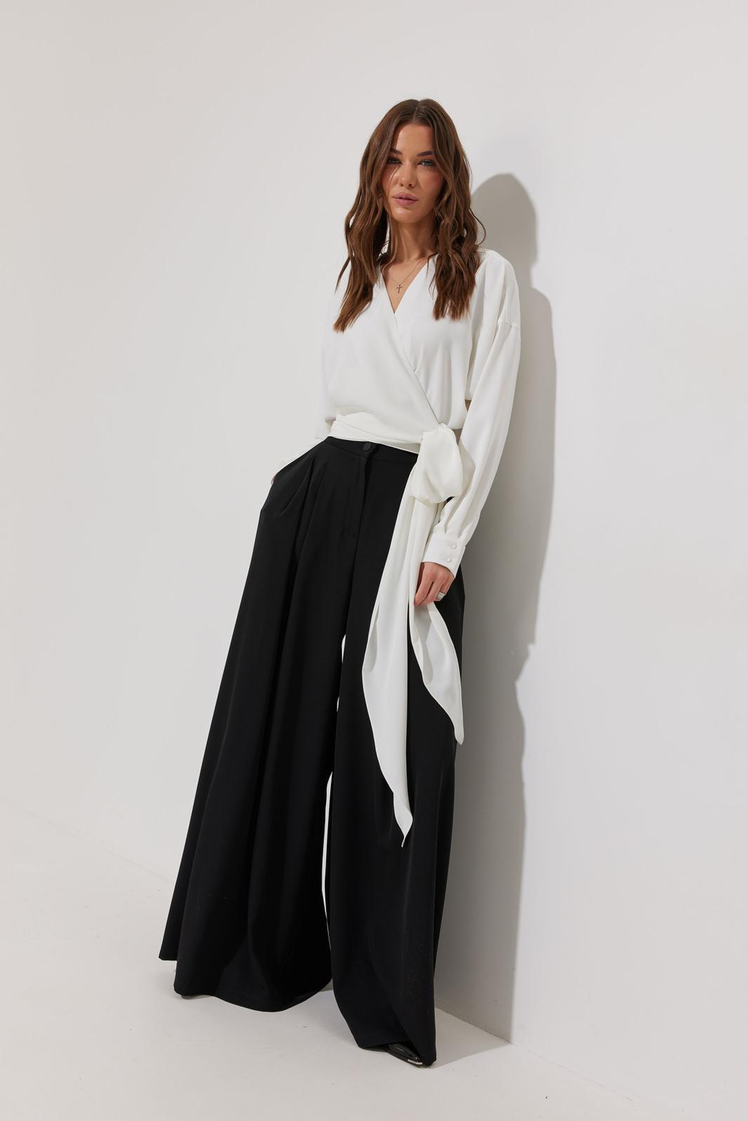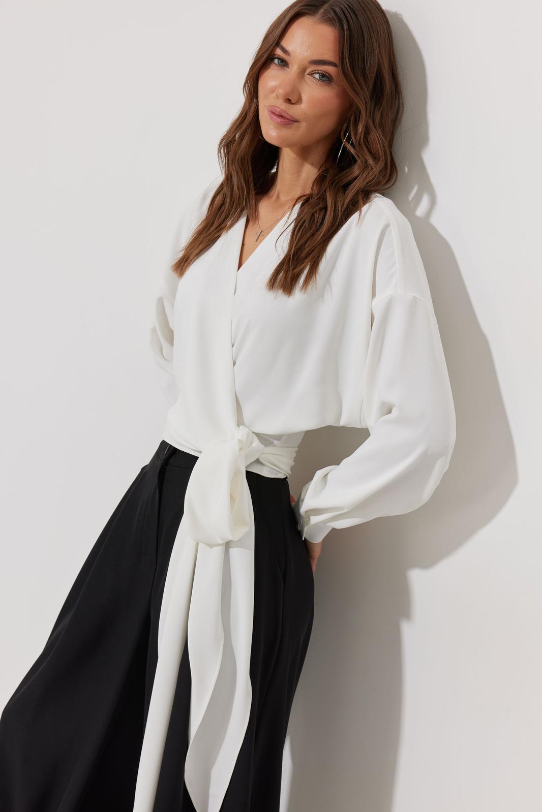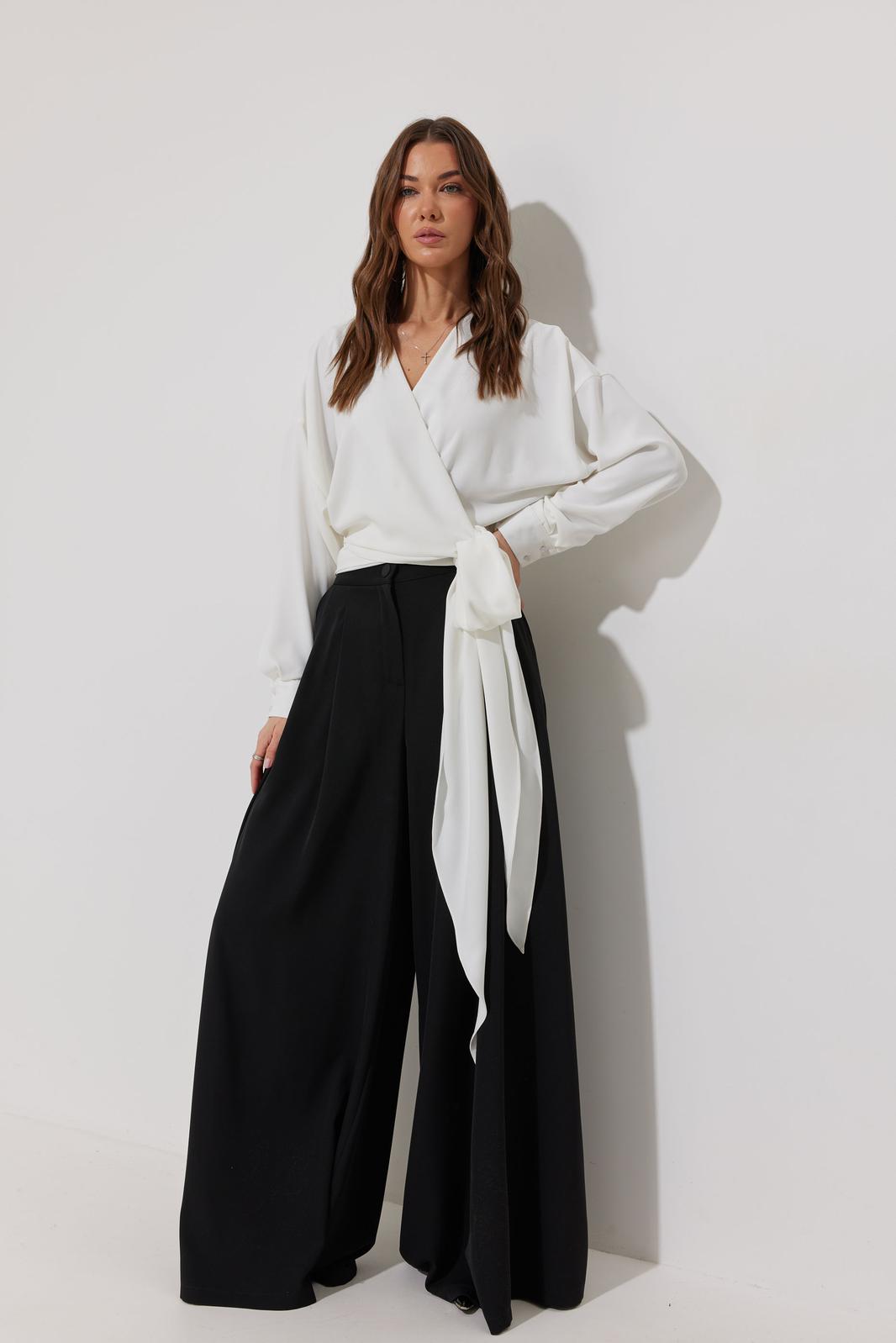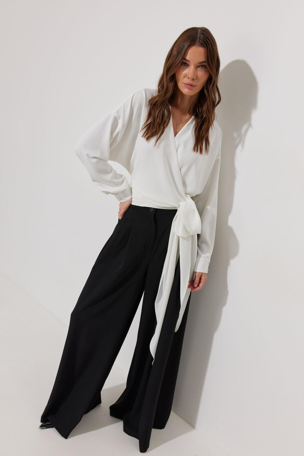 Блузка на запах из струящейся ткани, прямого, слегка расширенного силуэта. Застежка на объемные бант-завязки на боку. Рукав цельнокроеный отрезной, с манжетой с застежкой на петли-пуговицы. Обращаем Ваше внимание, что фурнитура может незначительно отличаться от фото.