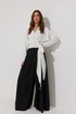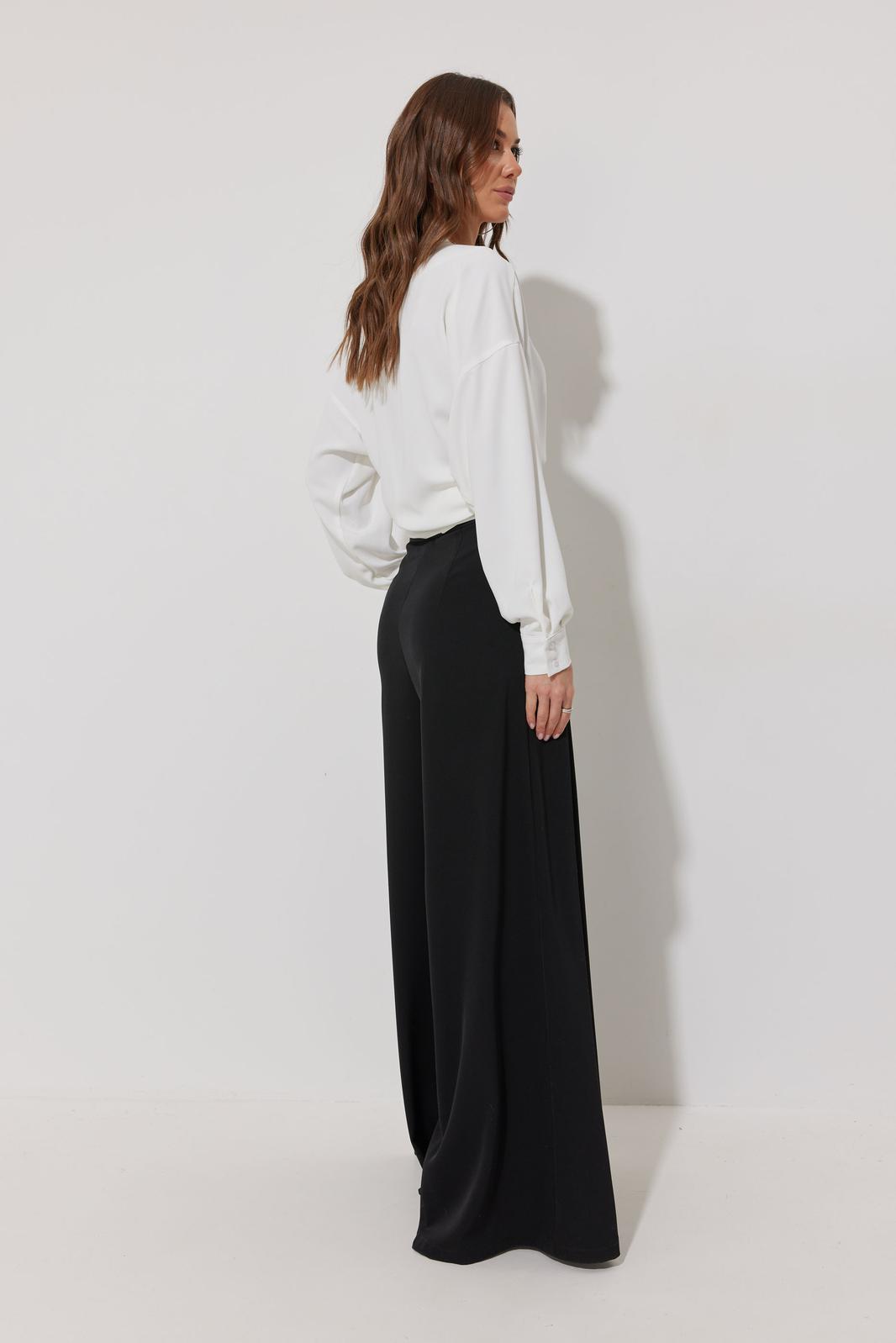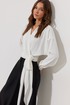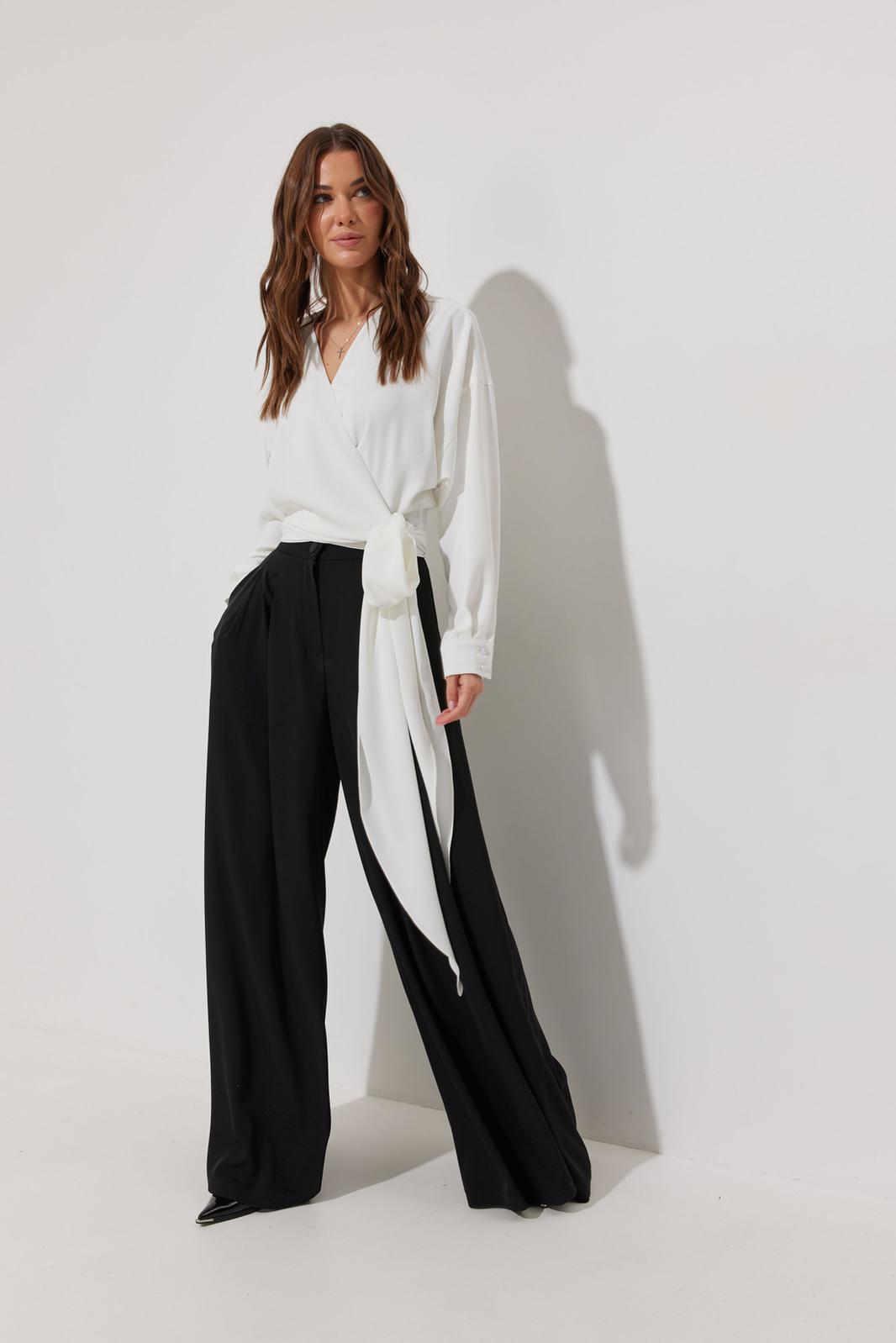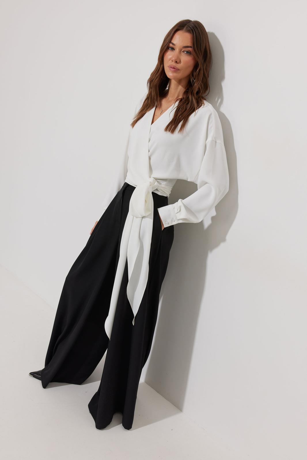 Блузка на запах из струящейся ткани, прямого, слегка расширенного силуэта. Застежка на объемные бант-завязки на боку. Рукав цельнокроеный отрезной, с манжетой с застежкой на петли-пуговицы. Обращаем Ваше внимание, что фурнитура может незначительно отличаться от фото.