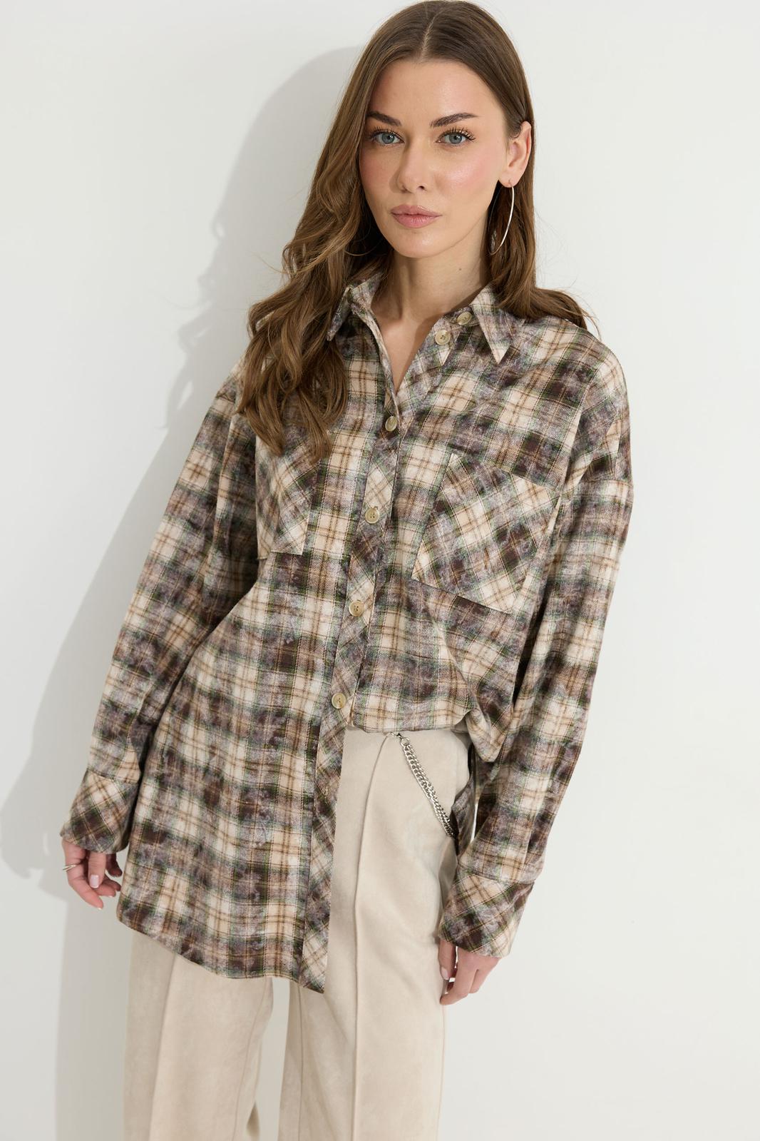 Блузка прямого силуэта из плательно-костюмной ткани с фигурным низом. Воротник стояче-отложной с отрезной стойкой, по центру застежка на петли и пуговицы. Рукав со спущенной линией плеча, по низу манжета с застежкой на петли и пуговицы. По переду накладные карманы. На спинке кокетка со складками. Обращаем ваше внимание, что фурнитура может отличаться от фото.