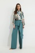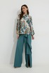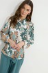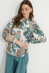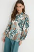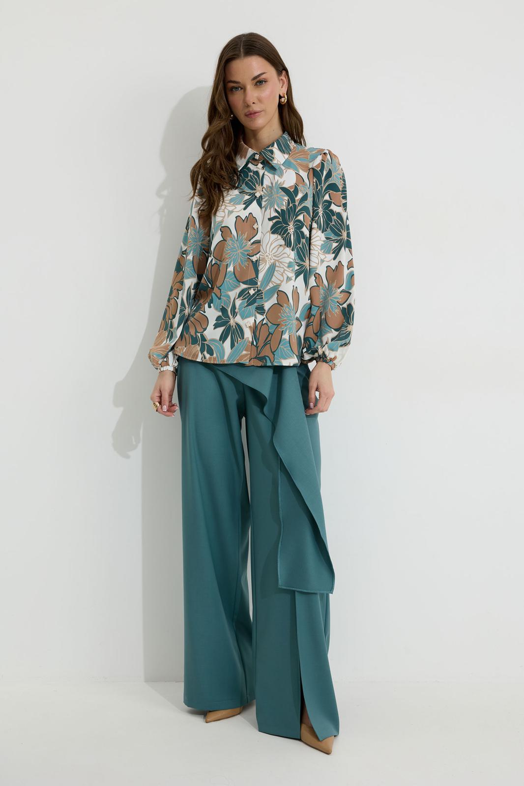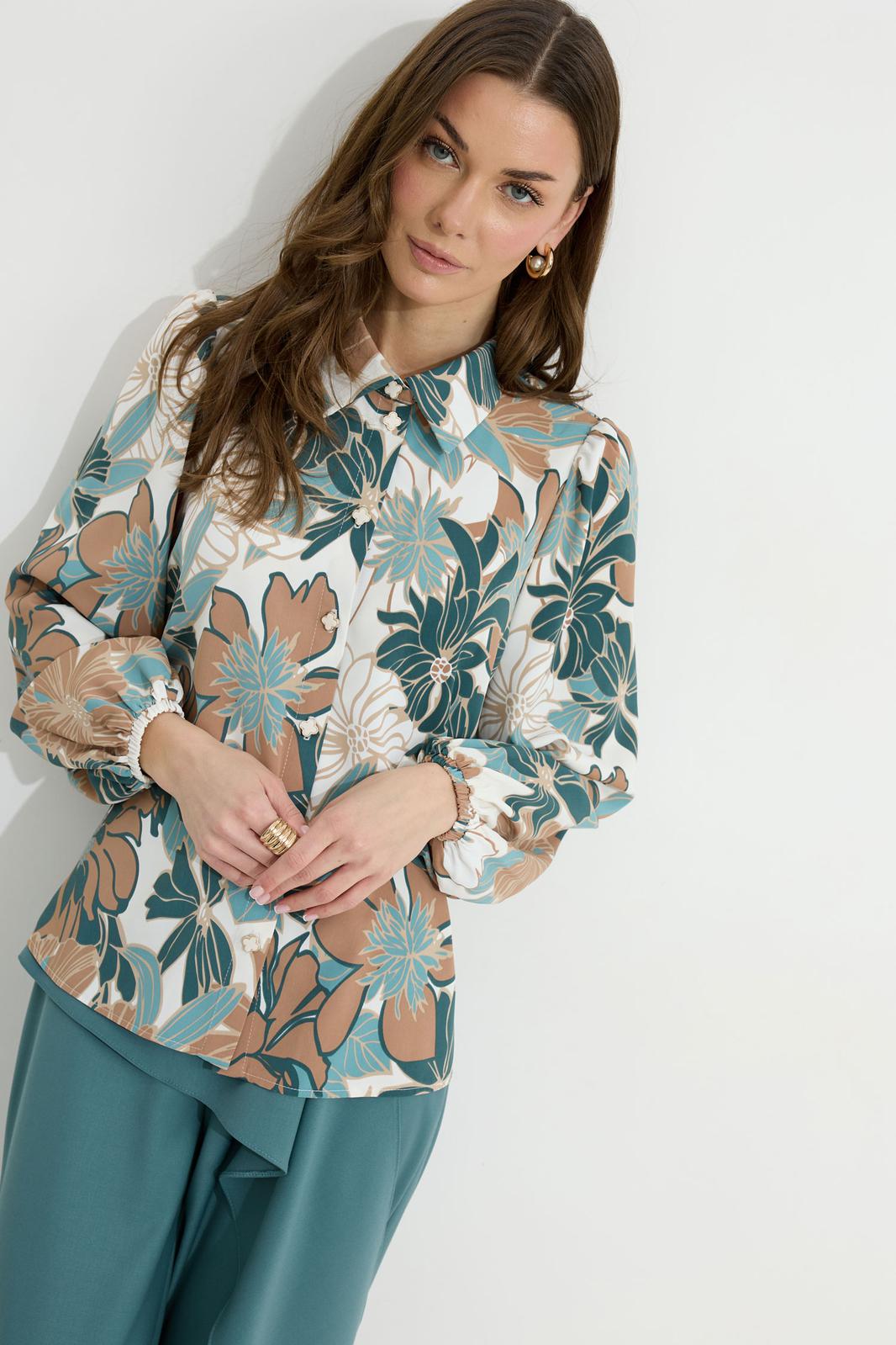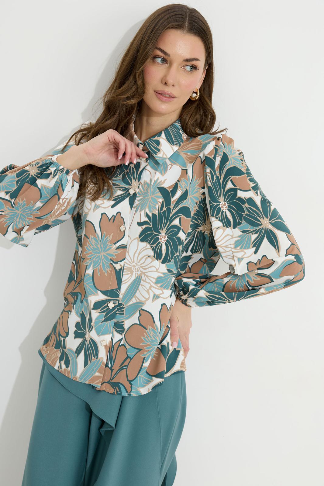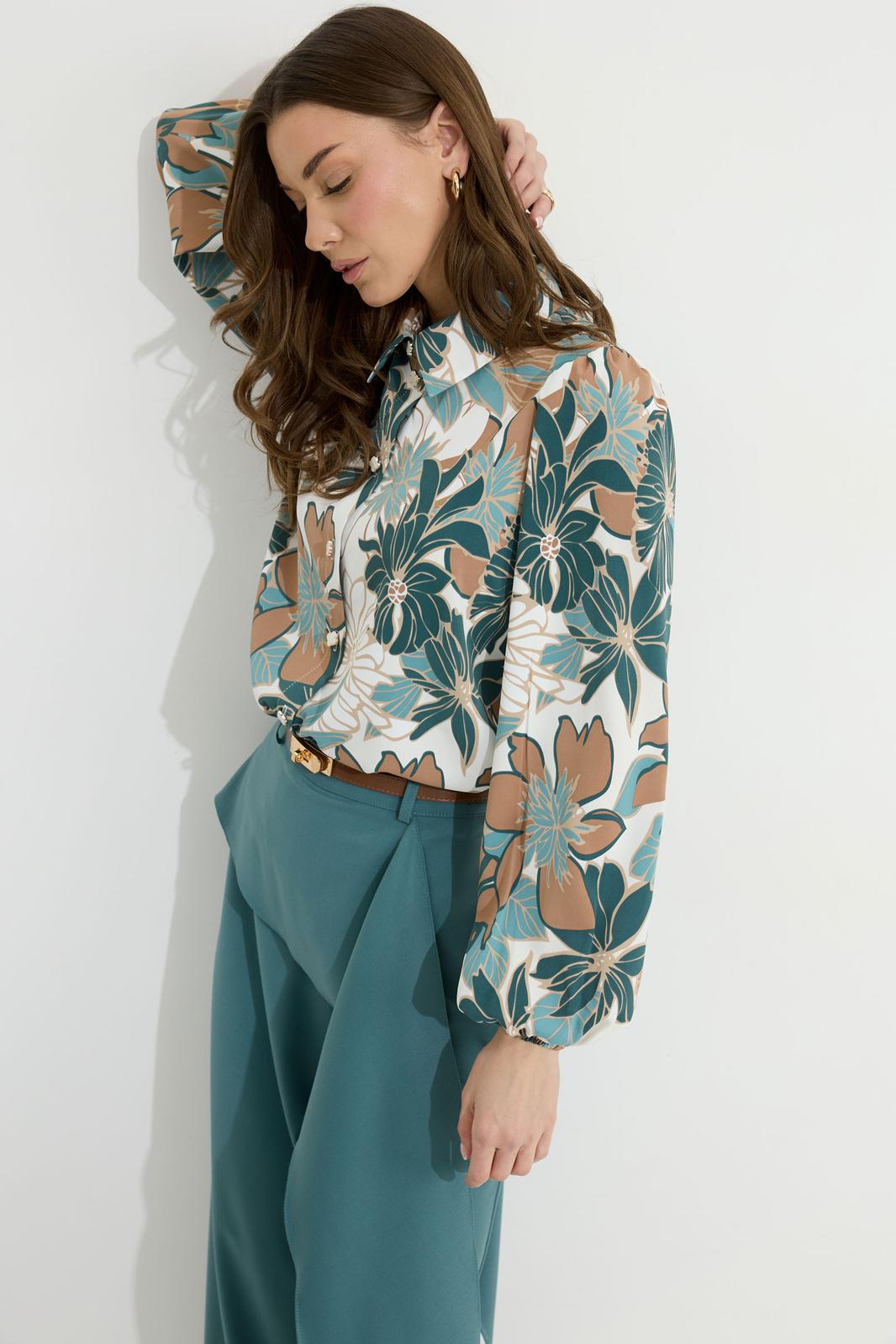 Блузка прямого силуэта из блузочной ткани с принтом. Воротник рубашечного типа с застежкой по центру на петли и пуговицы. Рукав втачной со сборкой по окату, по низу рукава резинка. По низу в боковых швах блузки разрезы. Обращаем ваше внимание, что фурнитура может отличаться от фото.