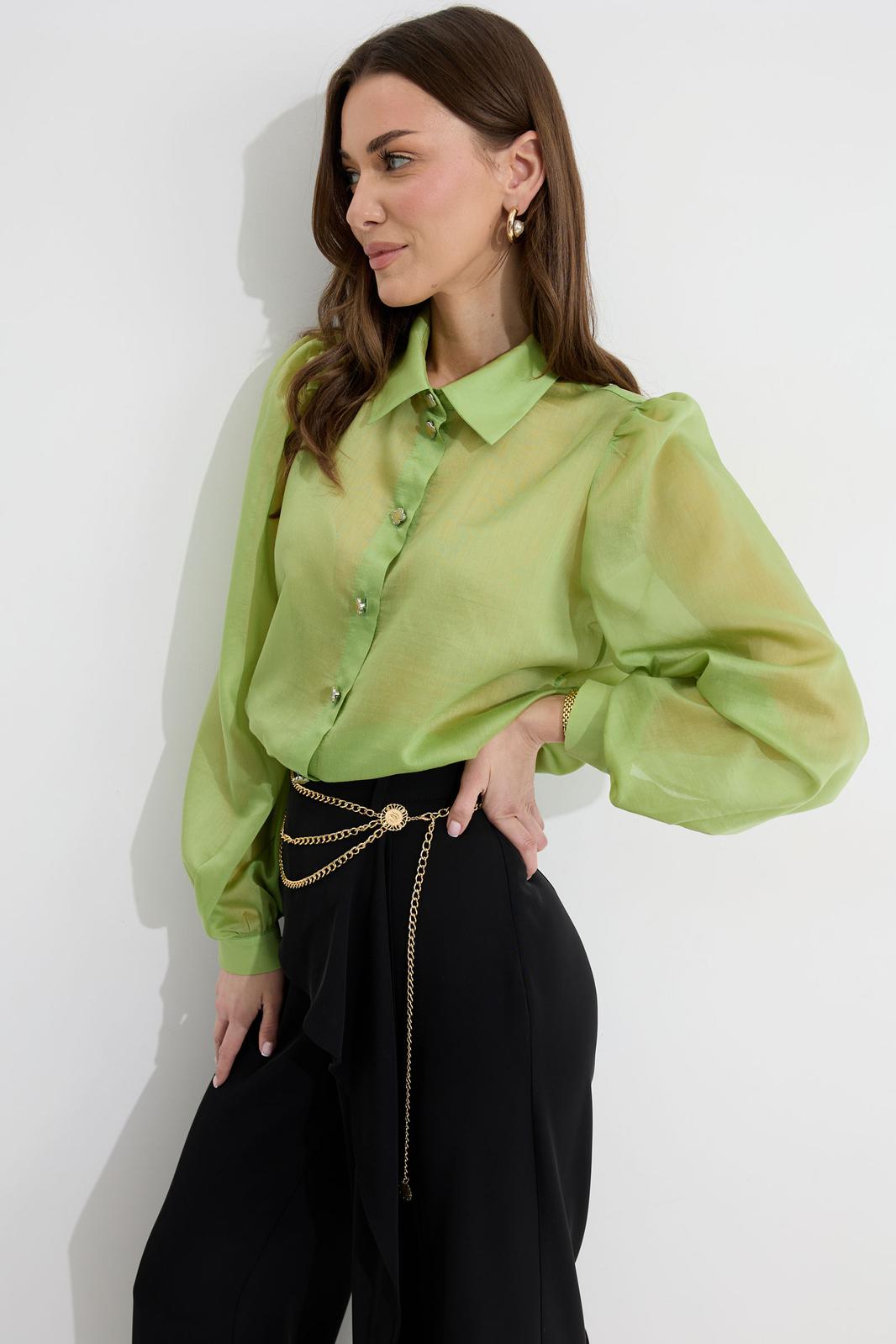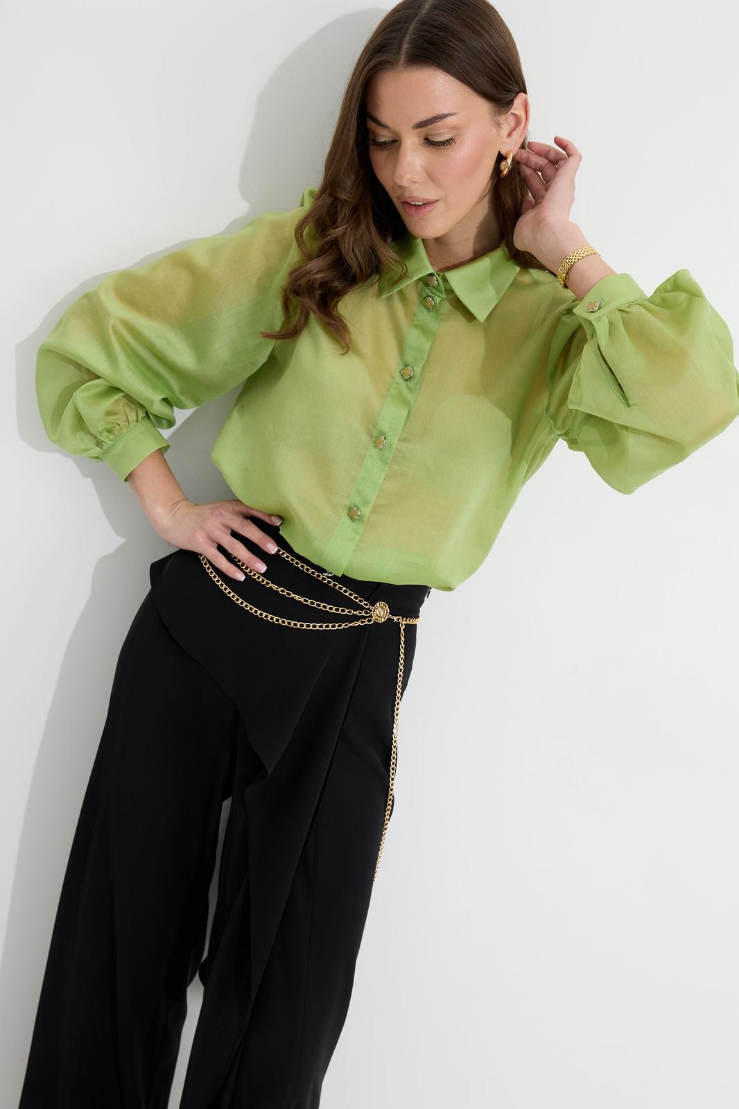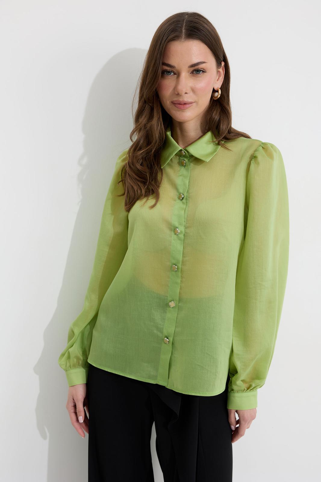 Блузка прямого силуэта из блузочной ткани. Воротник рубашечного типа с застежкой по центру на петли и пуговицы. Рукав со сборкой по окату, по низу манжета с застежкой на петли и пуговицы. По низу в боковых швах разрезы. Обращаем ваше внимание, что фурнитура может отличаться от фото.