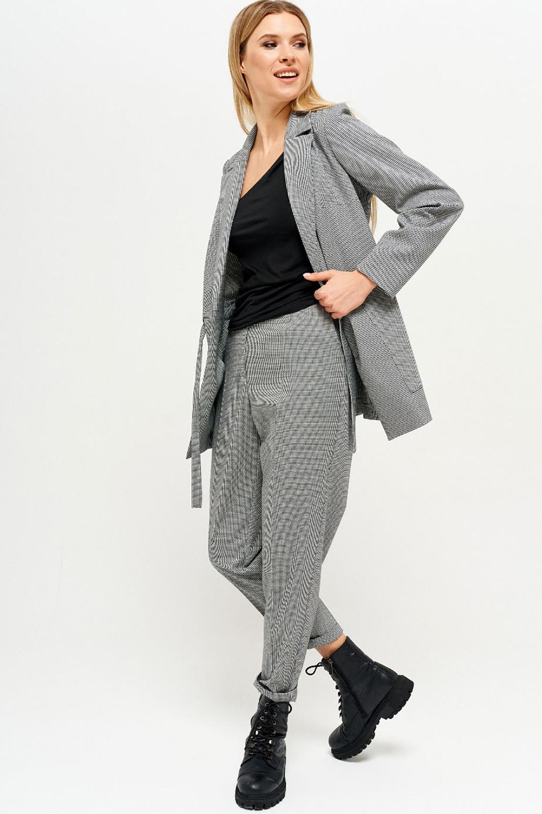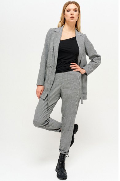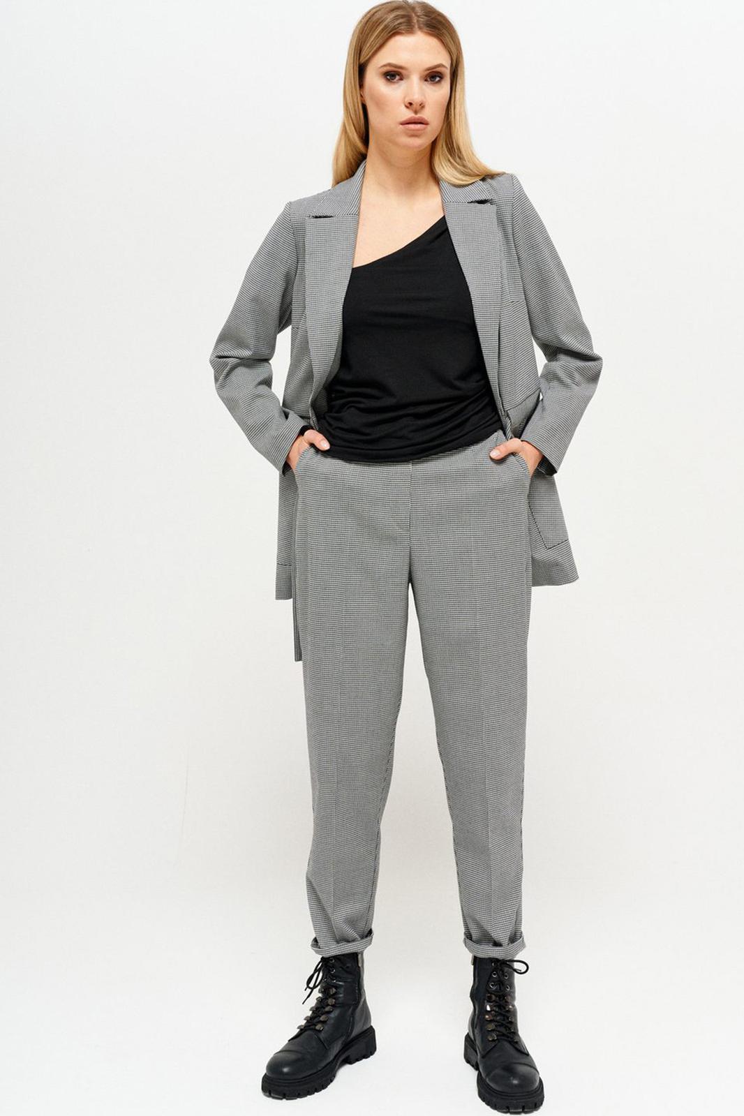 Удобные брюки с высокой талией, силуэта банан, зауженные книзу, на притачной обтачке со шлевками и застежкой на петли и пуговицы. Брюки с вытачками и стрелками по передней и задней половинках. По передней половинке обработаны наклонные карманы и застежка молния в среднем шве. В комплект входит пояс из основной ткани.