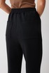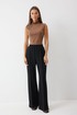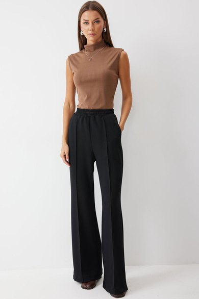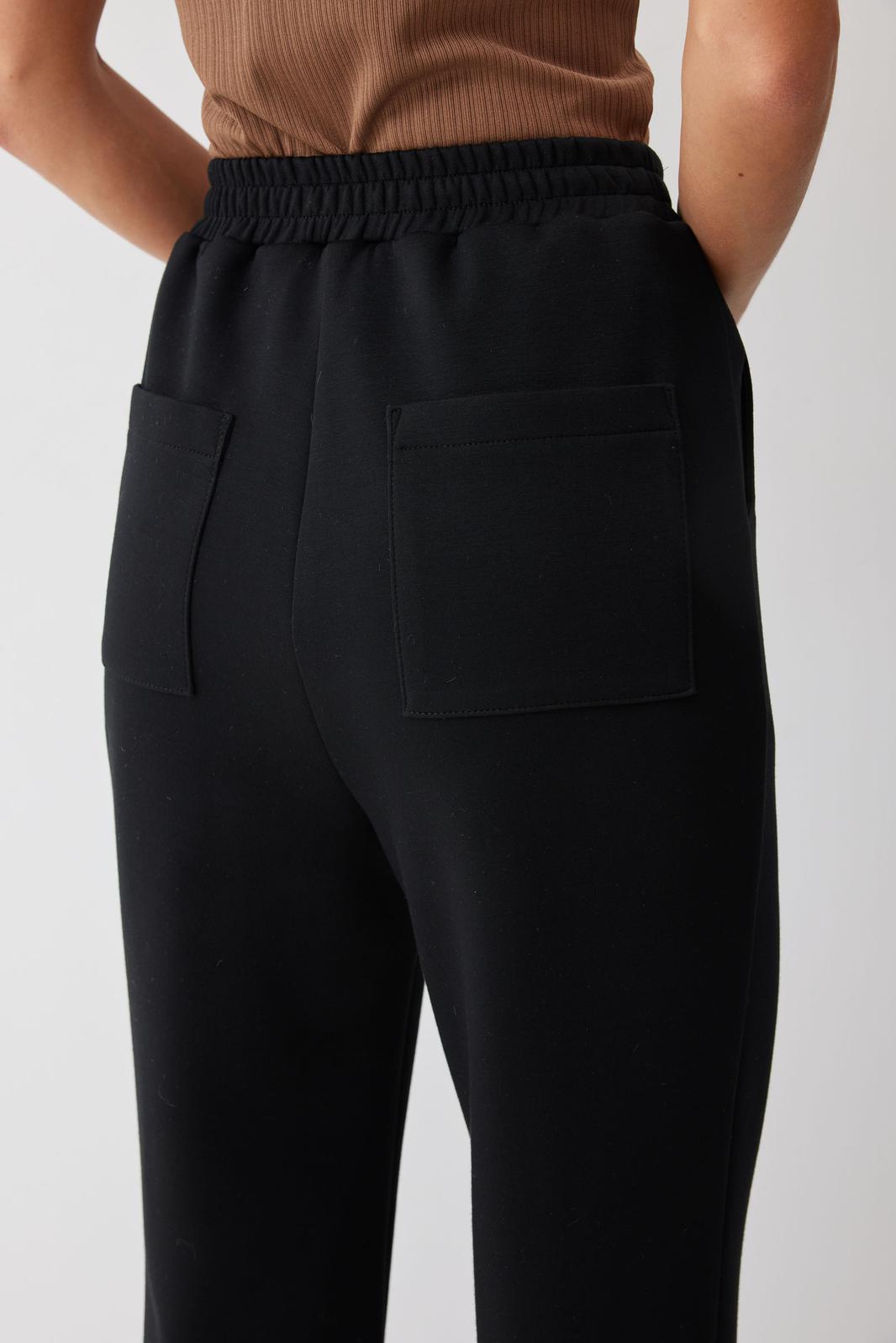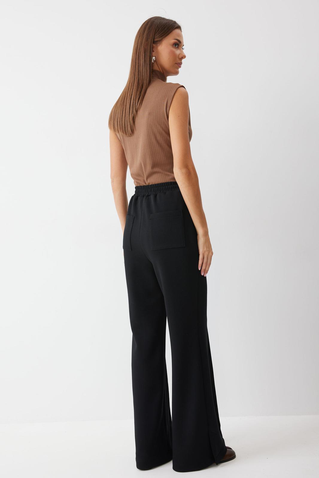 Брюки прямого силуэта из трикотажного полотна. По верху брюк притачной пояс на резинке. На передних половинках брюк обработаны карманы и защипы. На задних – карманы. По низу внешнего шва брюк шлицы.
