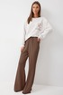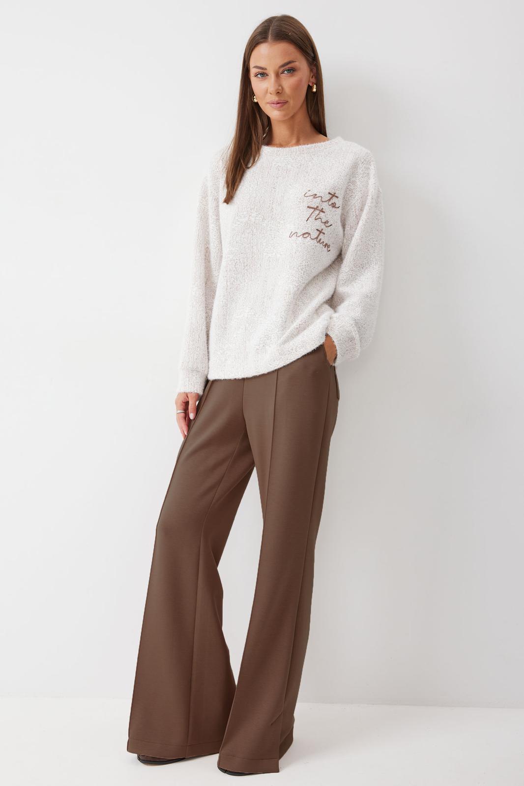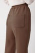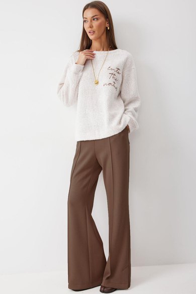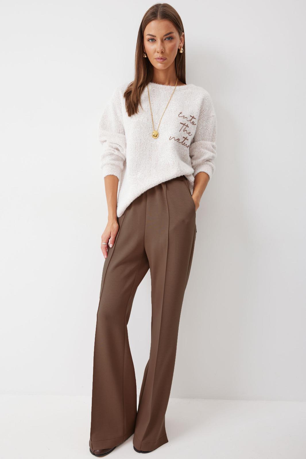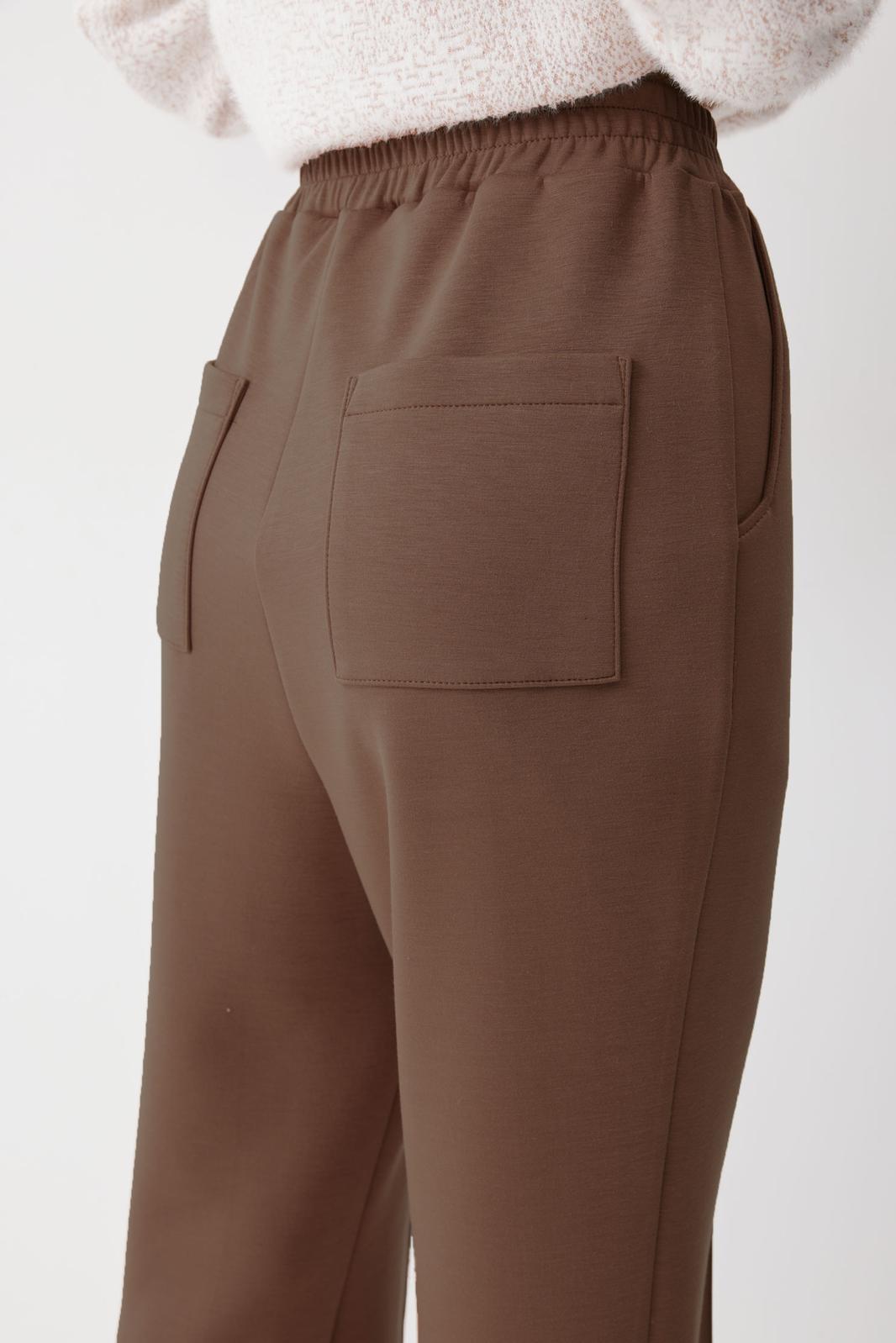 Брюки прямого силуэта из трикотажного полотна. По верху брюк притачной пояс на резинке. На передних половинках брюк обработаны карманы и защипы. На задних – карманы. По низу внешнего шва брюк шлицы.