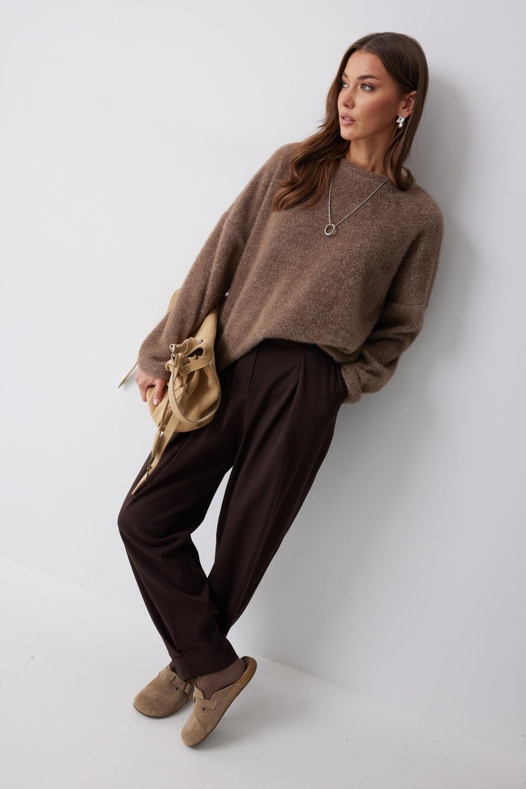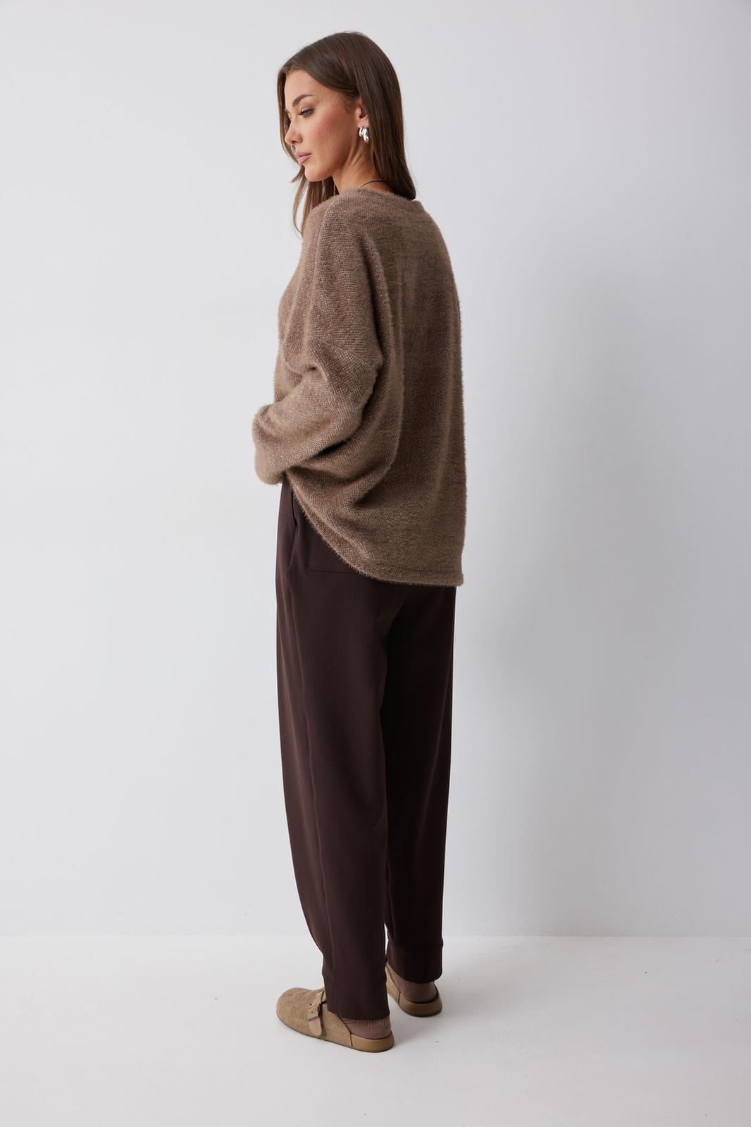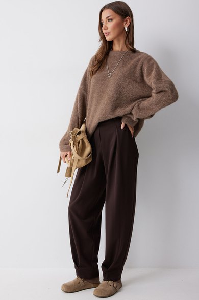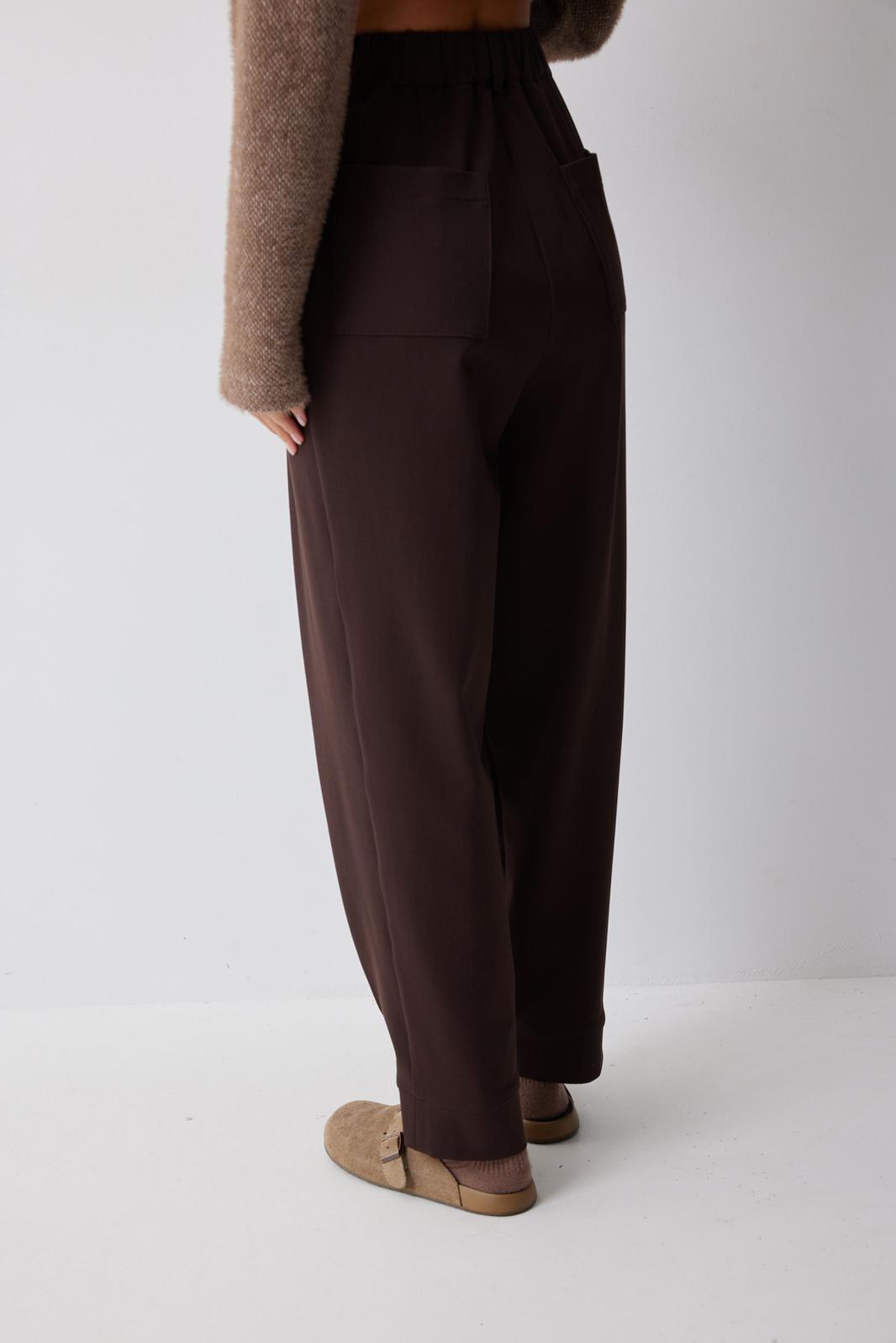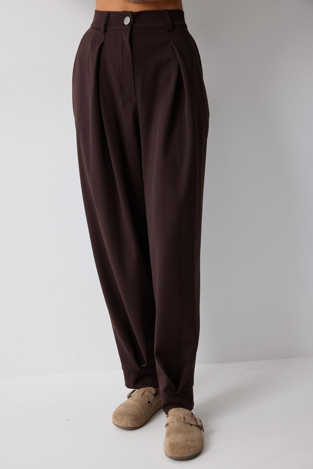 Брюки из костюмной ткани, зауженные книзу. По верху брюк притачной пояс с застежкой на петлю и пуговицу и шлевками для ремня. По поясу задних половинок брюк резинка. На передних половинках обработаны боковые карманы и застежка молния в среднем шве. По верху и низу брюк расположены встречные складки. По низу брюк – манжеты. На задних половинках накладные карманы.