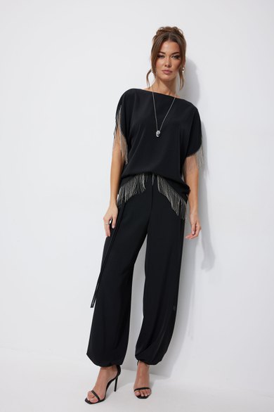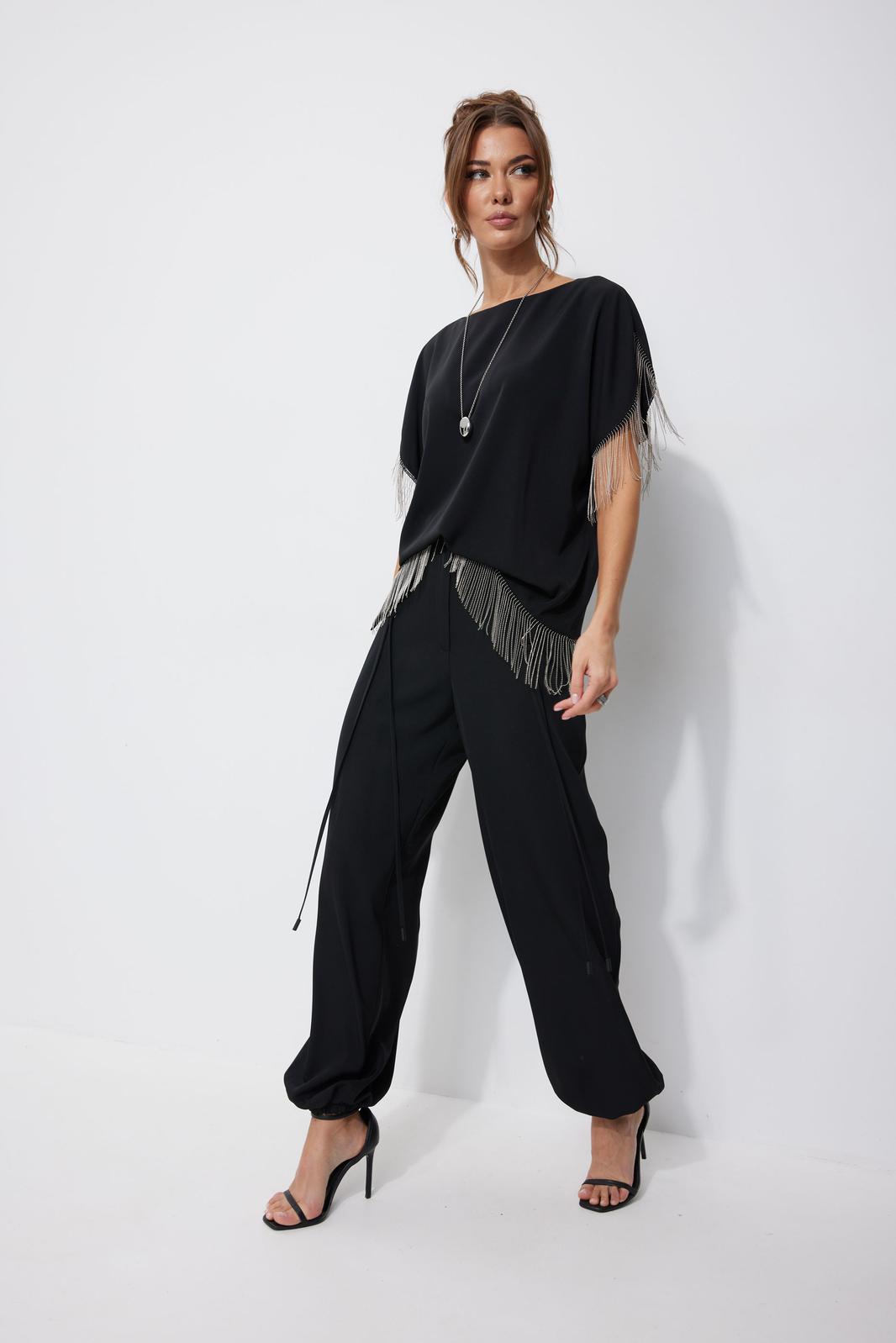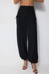 Брюки свободного силуэта из струящейся ткани. По верху брюк притачной пояс с застежкой на петлю и пуговицу. На передних половинках обработана застежка молния в среднем шве. На передних половинках декоративные клапаны. По поясу задних половинок брюк резинка и вытачки. Обращаем ваше внимание, что фурнитура может отличаться от фото.