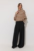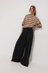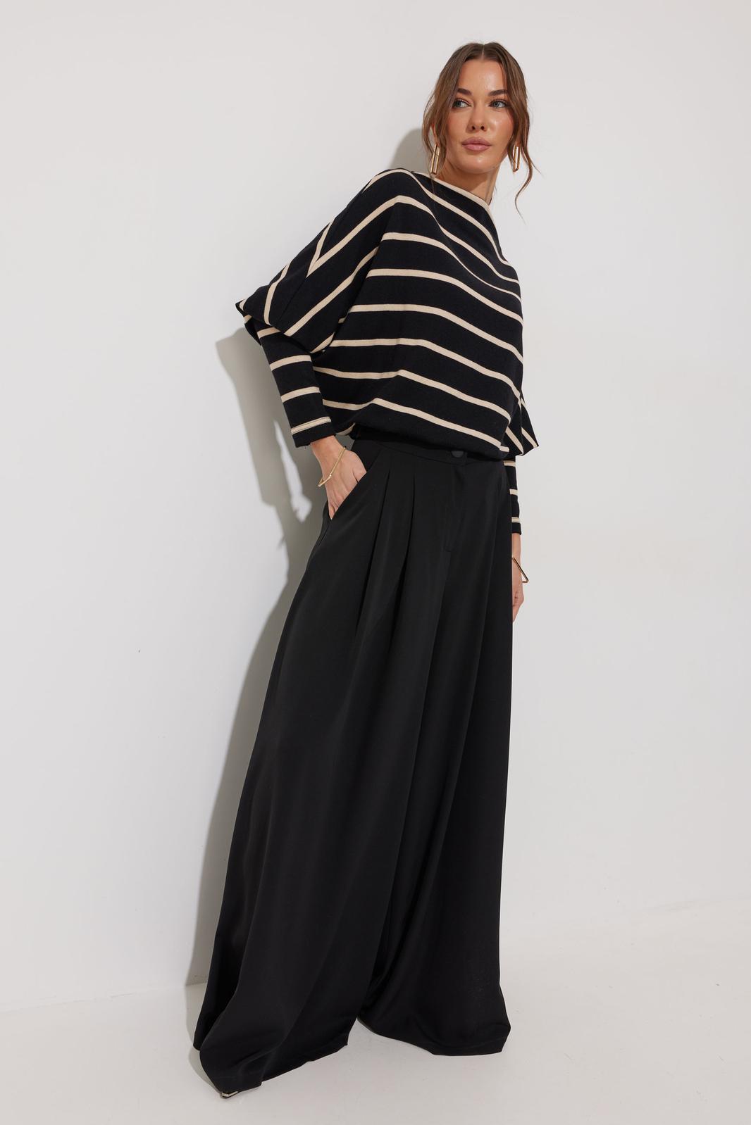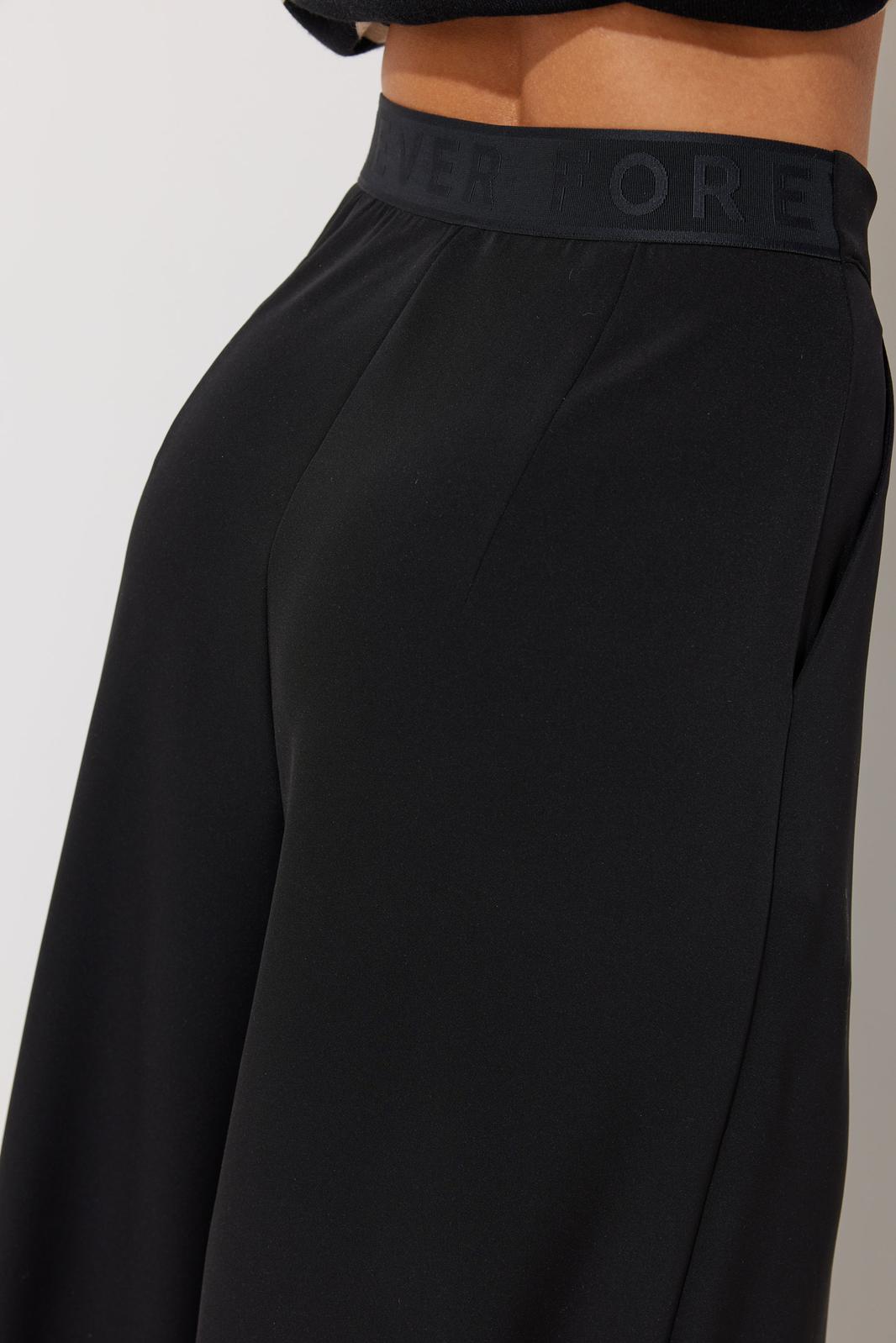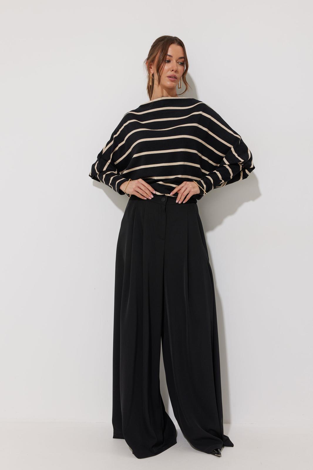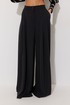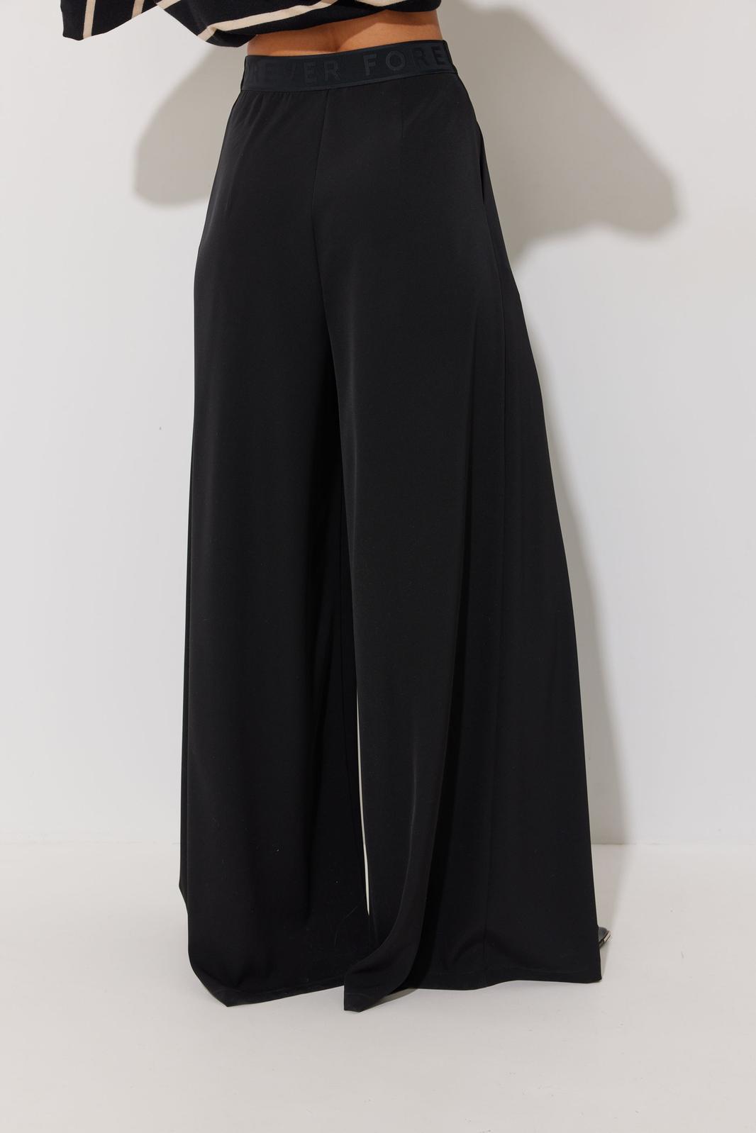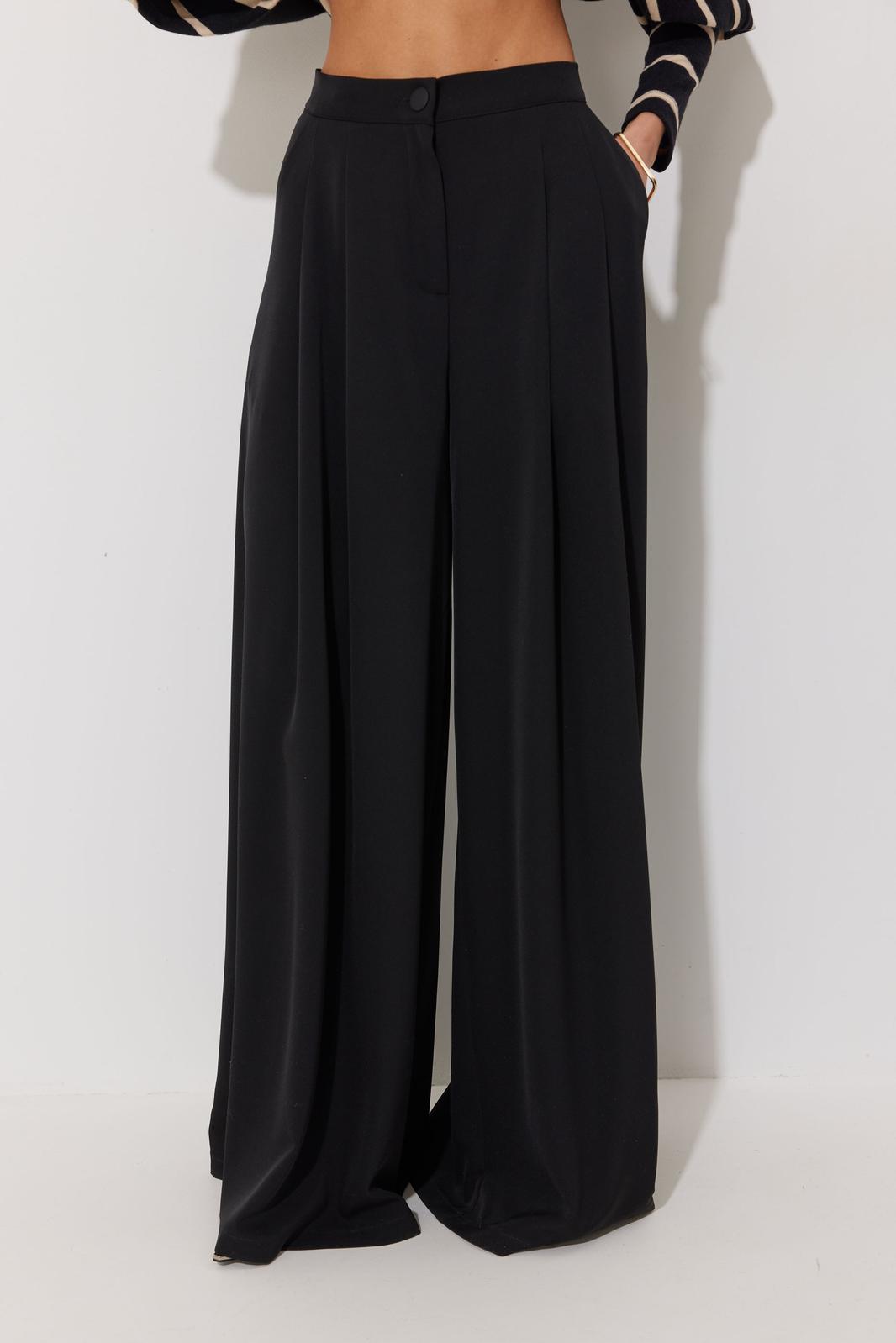 Брюки прямого силуэта расширенные книзу из струящейся ткани. По верху притачной пояс с застежкой на петлю и пуговицу. По переду декоративные складки и карманы. На передних половинках обработана застежка молния в среднем шве. На спинке декоративная резинка-тесьма. Обращаем ваше внимание, что фурнитура может отличаться от фото.