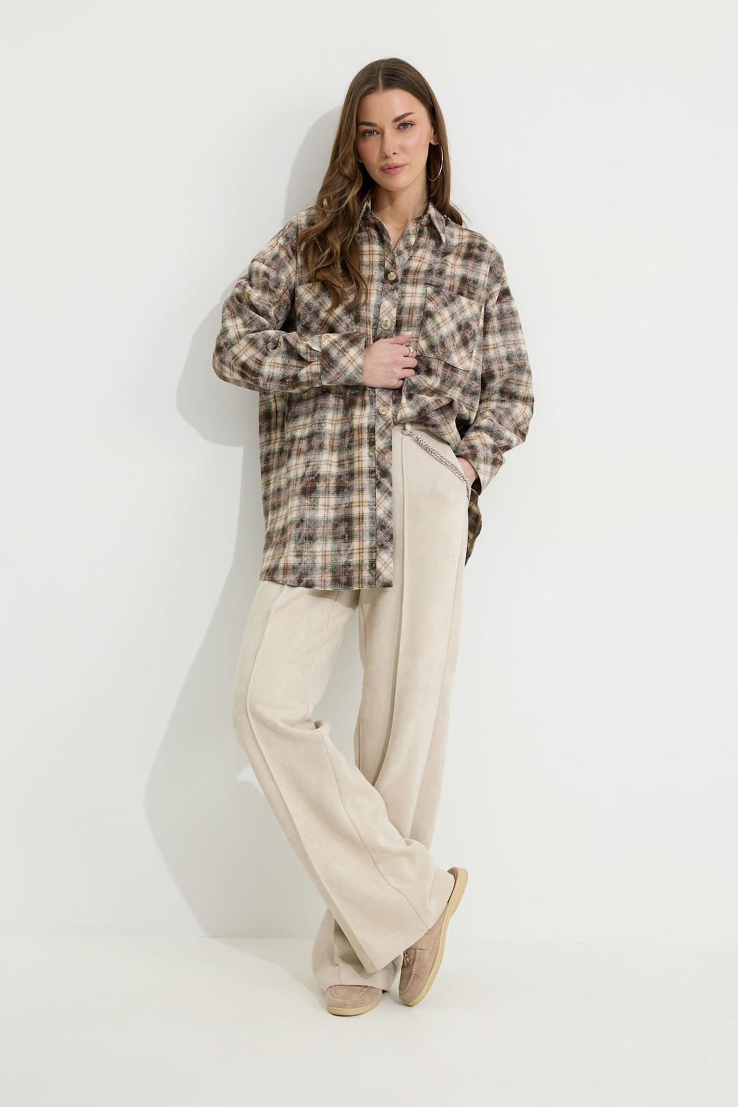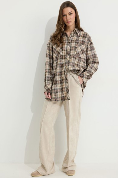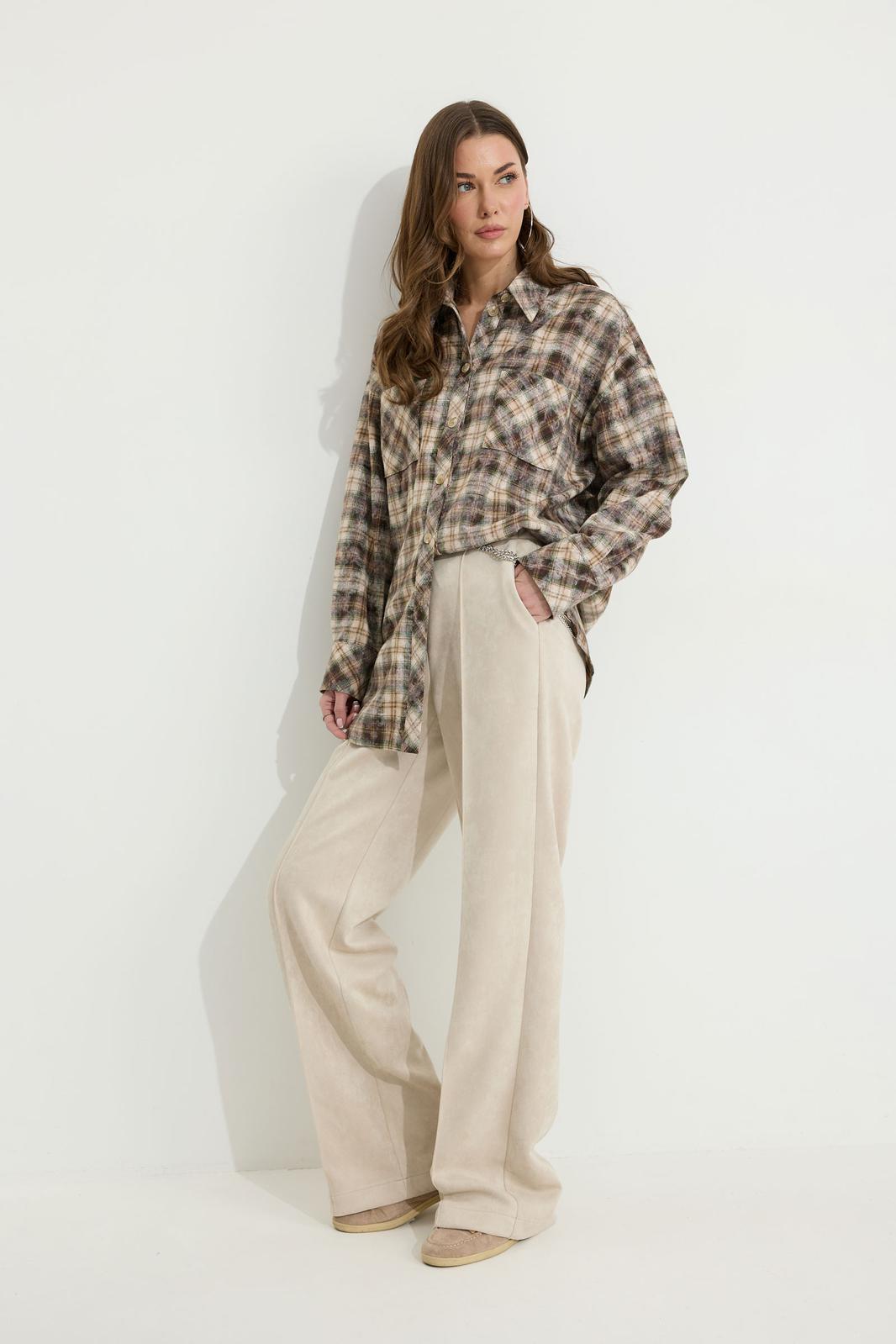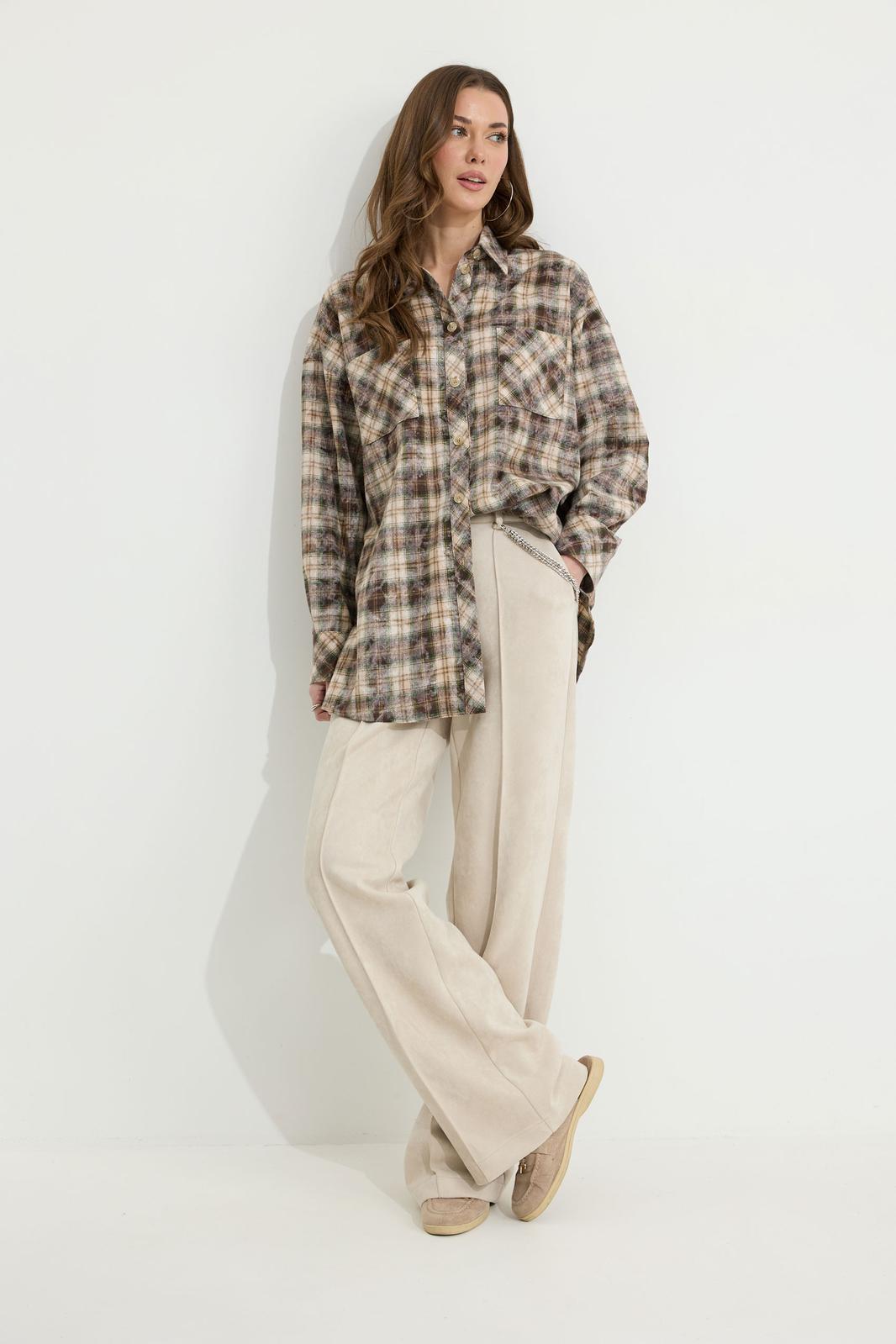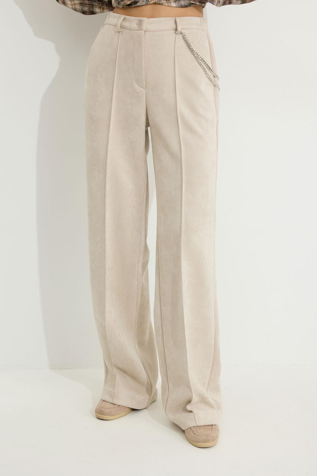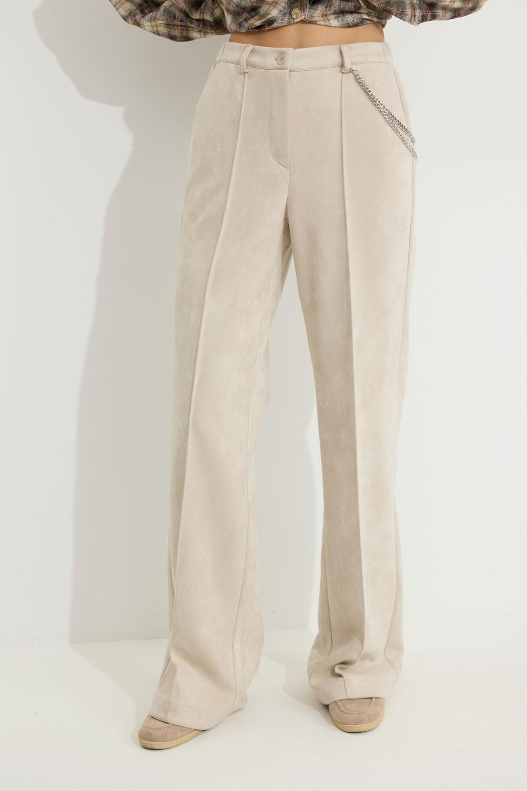 Брюки прямого силуэта из трикотажного полотна “замша”. По верху притачной пояс с застежкой на петлю и пуговицу и шлевками для ремня. На передних половинках обработаны карманы, канты и застежка молния в среднем шве, на задних – вытачки. По поясу задних половинок брюк эластичная тесьма (резинка). Обращаем ваше внимание, что фурнитура может отличаться от фото. Декоративный элемент - цепочка в комплектацию не входит.