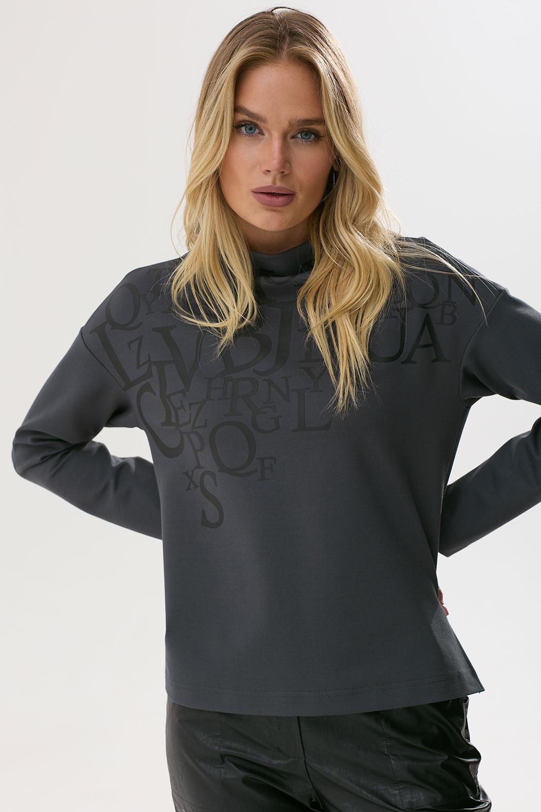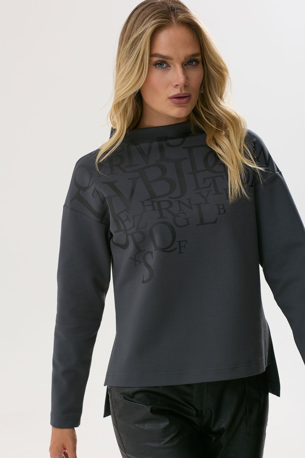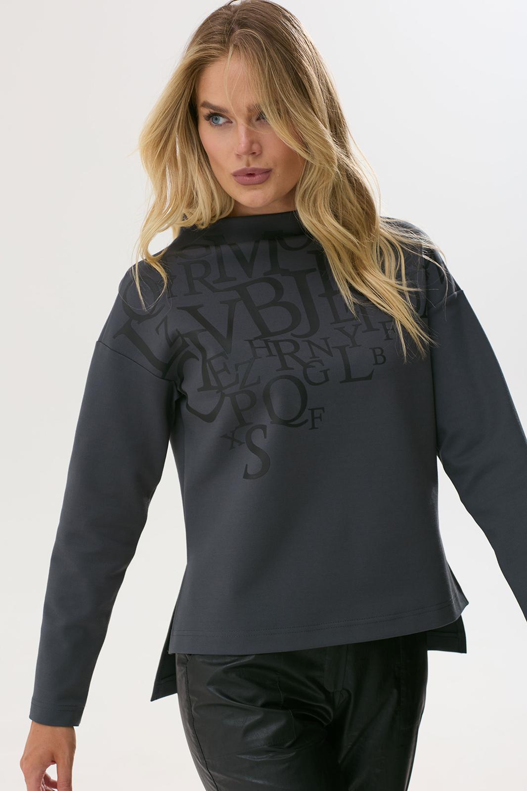 Стильный джемпер прямого силуэта из трикотажного полотна с удлиненной спинкой. Горловина- стойка цельнокроенная. Рукав со спущенной линией плеча длиной 7/8. В боковых швах декоративные разрезы. По переду дизайнерская печать.
