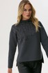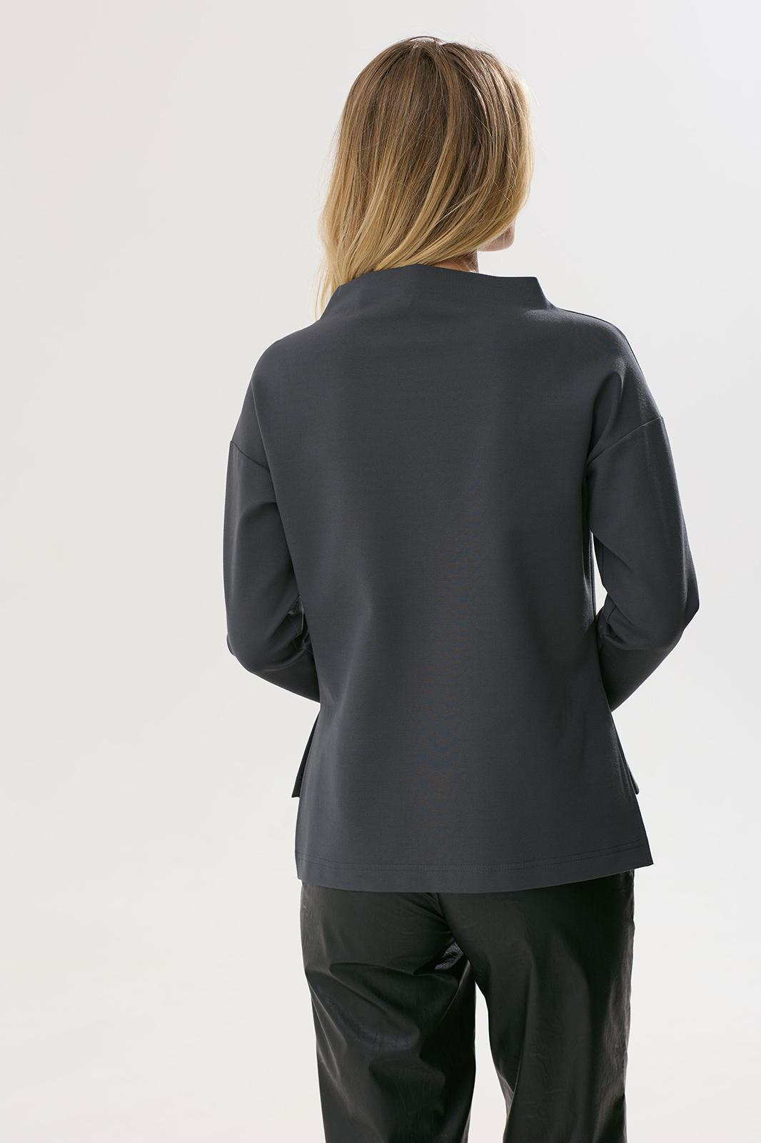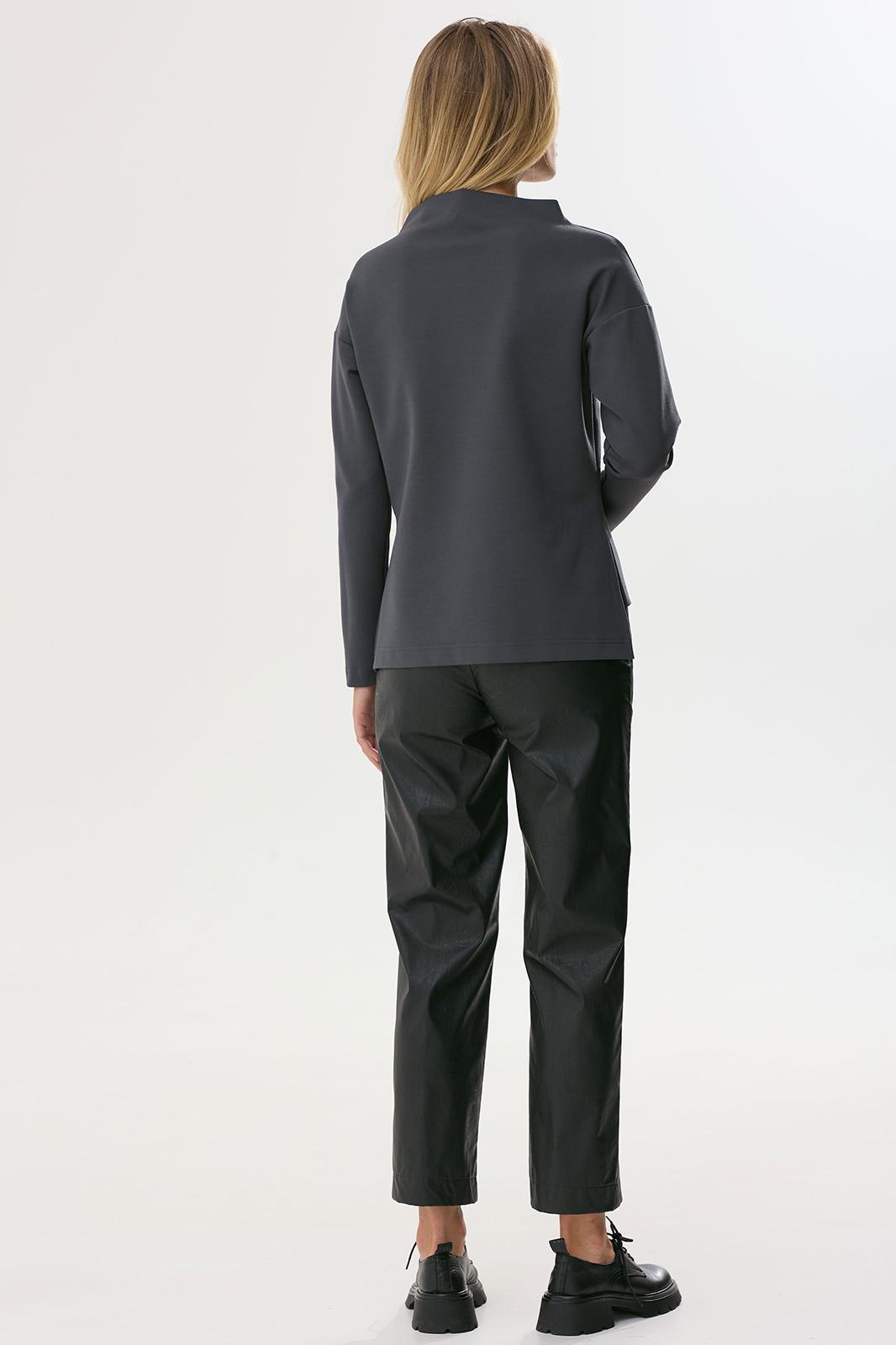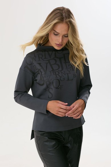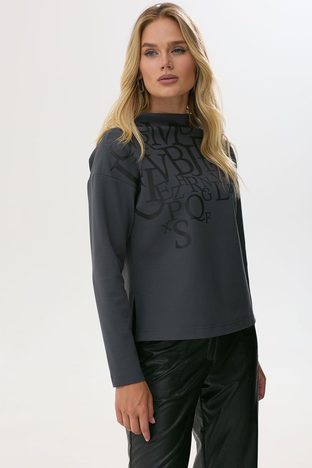 Стильный джемпер прямого силуэта из трикотажного полотна с удлиненной спинкой. Горловина- стойка цельнокроенная. Рукав со спущенной линией плеча длиной 7/8. В боковых швах декоративные разрезы. По переду дизайнерская печать.