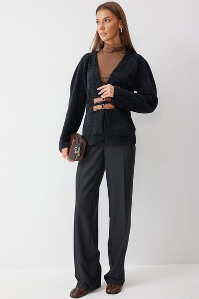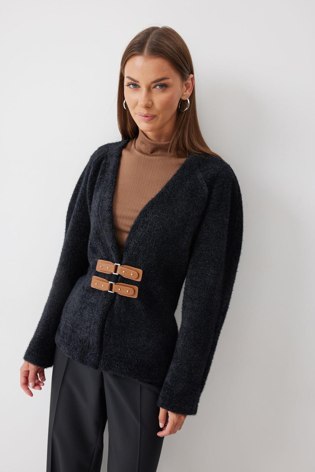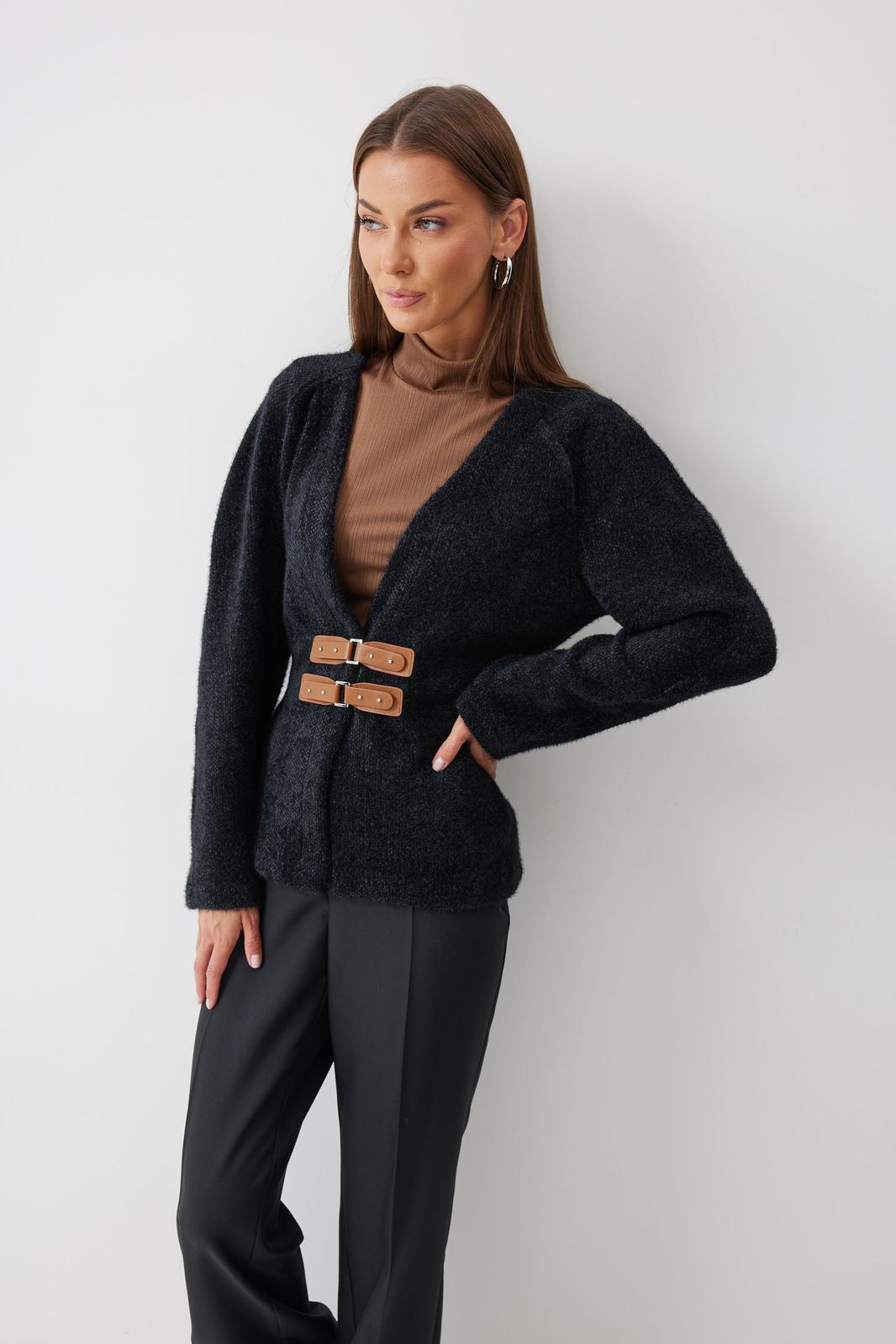 Джемпер полуприлегающего силуэта из трикотажного пушистого полотна. V-образная горловина, рукав реглан. По переду джемпера расположены пряжки. На спинке расположены вытачки, для придания силуэта. Обращаем ваше внимание, что фурнитура может незначительно отличаться от фото