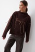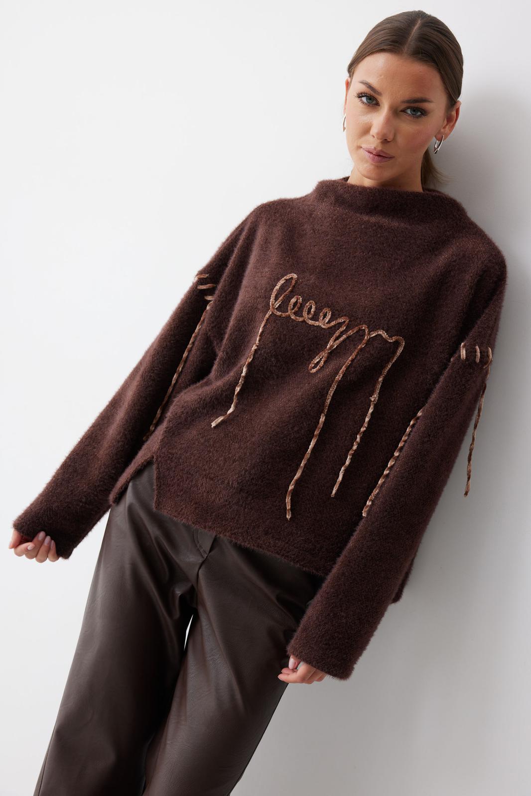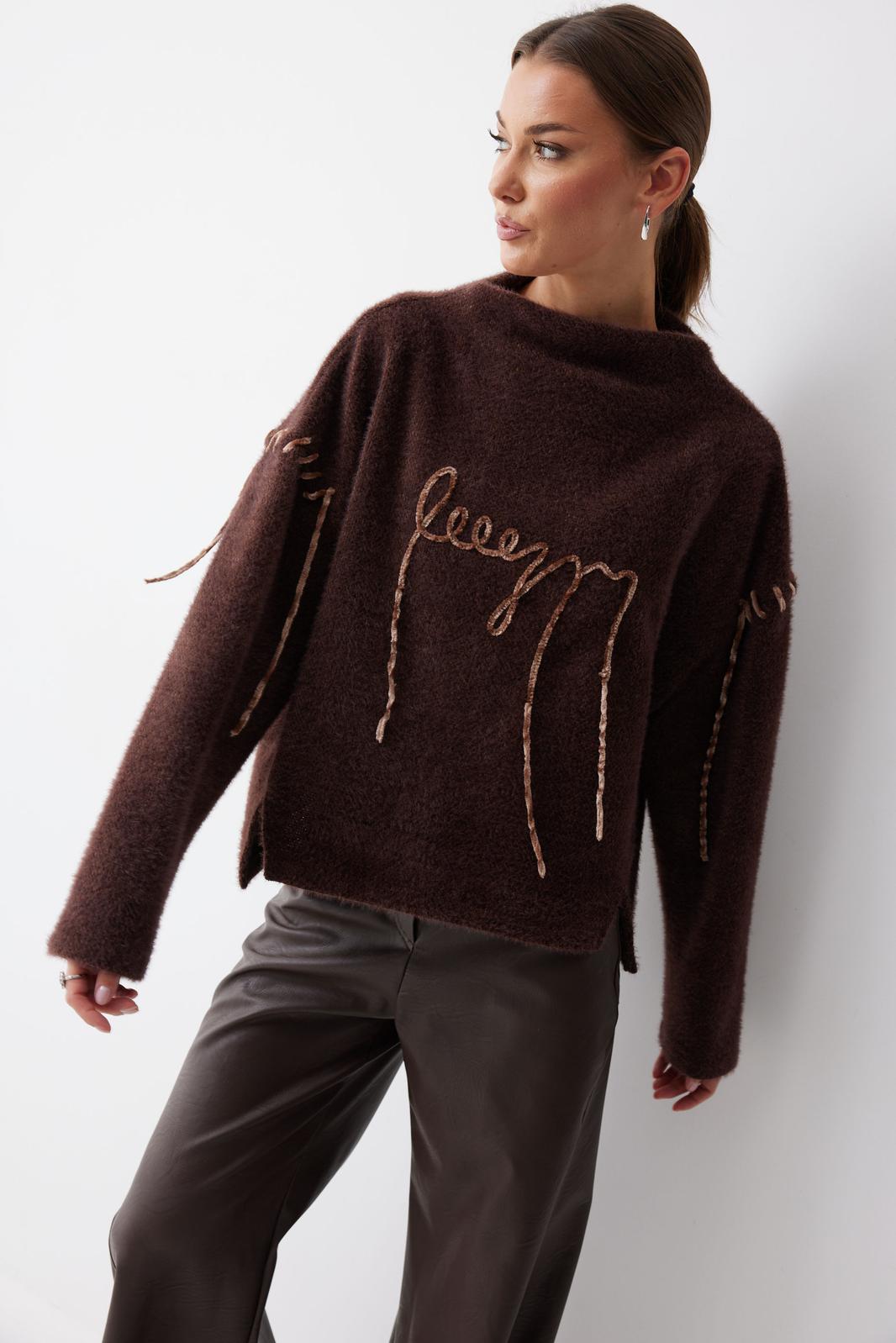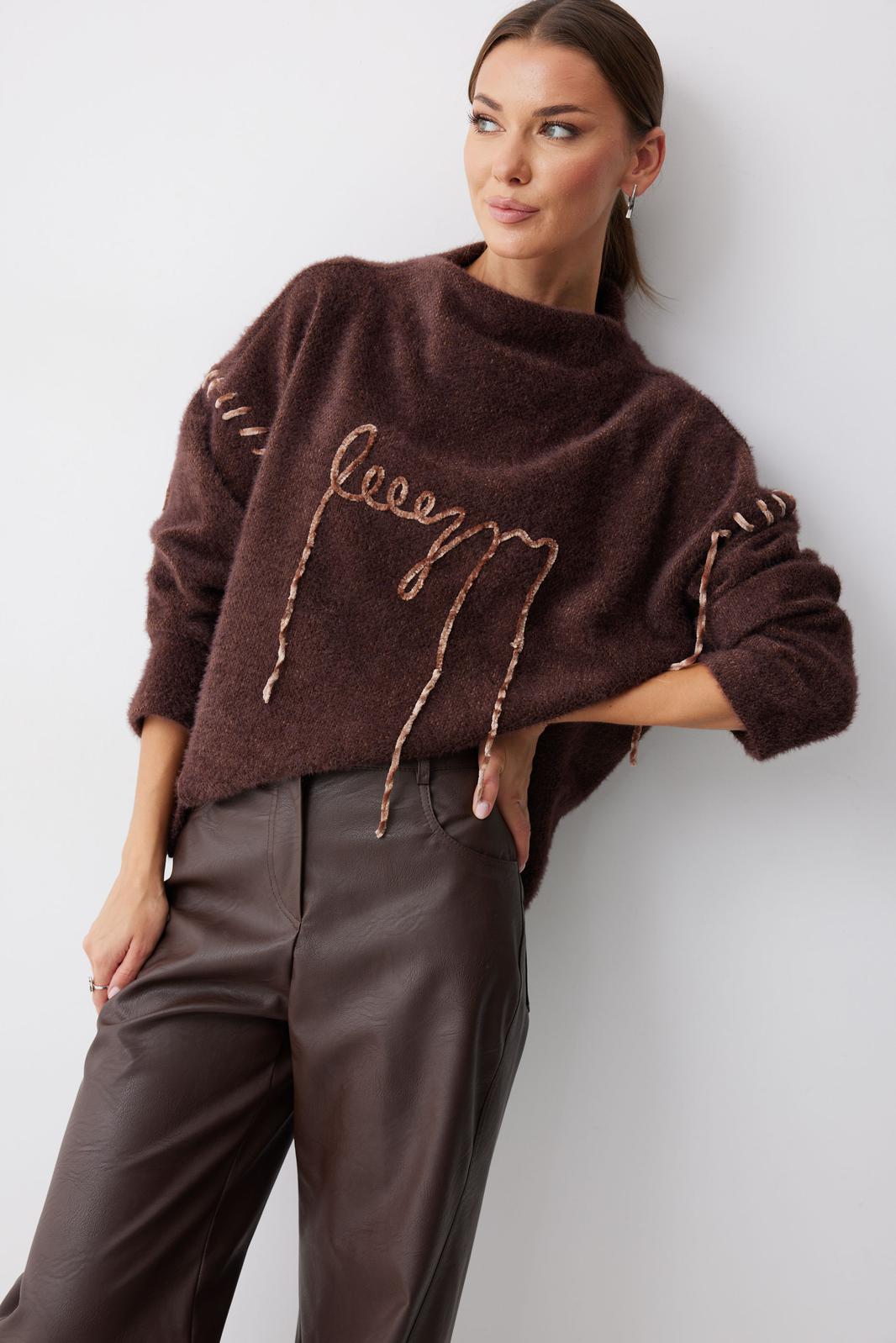 Джемпер прямого силуэта из трикотажного полотна с фигурным низом. Горловина цельнокроеная стойка. Рукав со спущенной линией плеча, удлиненный. Джемпер со смещенным боковым швом. По переду джемпера дизайнерская вышивка.