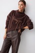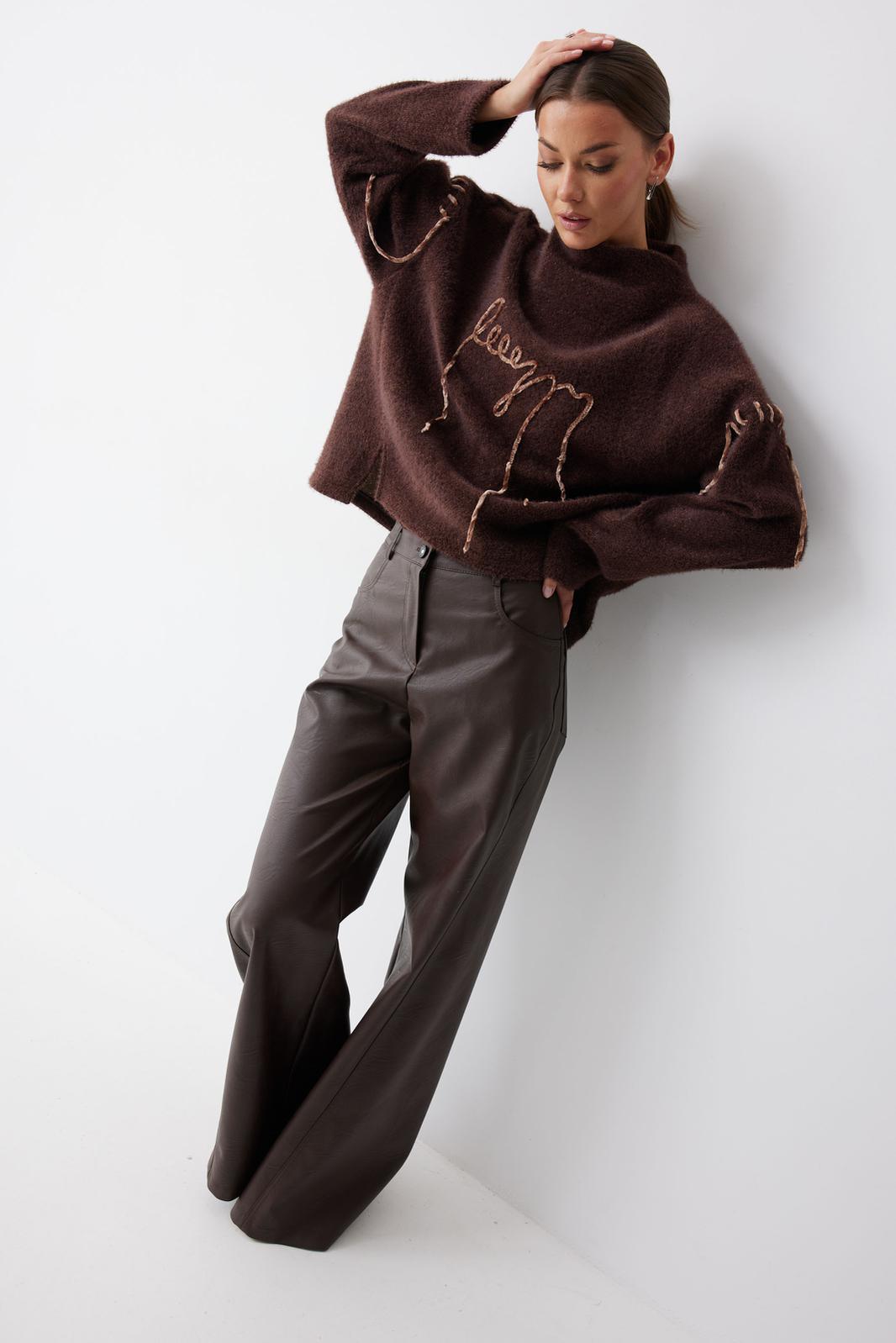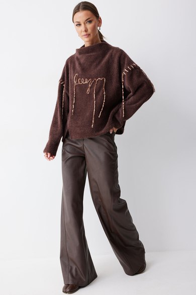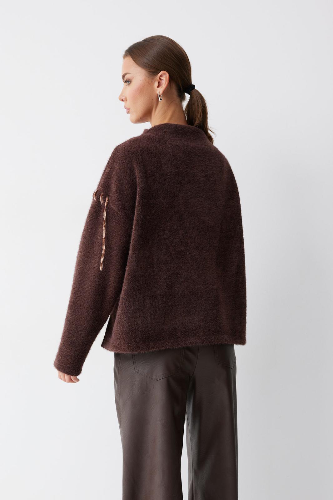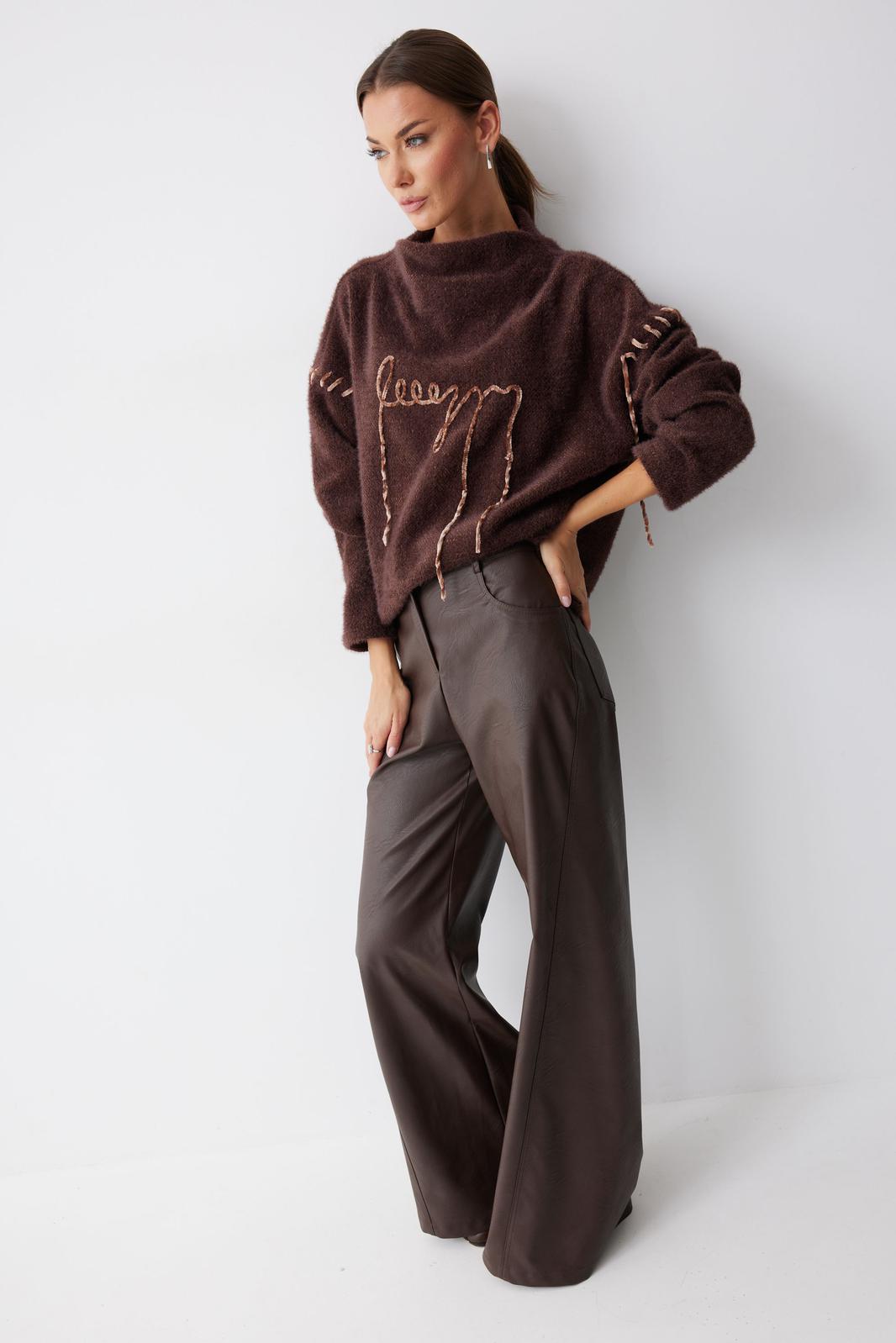 Джемпер прямого силуэта из трикотажного полотна с фигурным низом. Горловина цельнокроеная стойка. Рукав со спущенной линией плеча, удлиненный. Джемпер со смещенным боковым швом. По переду джемпера дизайнерская вышивка.