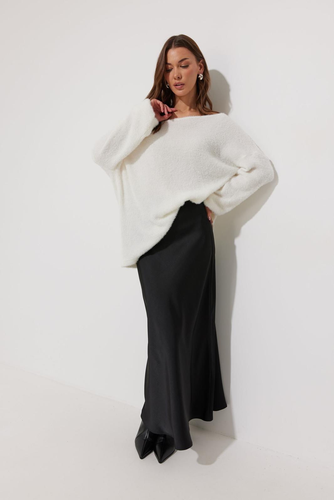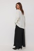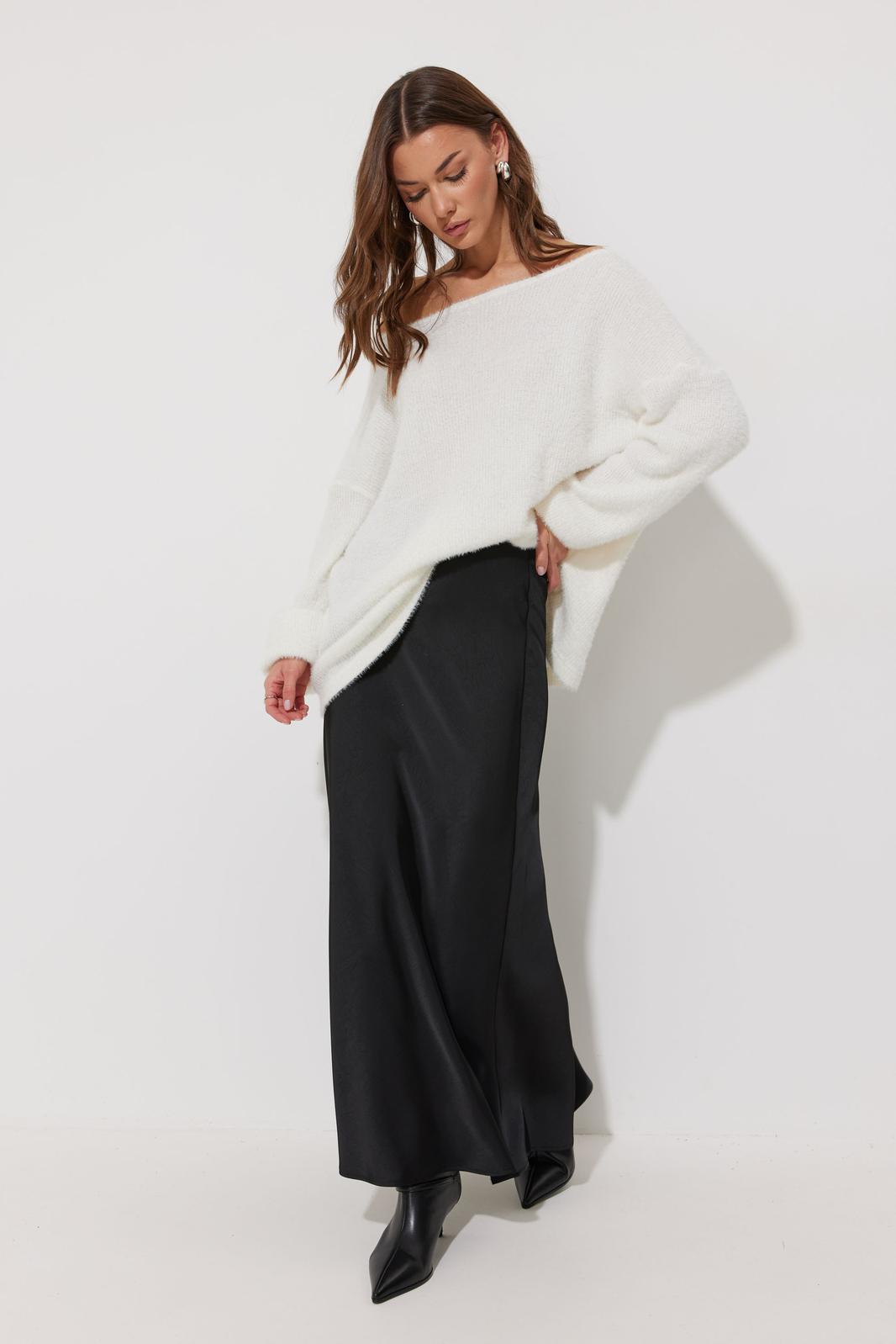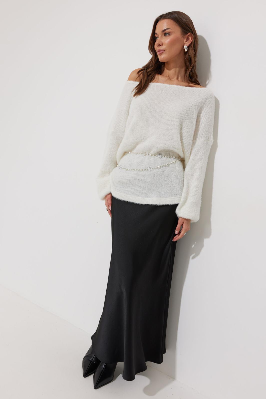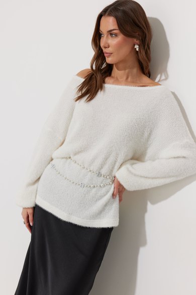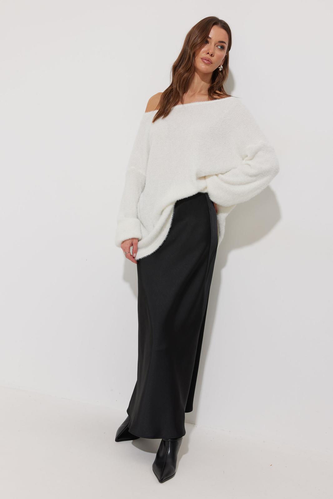 Джемпер прямого силуэта из трикотажного полотна. Горловина-лодочка. Рукав со спущенной линией плеча длинный, по низу резинка.