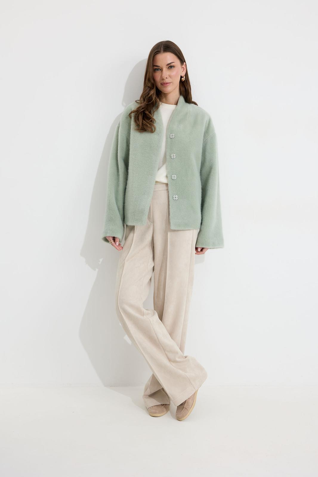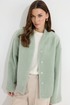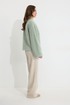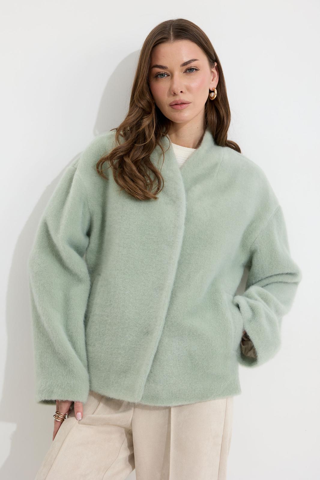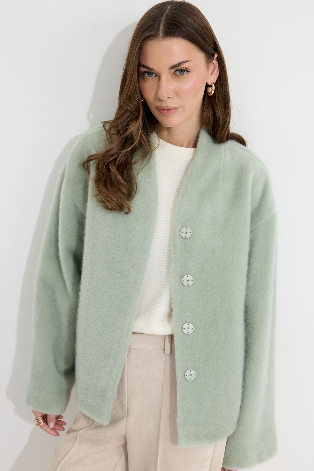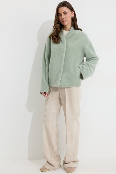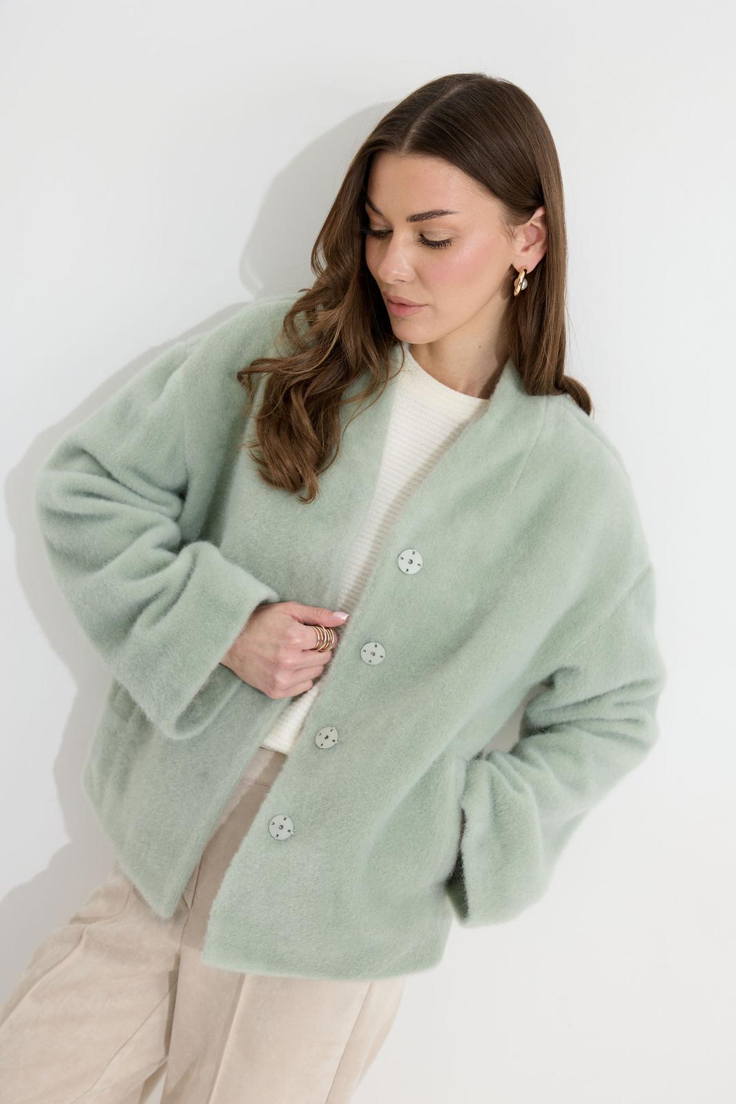 Жакет прямого силуэта из трикотажного полотна. Горловина цельнокроеная стойка по центру застежка на кнопки. Рукав со спущенной линией плеча, расширенный к низу. По переду карманы с листочками. Жакет на подкладке. Обращаем ваше внимание, что фурнитура может отличаться от фото.