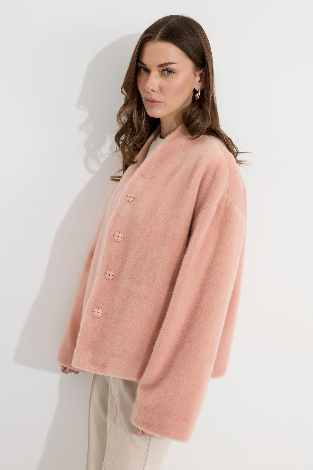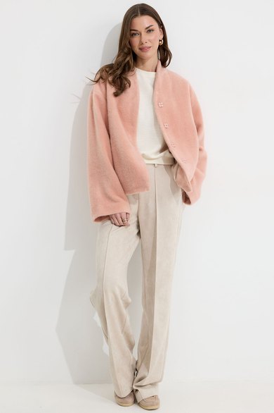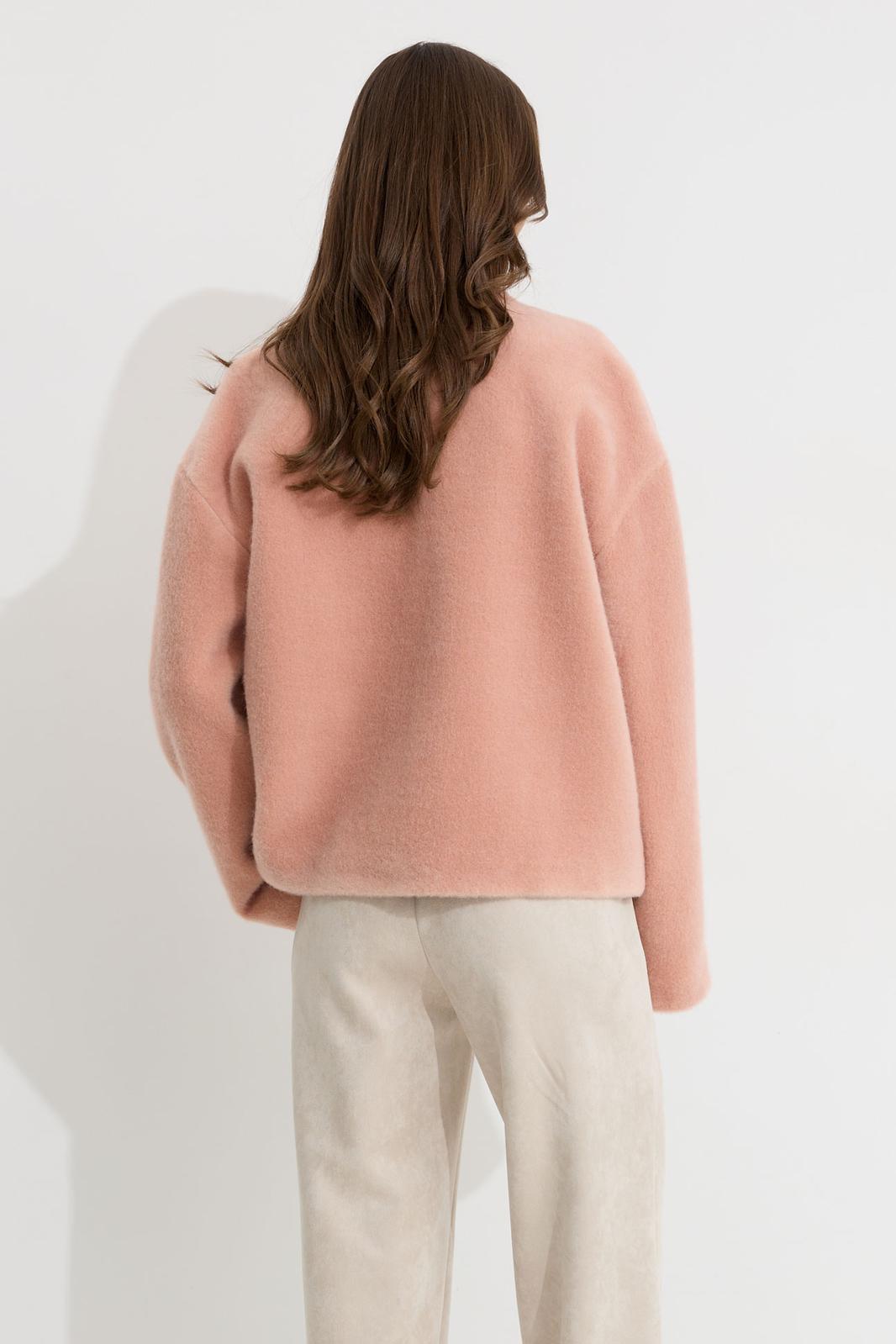 Жакет прямого силуэта из трикотажного полотна. Горловина цельнокроеная стойка по центру застежка на кнопки. Рукав со спущенной линией плеча, расширенный к низу. По переду карманы с листочками. Жакет на подкладке. Обращаем ваше внимание, что фурнитура может отличаться от фото.