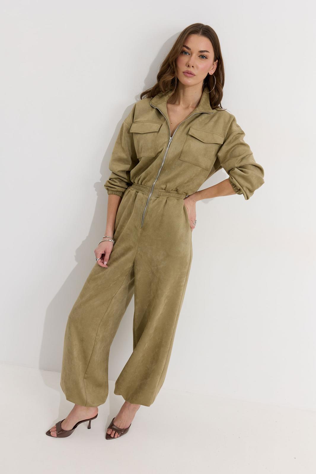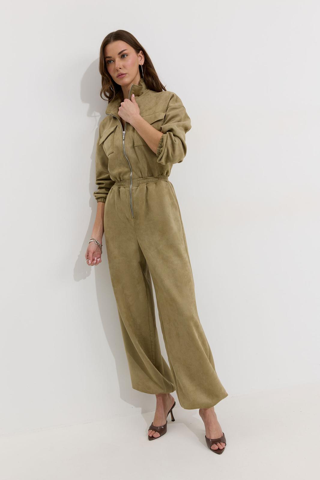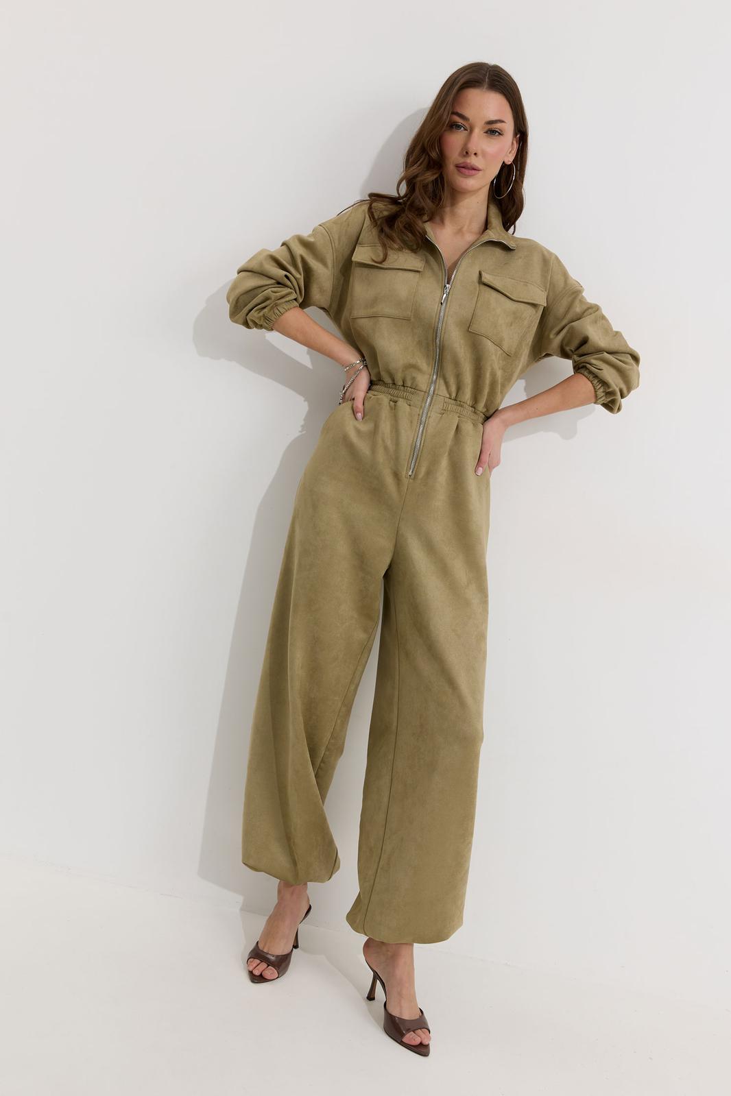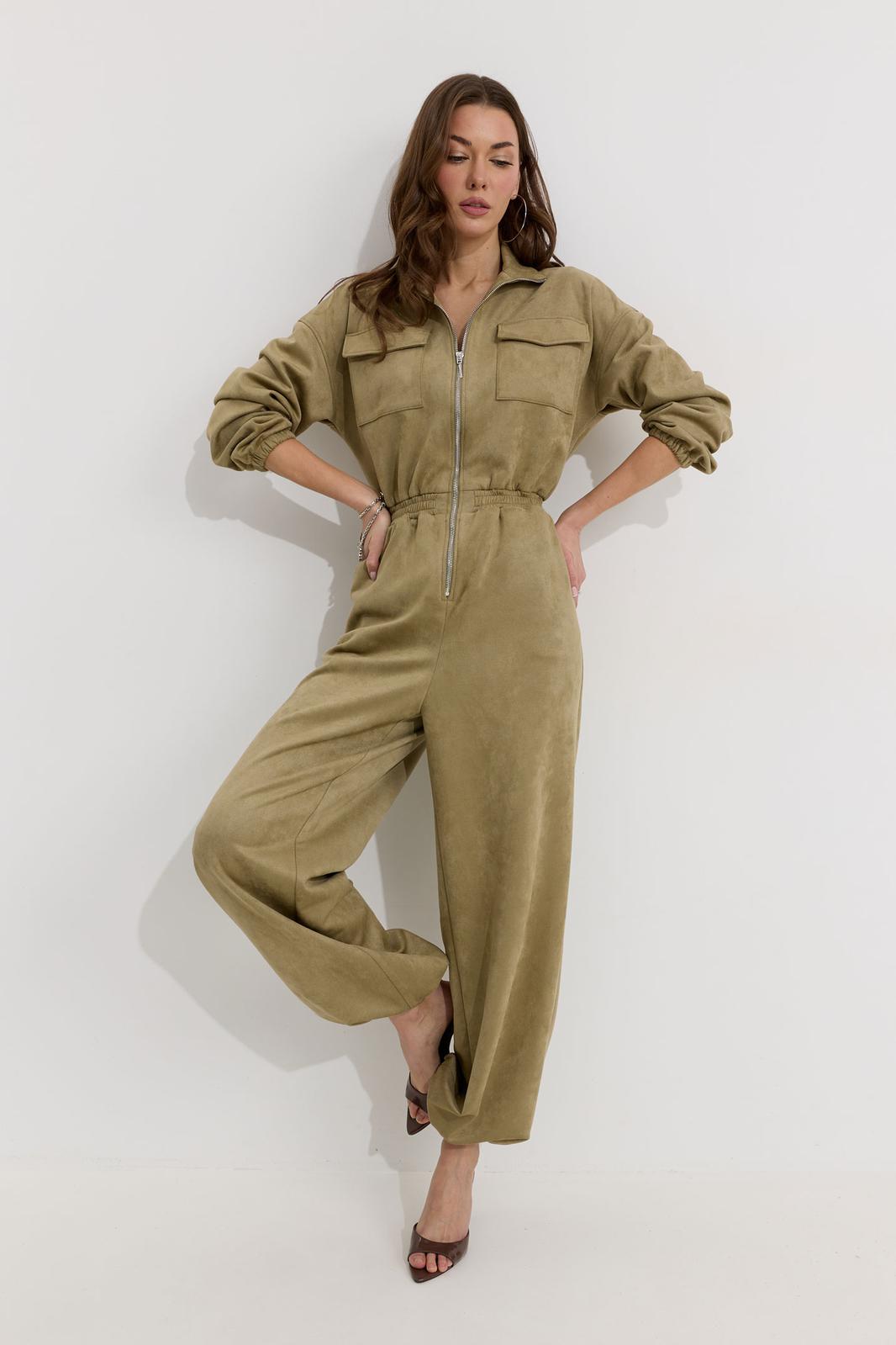 Комбинезон полуприлегающего силуэта с расширенными книзу брюками из трикотажного полотна “замша”. Горловина-стойка, по центру застежка на молнию. Рукав со спущенной линией плеча, по низу эластичная тесьма(резинка). По переду и спинке в районе талии притачной пояс, в пояс вставлена эластичная тесьма(резинка). По переду накладные карманы с клапанами. Брюки прямого силуэта, по переду и спинке карманы. По низу брюк предусмотрена кулиса с завязкой для регулирования степени прилегания. Обращаем ваше внимание, что фурнитура может отличаться от фото.