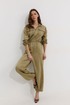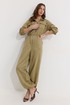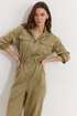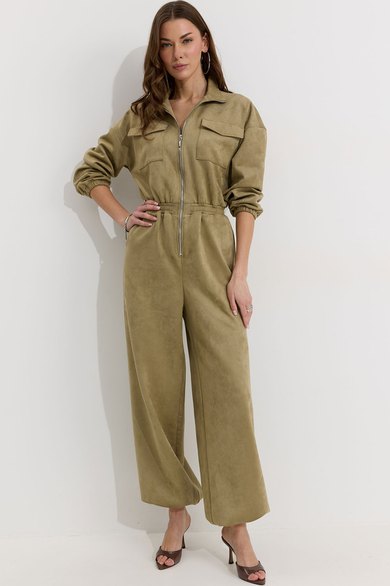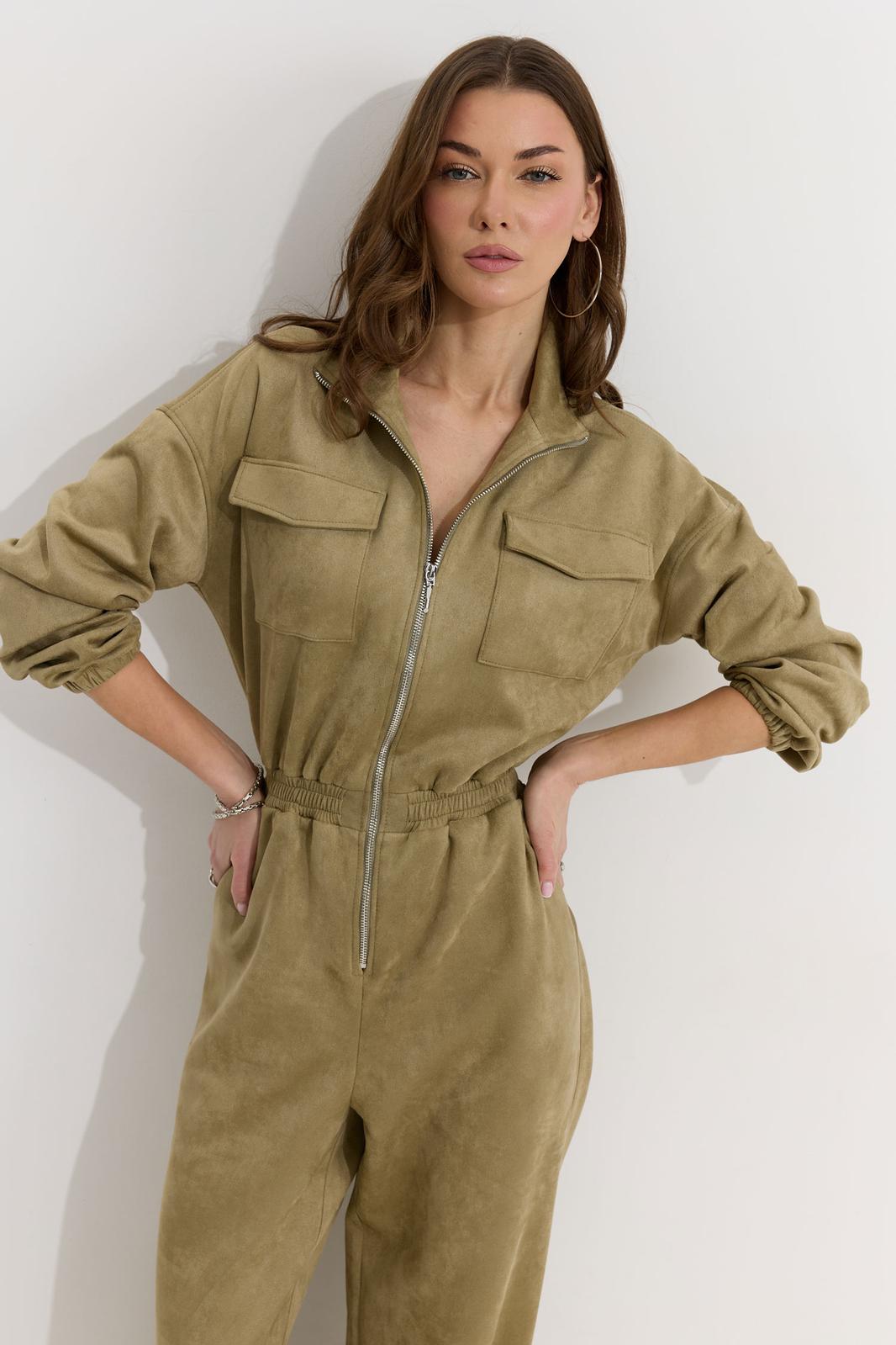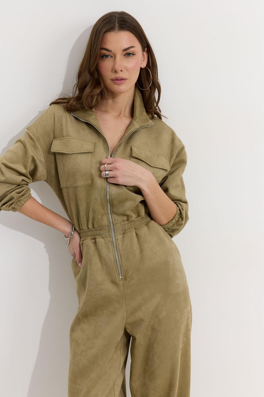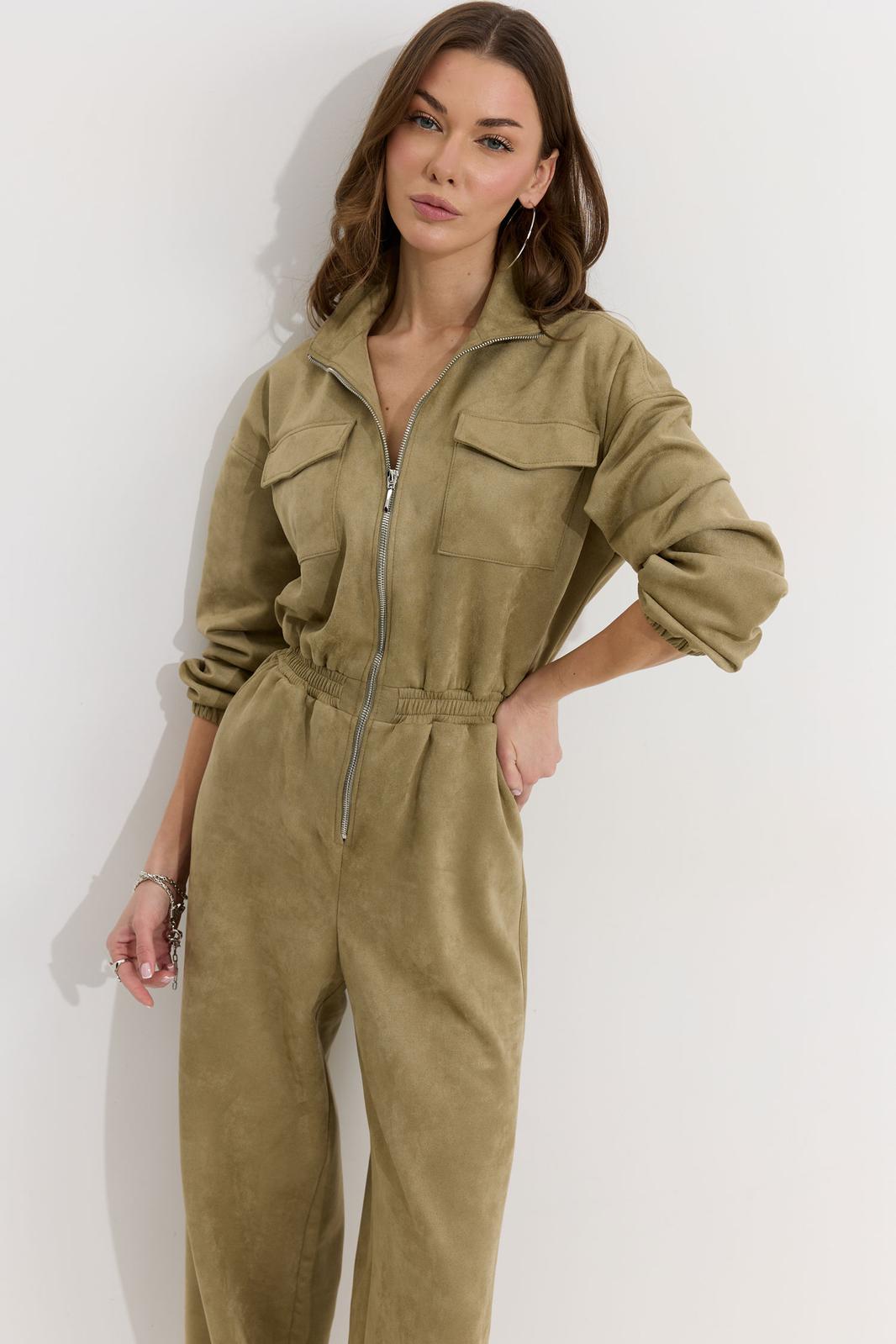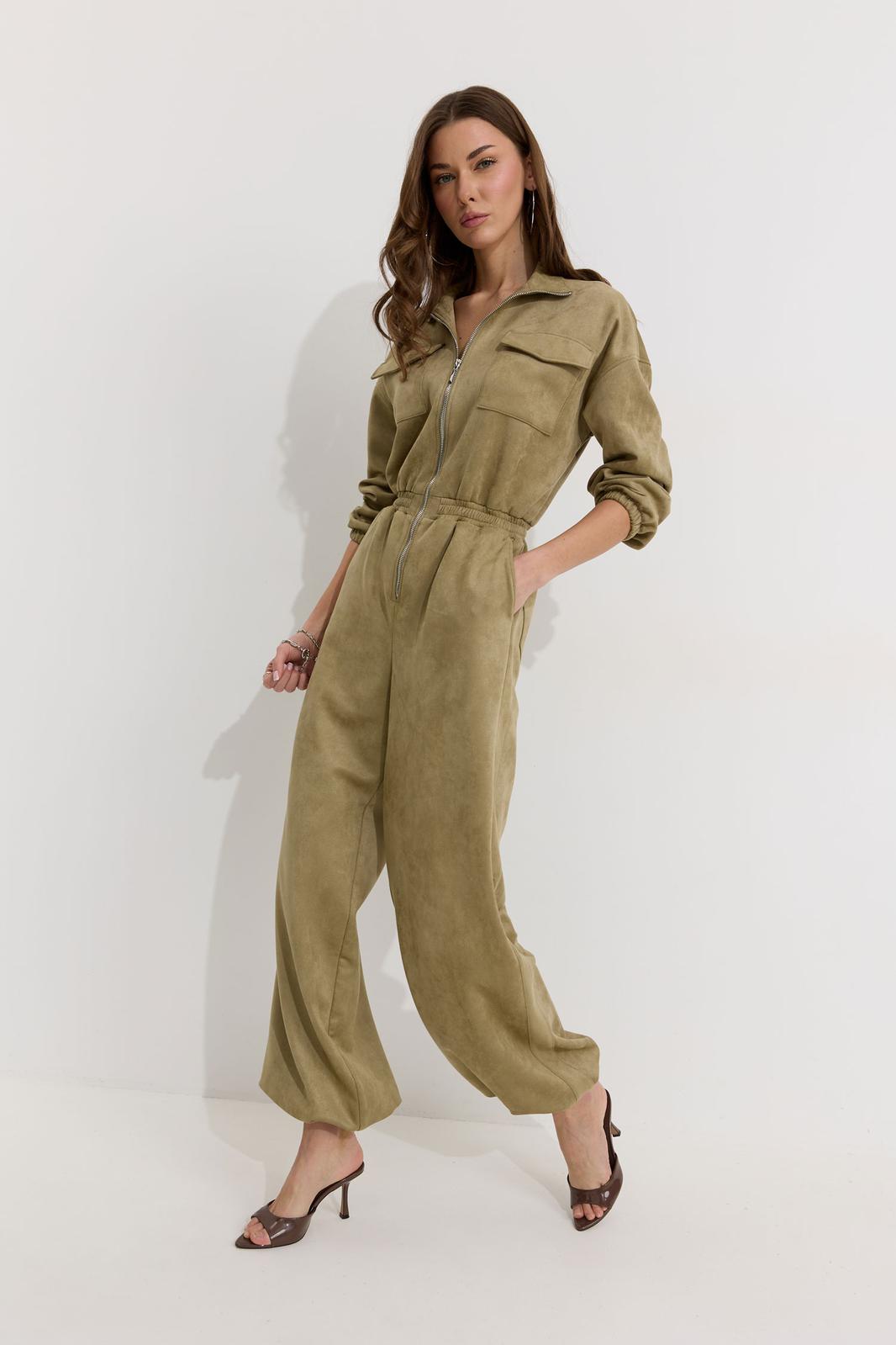 Комбинезон полуприлегающего силуэта с расширенными книзу брюками из трикотажного полотна “замша”. Горловина-стойка, по центру застежка на молнию. Рукав со спущенной линией плеча, по низу эластичная тесьма(резинка). По переду и спинке в районе талии притачной пояс, в пояс вставлена эластичная тесьма(резинка). По переду накладные карманы с клапанами. Брюки прямого силуэта, по переду и спинке карманы. По низу брюк предусмотрена кулиса с завязкой для регулирования степени прилегания. Обращаем ваше внимание, что фурнитура может отличаться от фото.