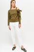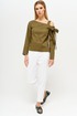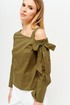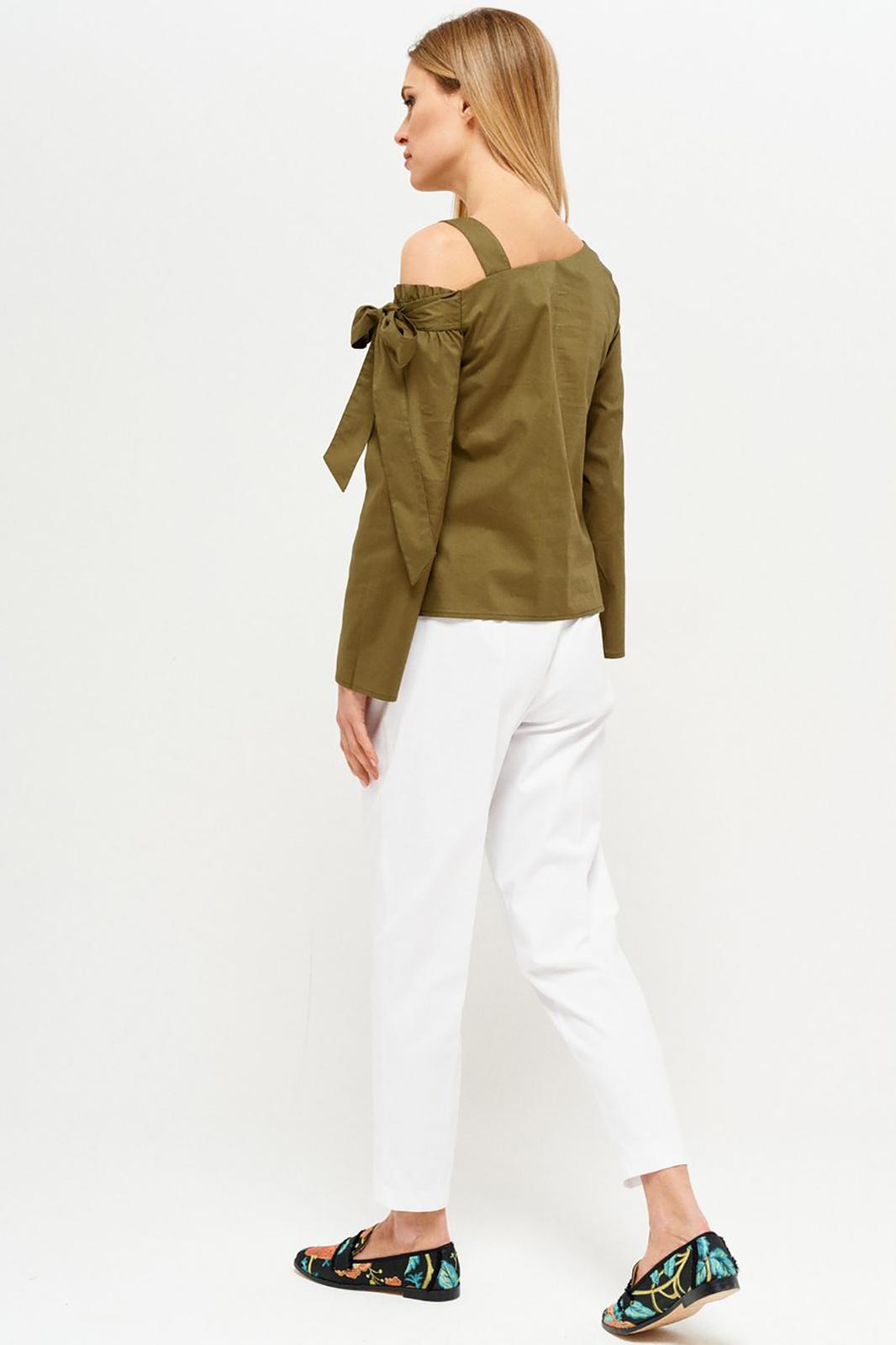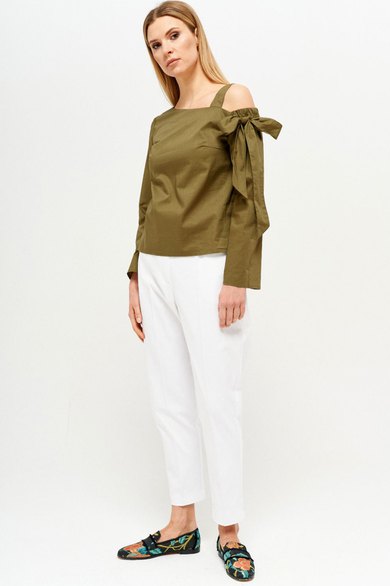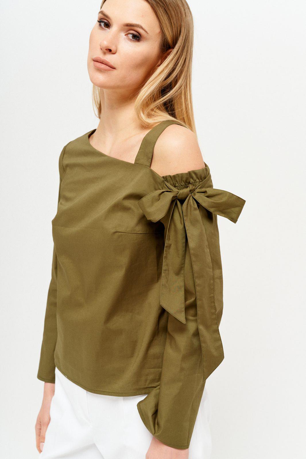 Блузка из хлопчатобумажной ткани прямого силуэта. Горловина с декоративным вырезом, переходящая в открытый плечевой на широкой бретеле. Перед блузки с нагрудными вытачками. Рукав втачной длинный, верхний срез левого рукава оформлен резинкой и втачными в срез проймы широкими завязками, которые завязываются на предплечье.