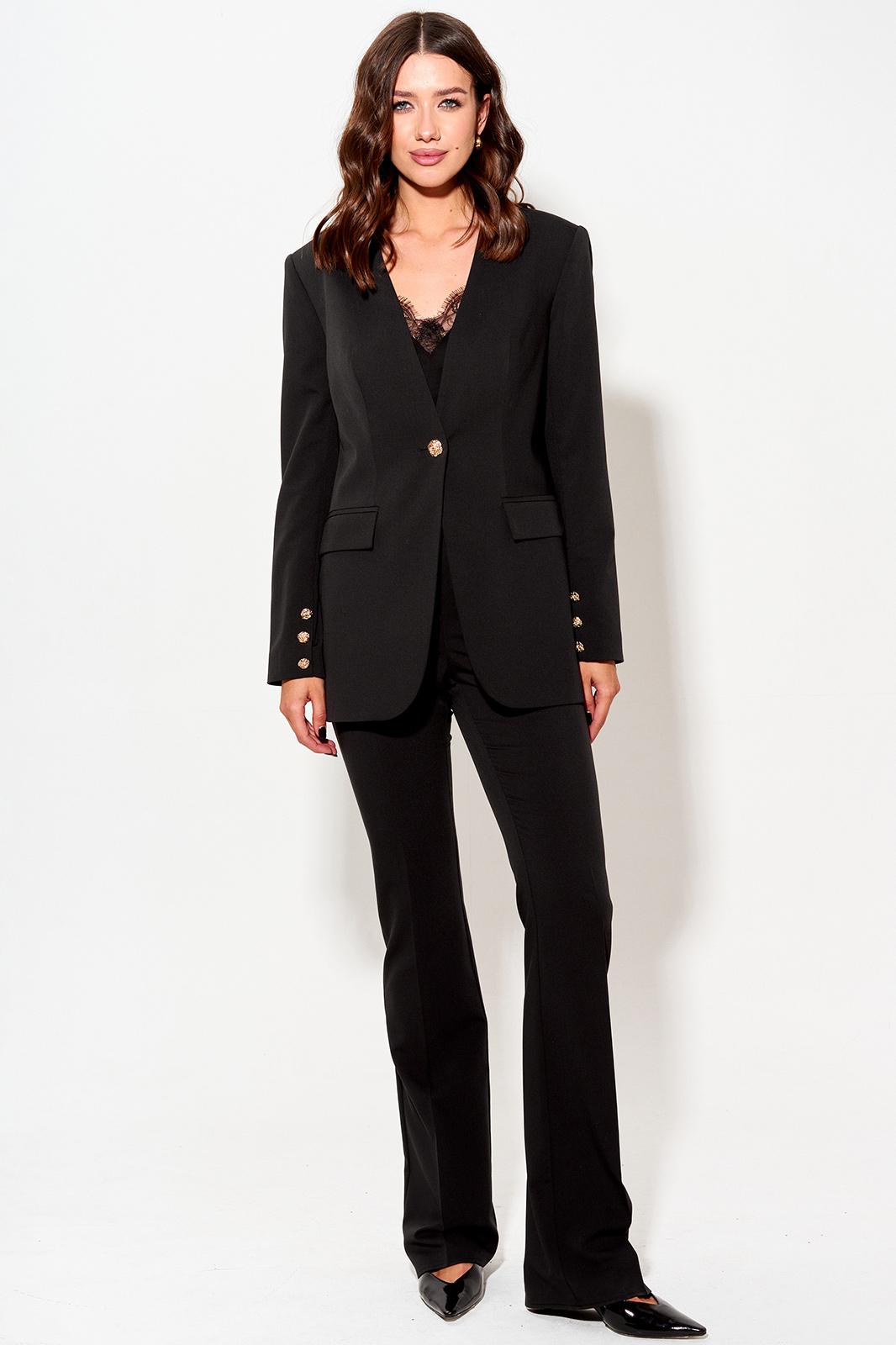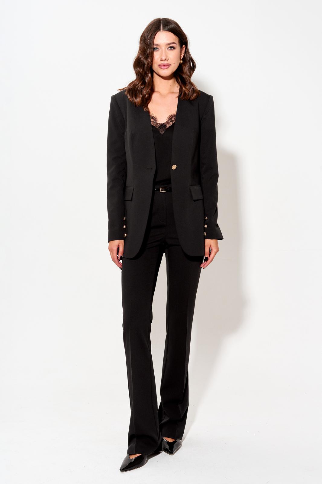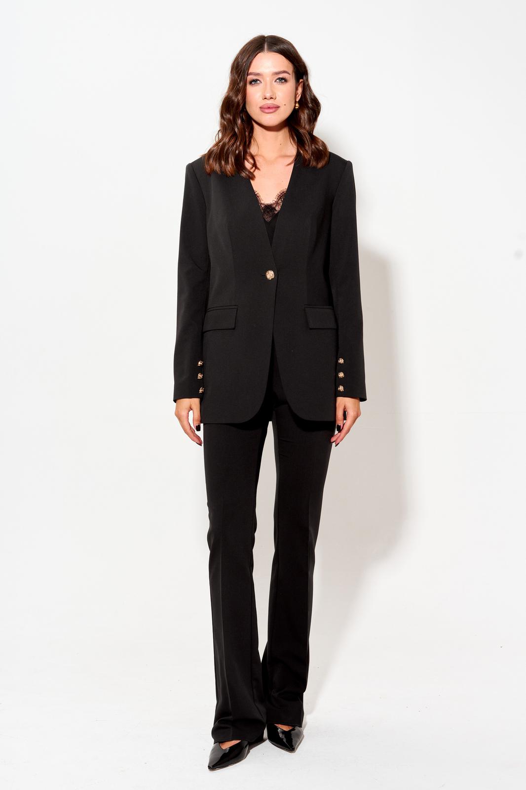 Стильный жакет полуприлегающего силуэта из костюмной ткани. Рукав втачной двухшовный, по низу в переднем шве рукава декоративная шлица с декоративными пуговицы. Жакет с V-образным вырезом и застежкой по центру на петлю и пуговицу. По переду и спинке талиевые вытачки. По переду карман в рамку с клапаном. Обращаем ваше внимание, что фурнитура может незначительно отличаться от фото.