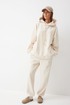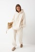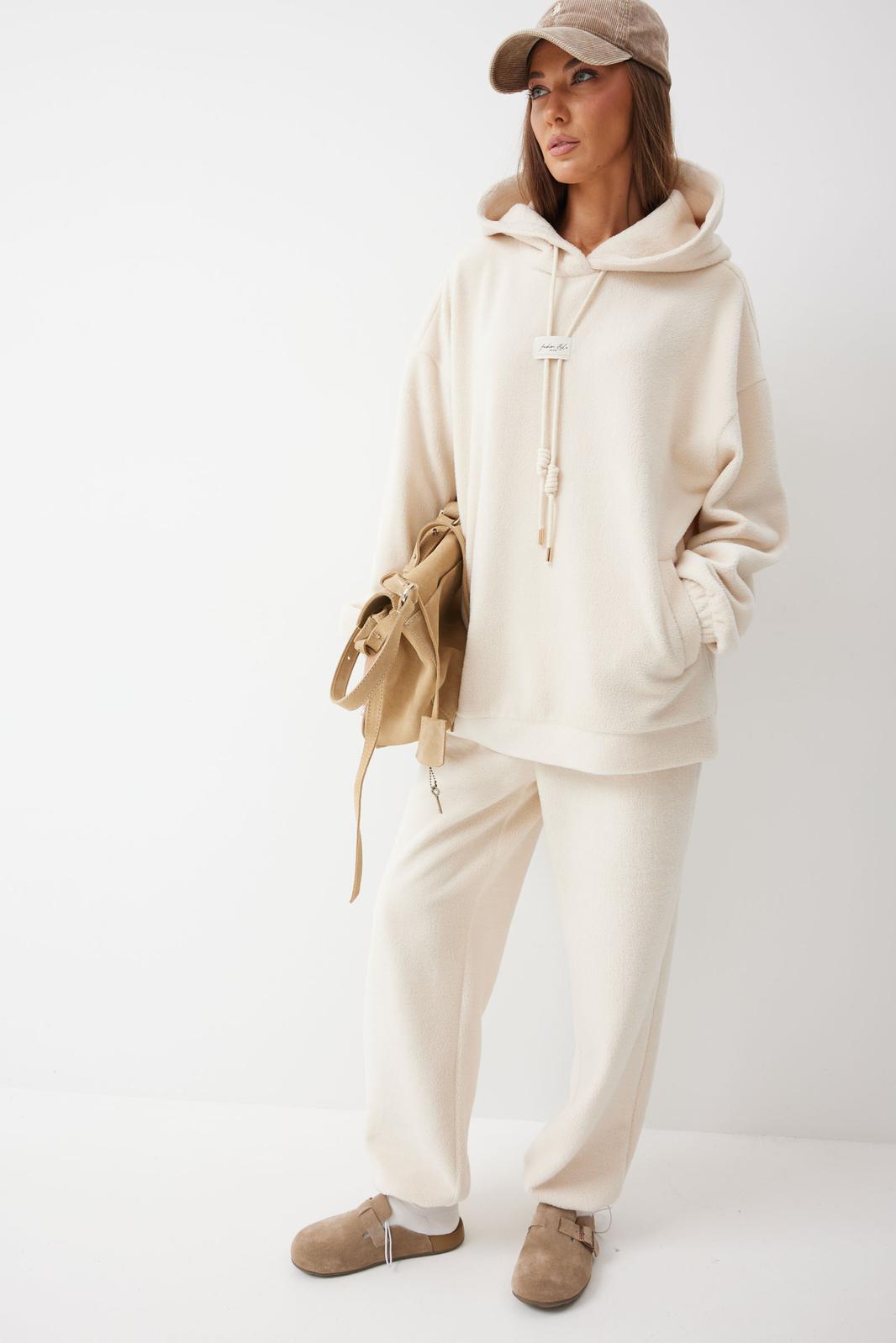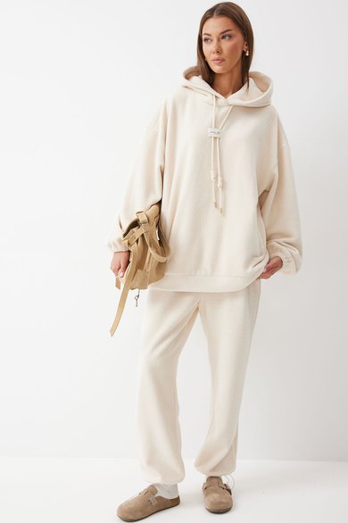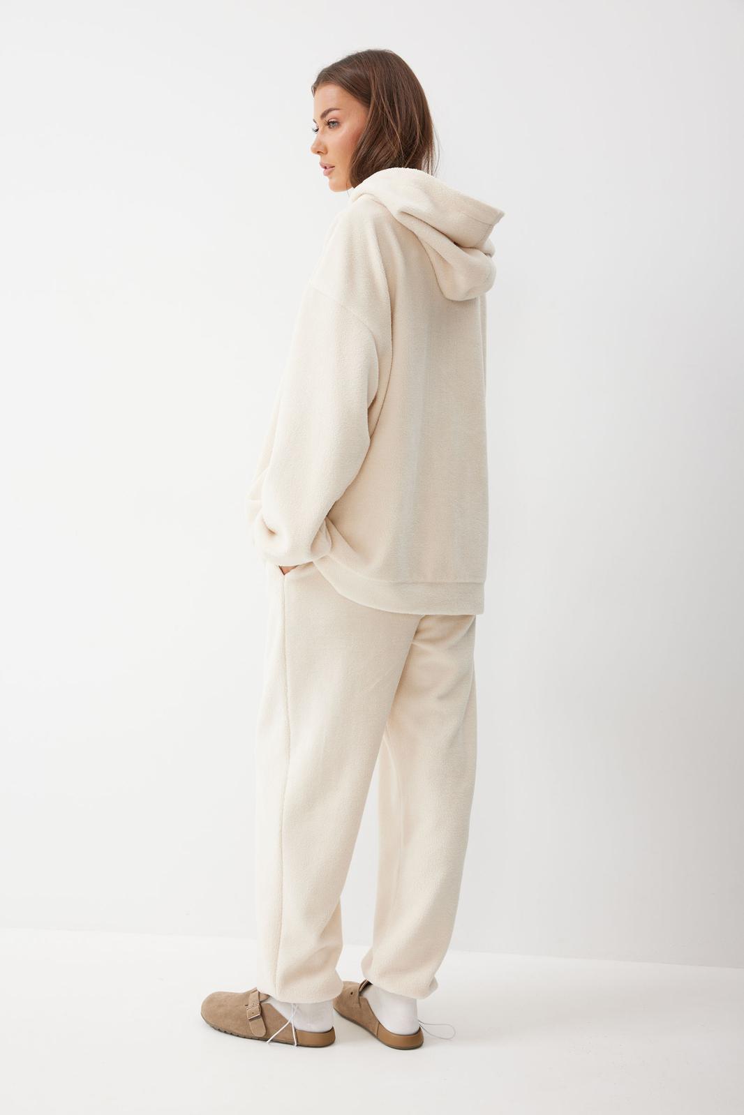 Костюм состоящий из джемпера и брюк. Джемпер прямого силуэта из комфортного трикотажного полотна. Горловина обработана капюшоном. Рукав со спущенной линией плеча, по низу на резинке. По низу джемпера притачной пояс. По переду декоративная нашивка и шнур.