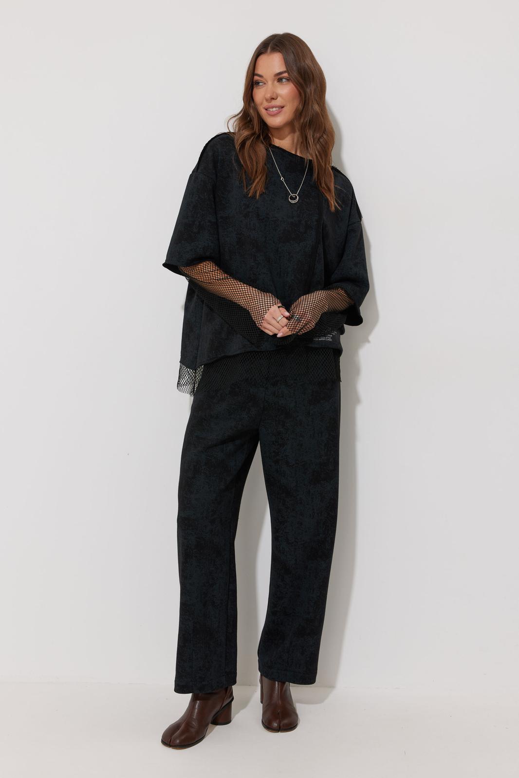 Ассиметричный джемпер прямого силуэта из трикотажного полотна комбинированного сеткой. Горловина округлая. Рукав со спущенной линией плеча двойной. По переду и спинке декоративный шов, по низу пояс с нашивкой . По низу джемпера и рукава декоративная сетка.