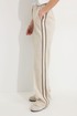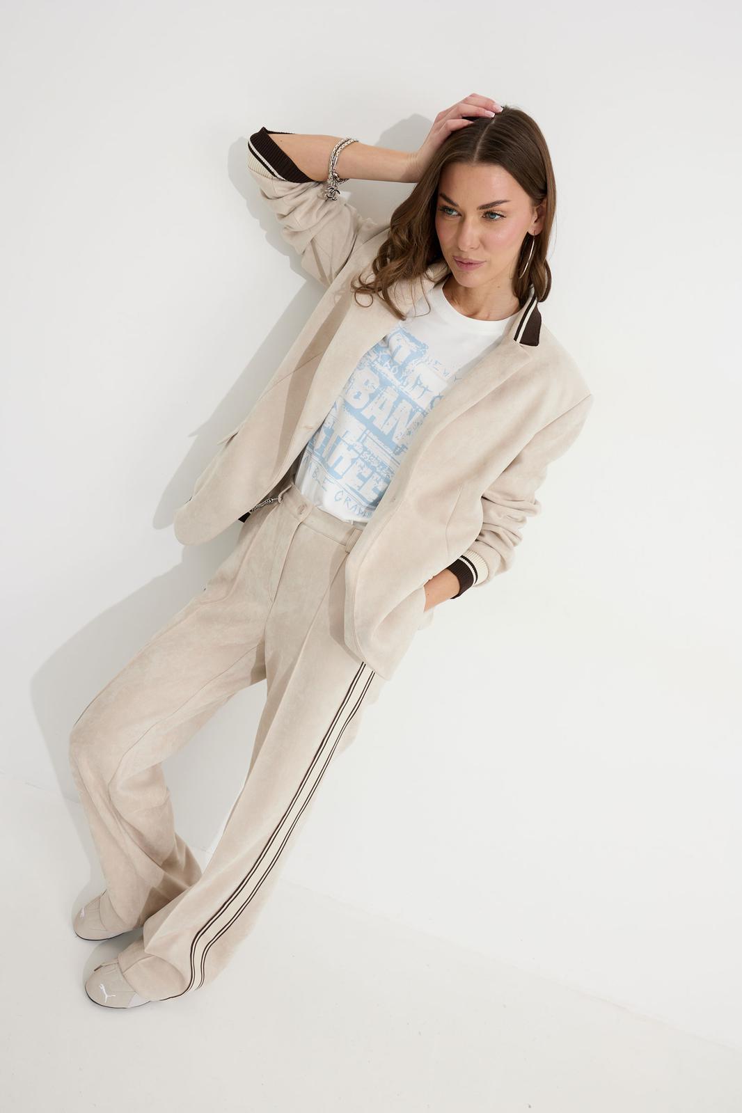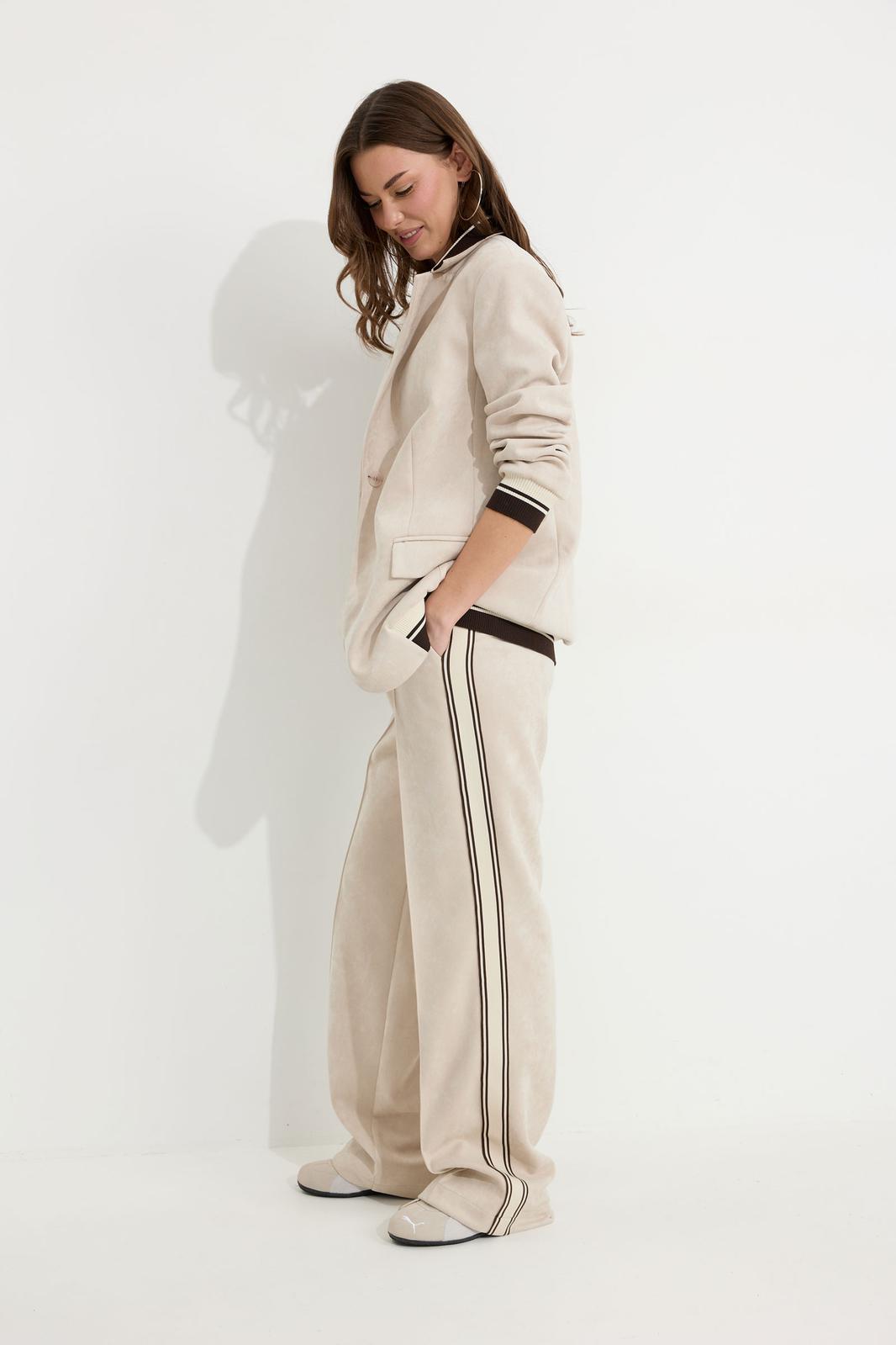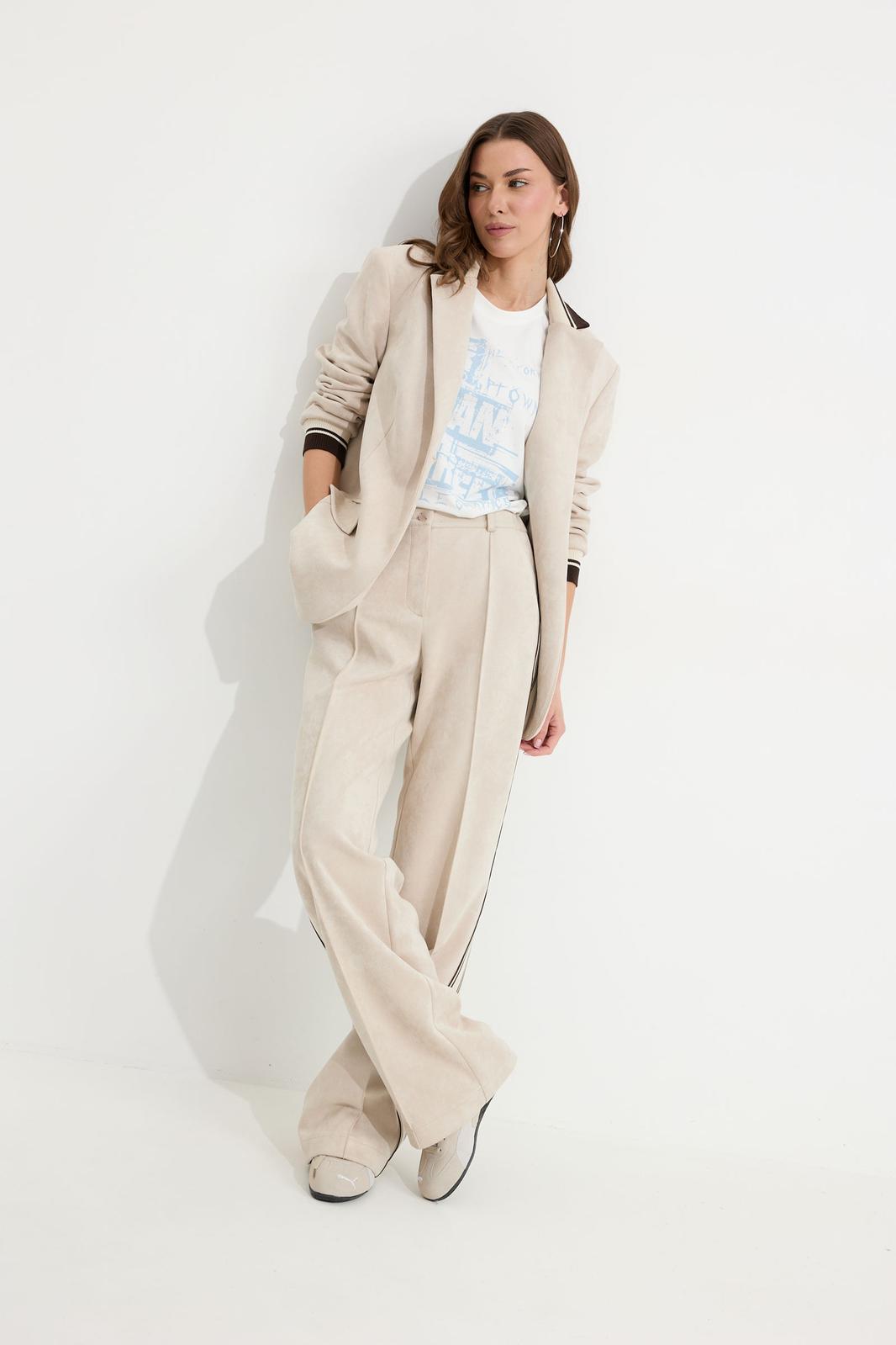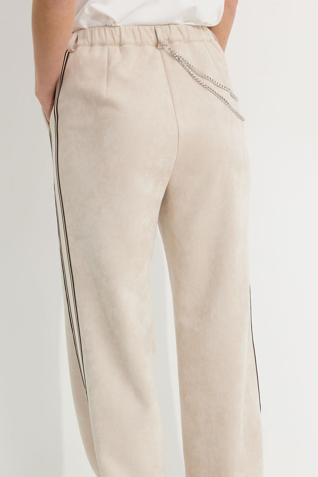 Брюки прямого силуэта из трикотажного полотна “замша”. По верху притачной пояс с застежкой на петлю и пуговицу и шлевками для ремня. На передних половинках обработаны карманы, канты и застежка молния в среднем шве, на задних – вытачки. По поясу задних половинок брюк эластичная тесьма(резинка) . Вдоль бокового шва брюк лампас. Обращаем ваше внимание, что фурнитура может отличаться от фото. Декоративный элемент - цепочка в комплектацию не входит.