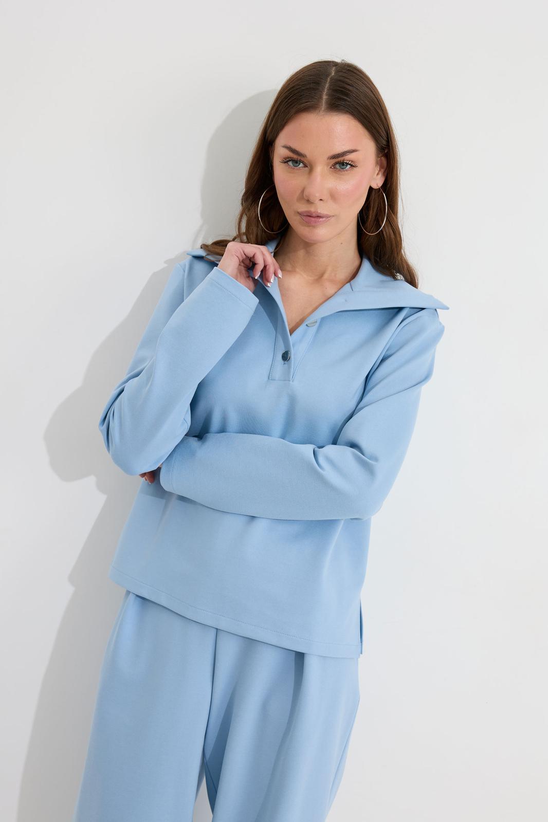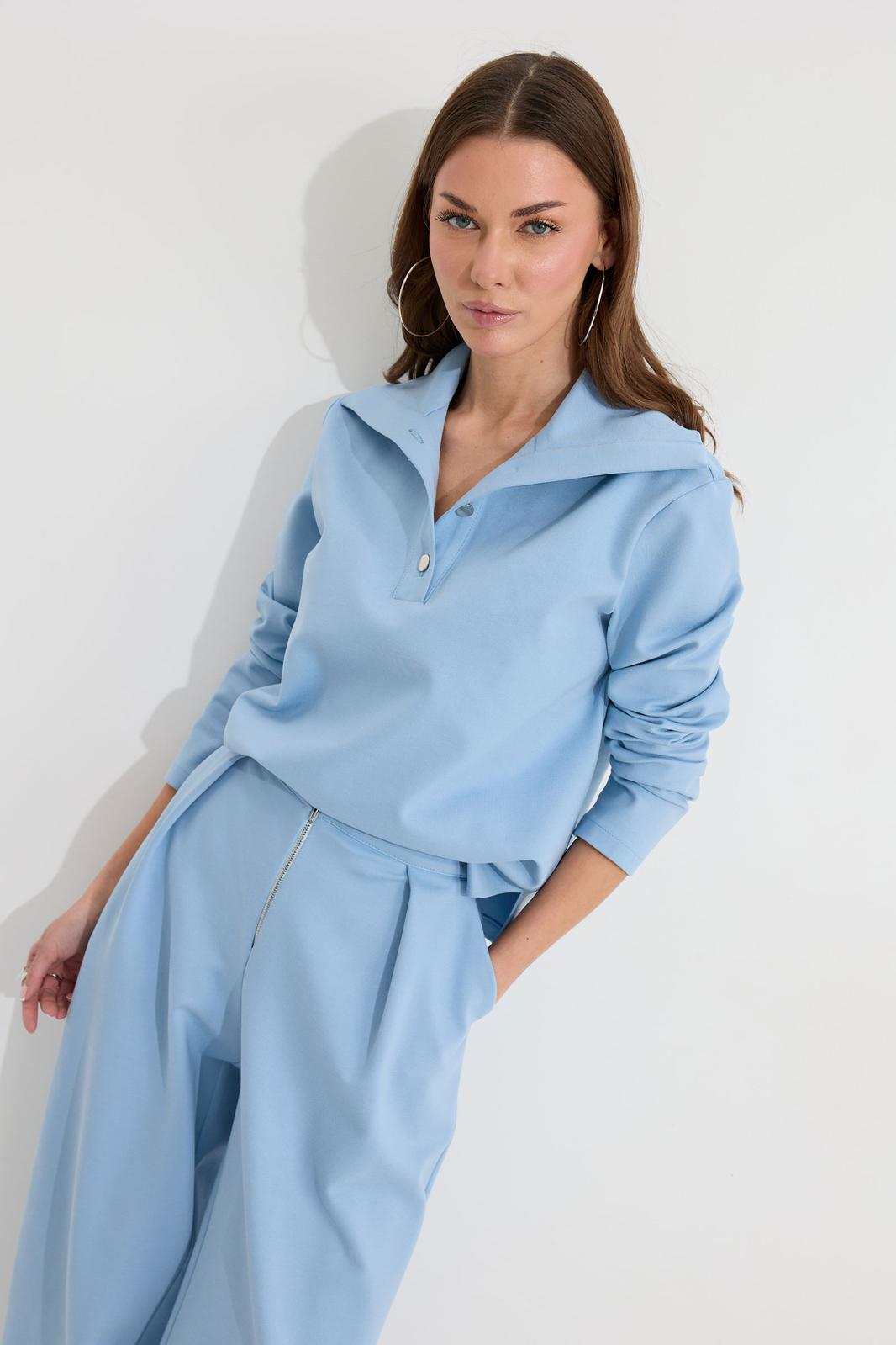 Джемпер прямого силуэта из трикотажного полотна. Воротник - широкая стойка. Горловина с застежкой на петлю и пуговицу. Рукав одношовный втачной, чуть спущена линия плеча. По низу джемпера в боковых швах разрезы. Обращаем ваше внимание, что фурнитура может отличаться от фото.
