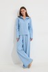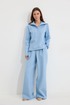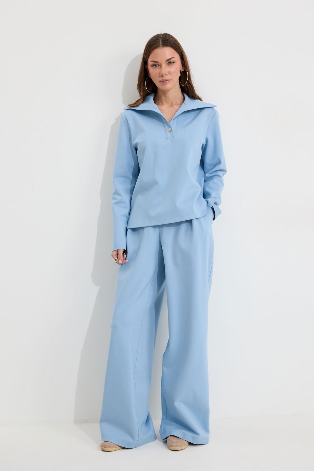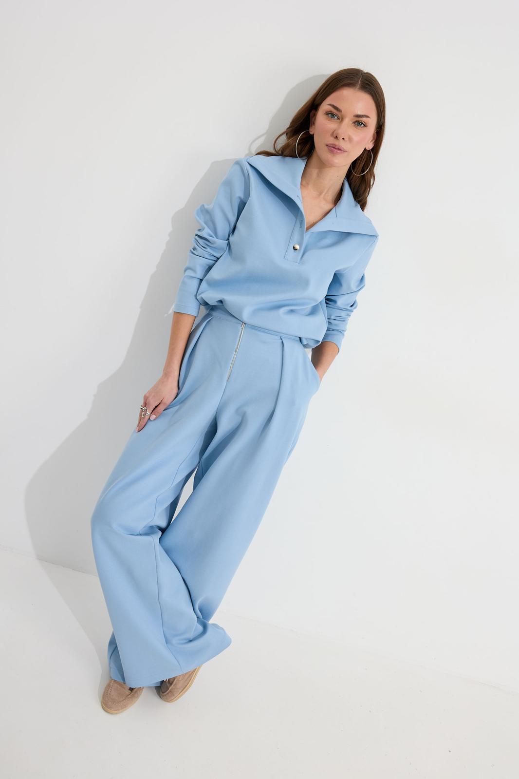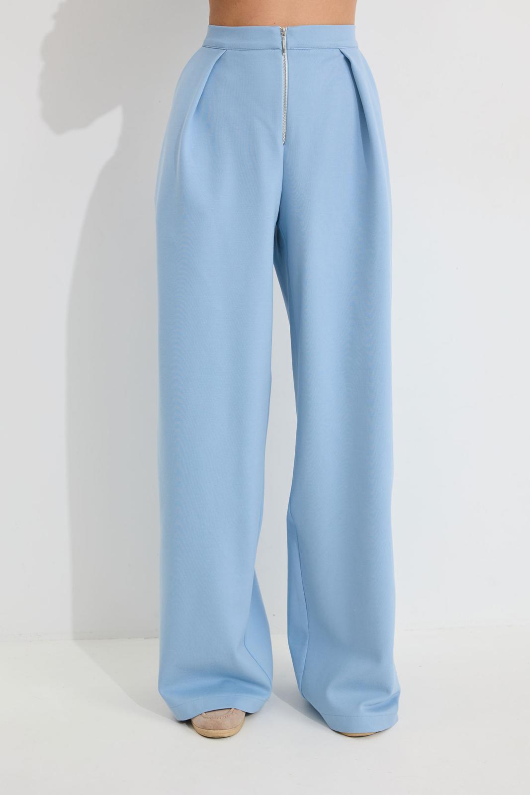 Брюки прямого силуэта из трикотажного полотна. По верху брюк притачной пояс, по переду застежка молния в среднем шве, карманы в боковых швах и декоративные складки. На задних половинках брюк прорезные листочки. По задним половинкам брюк на поясе резинка от вытачки до вытачки. Обращаем ваше внимание, что фурнитура может отличаться от фото.