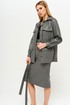 Жакет прямого силуэта. Воротник отложной. По переду центральная потайная застежка на петли и пуговицы, нагрудные накладными карманы и клапанами в верхней и нижней части жакета. Спинка со средним швом. Рукав втачной длинный, на притачной манжете, разрез рукава обработан английской планкой. В комплект входит пояс на полукольцах из основной ткани.