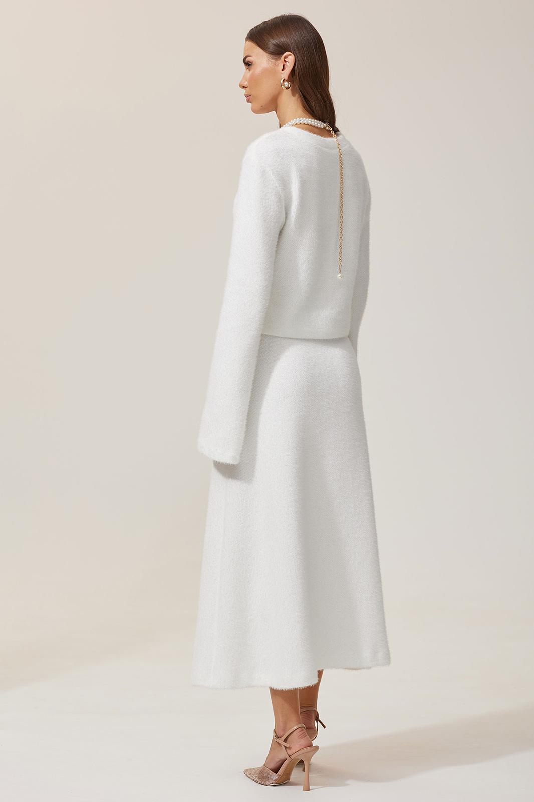 Джемпер укороченный полуприлегающего силуэта из мягкого трикотажного полотна с ворсом. Горловина округлая. Рукав втачной длинный, расширенный книзу.