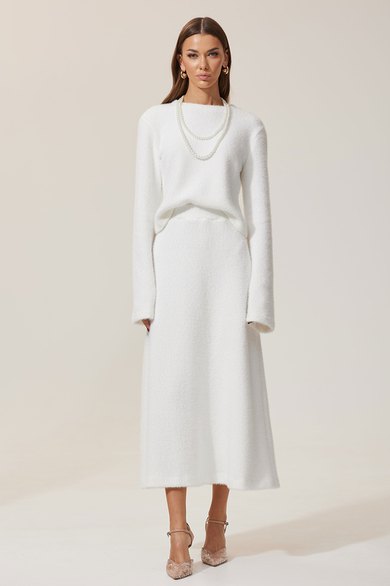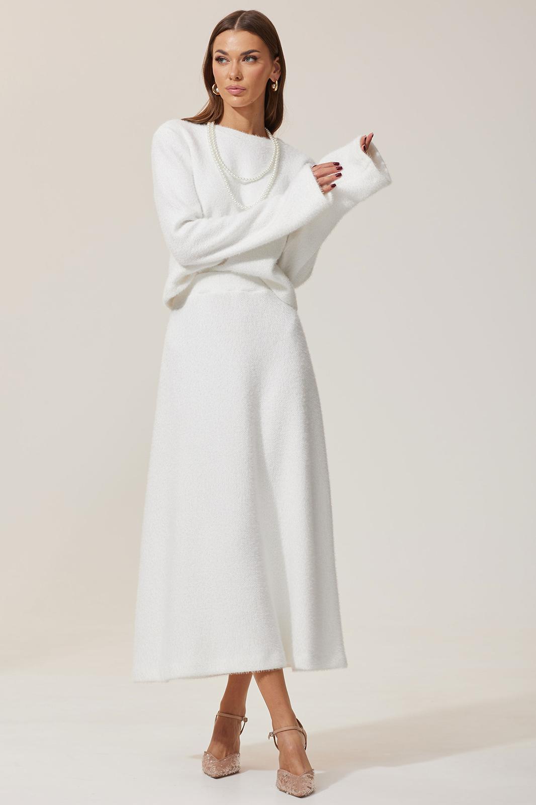 Юбка А-силуэта из трикотажного полотна с ворсом. По верху изделия притачной пояс на эластичной тесьме(резинке). Юбка без подкладки. Длина джемпера (44-48р - 48см) (50-54р - 50см).