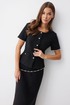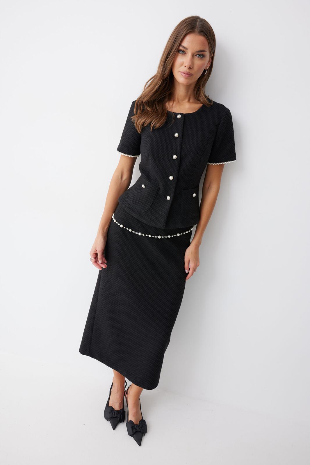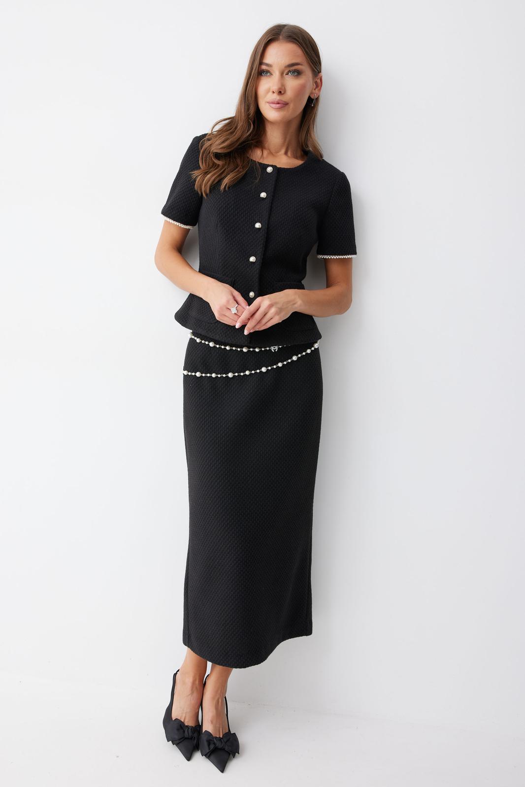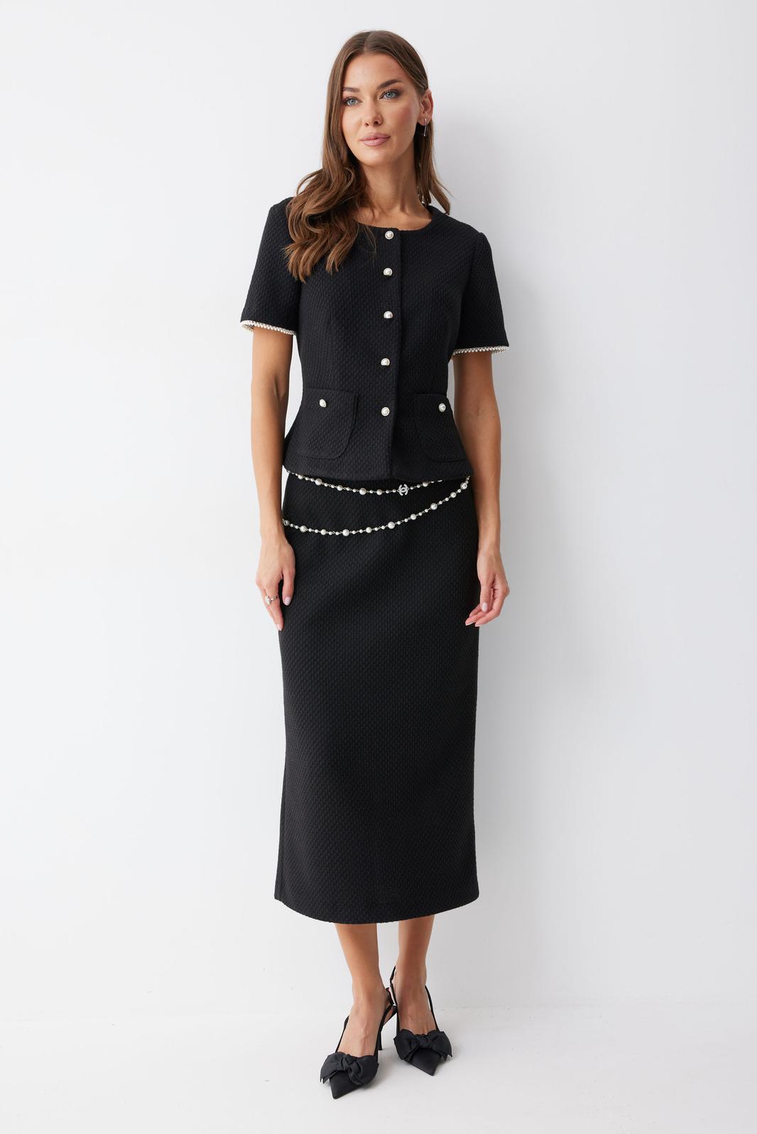 Жакет полуприлегающего силуэта из трикотажного полотна. Горловина округлая по центру застежка на петли и пуговицы. Рукав втачной короткий. По переду талиевые вытачки и накладные карманы, на спинке – талиевые вытачки. Жакет на подкладке. Обращаем ваше внимание, что фурнитура может отличаться от фото.