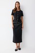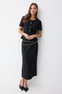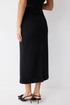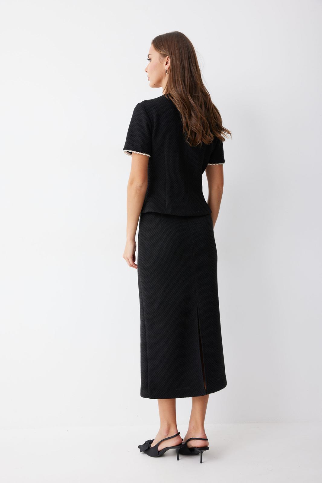 Юбка прямого силуэта из трикотажного полотна. По верху юбки притачной пояс. На спинке юбки в центральном шве застежка на потайную молнию, по низу разрез. Юбка на подкладке.