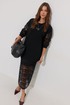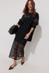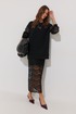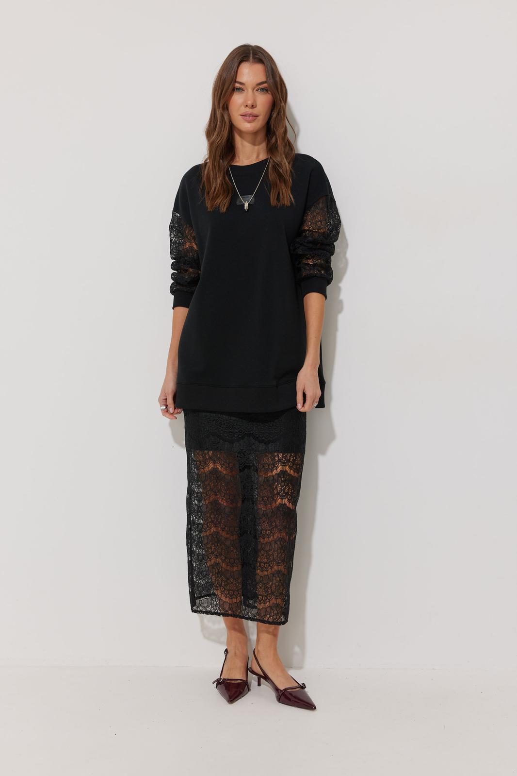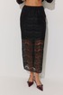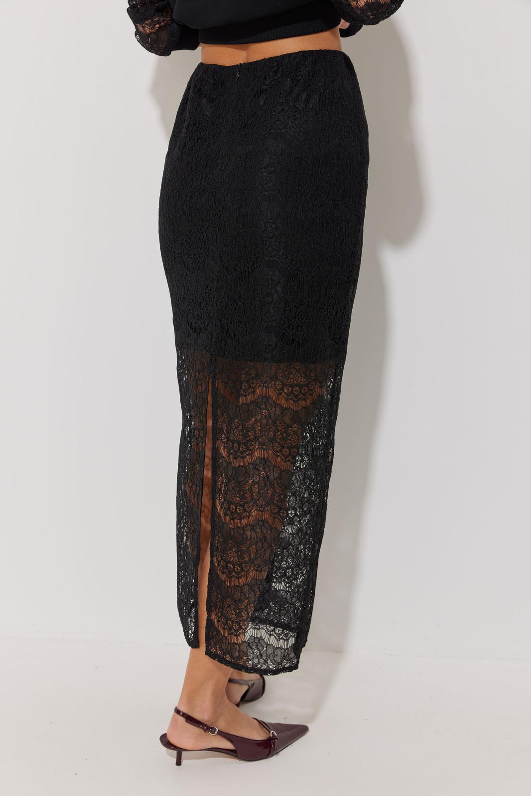 Юбка выполнена из кружевной ткани, длина миди. Юбка прямого силуэта. Нижний слой юбки выполнен из тонкого трикотажа в тон основной ткани. Юбка на резинке. По среднему шву заднего полотнища разрез.