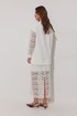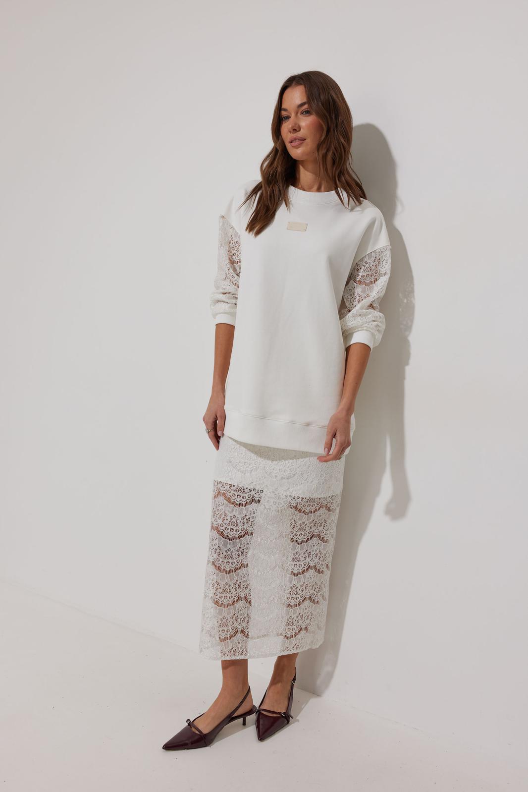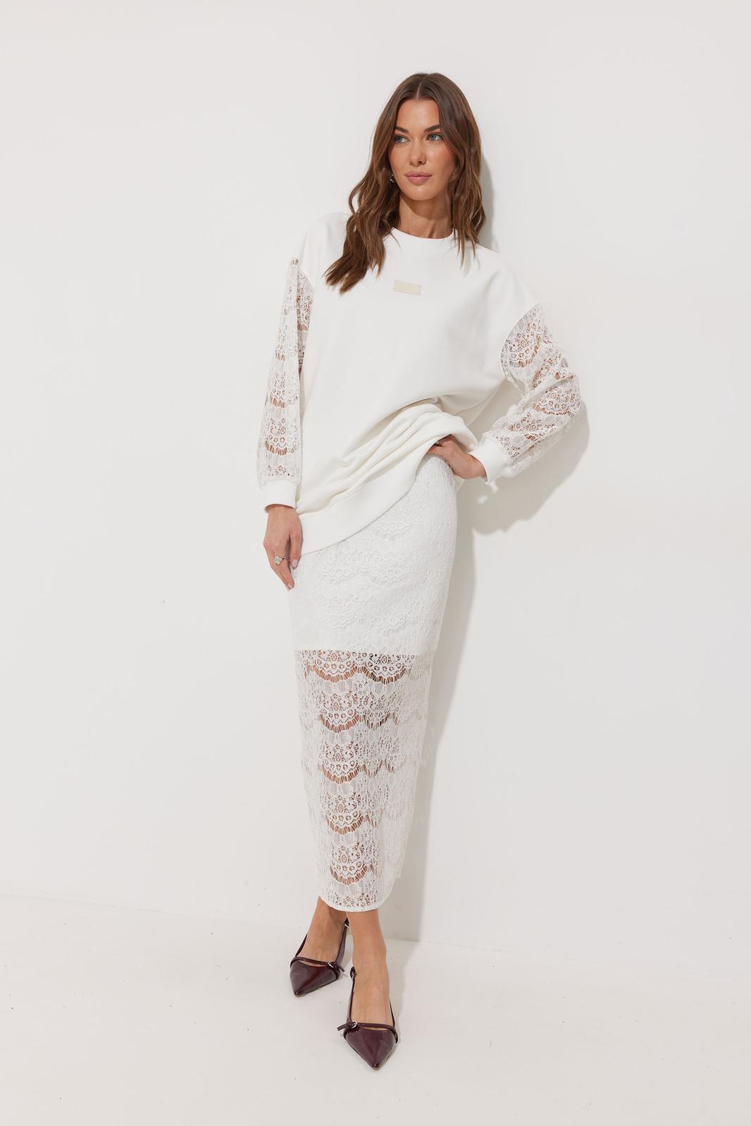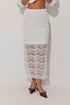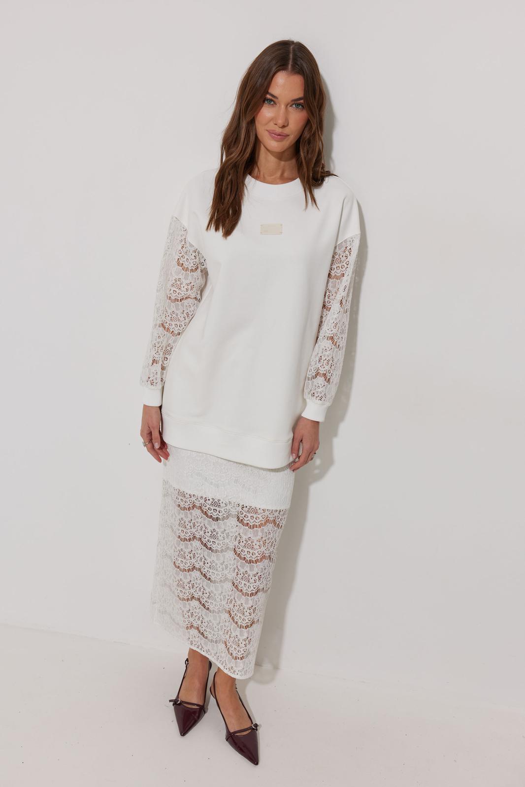 Юбка выполнена из кружевной ткани, длина миди. Юбка прямого силуэта. Нижний слой юбки выполнен из тонкого трикотажа в тон основной ткани. Юбка на резинке. По среднему шву заднего полотнища разрез.