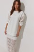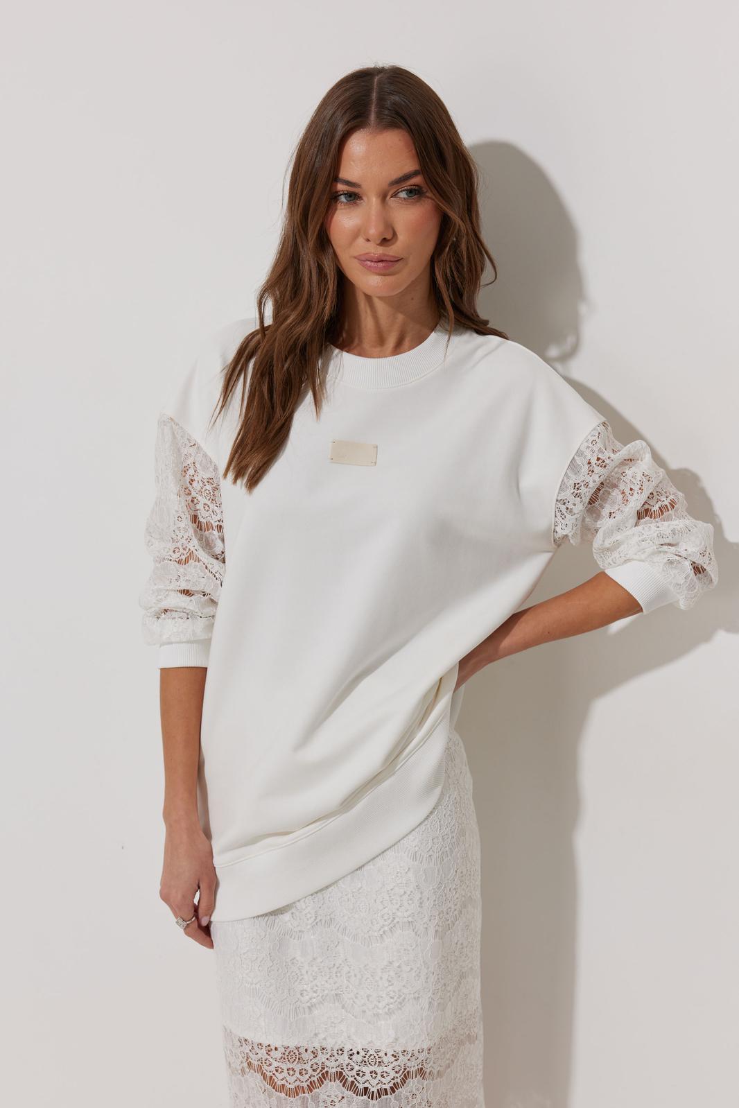 Джемпер из трикотажного полотна, свободного кроя, удлиненный, со спущенной линией плеча. С круглым вырезом горловины, с планкой из кашкорсе. С изнаночной стороны по спинке на горловине настрочена декоративная тесьма. По переду декор в виде нашивки. Обращаем Ваше внимание, что декор может незначительно отличаться от фото. Рукав выполнен из кружевной ткани, по низу рукава манжета из кашкорсе. Джемпер с поясом из кашкорсе.