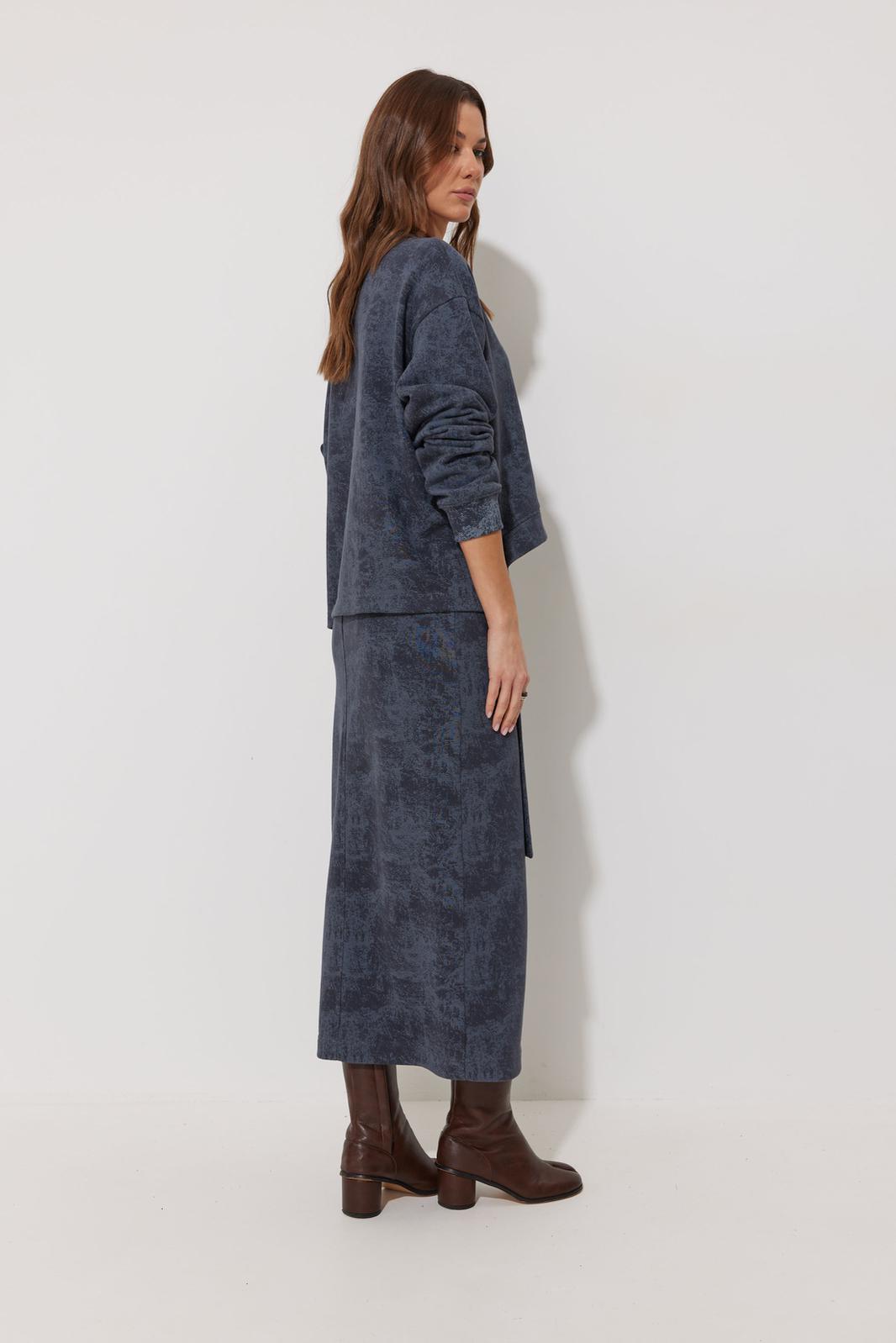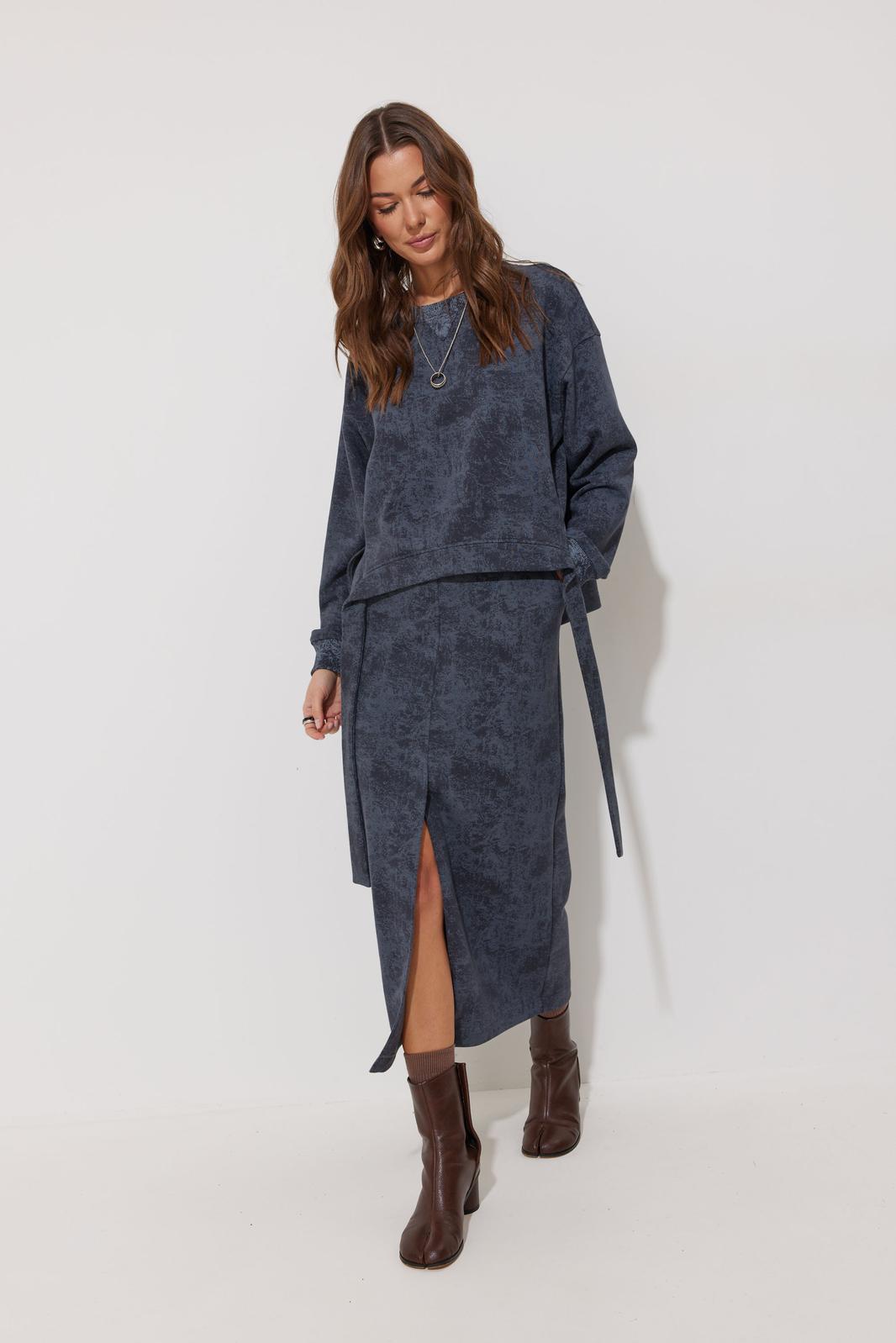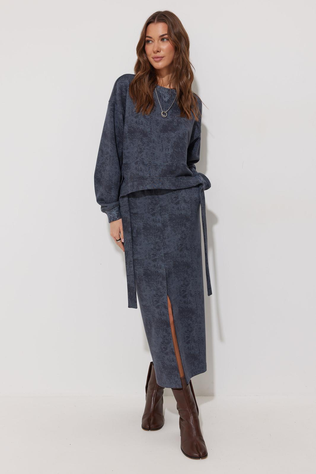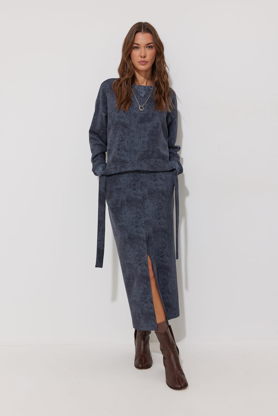 Юбка полуприлегающего силуэта из трикотажного полотна. По верху юбки притачной пояс с резинкой. По переду средний шов со шлицей и карманы. На заднем полотнище юбки накладные карманы.