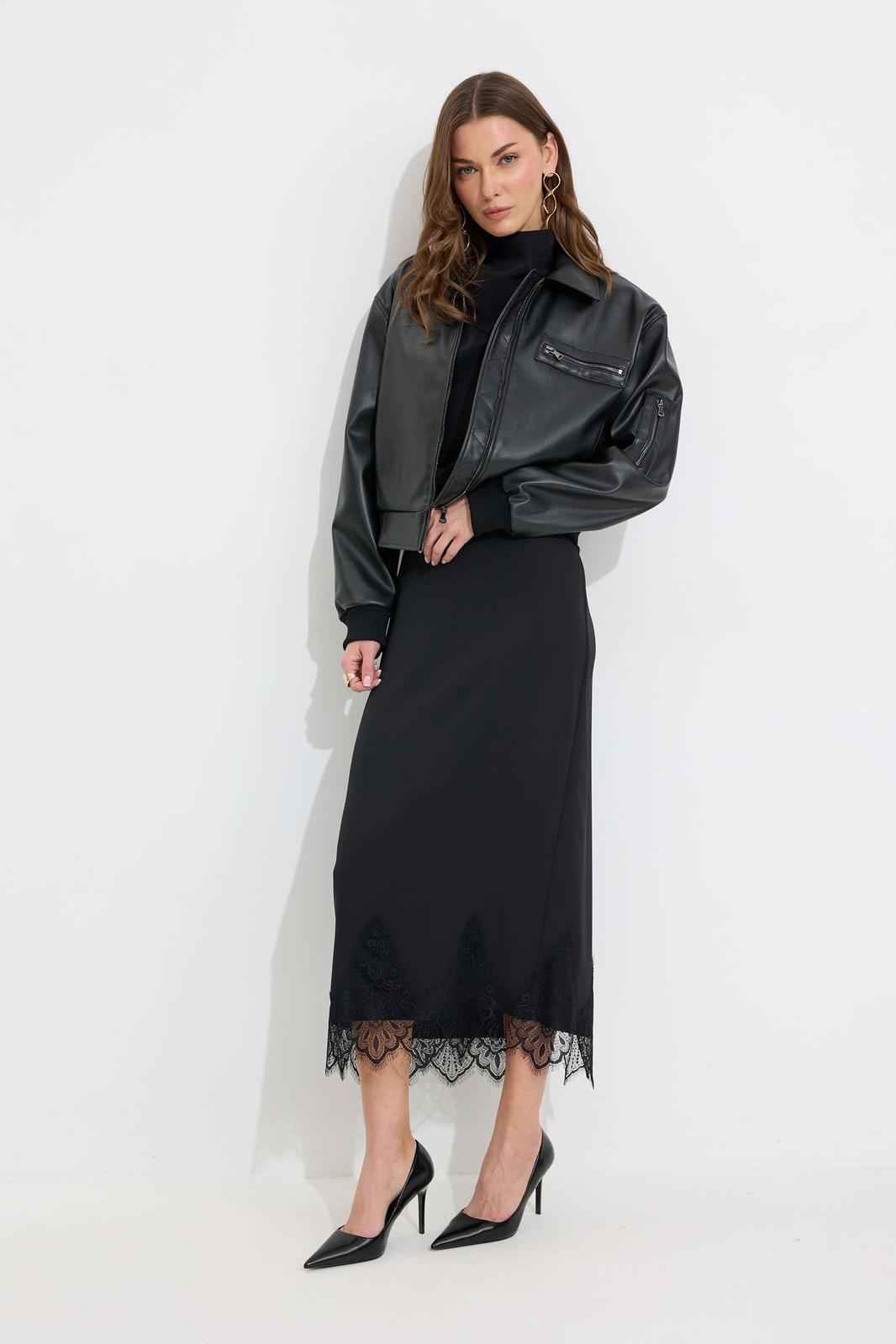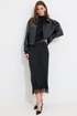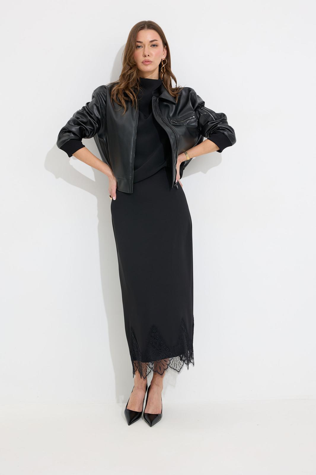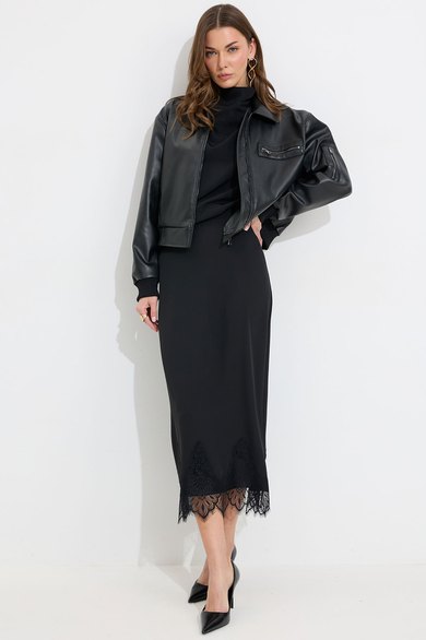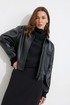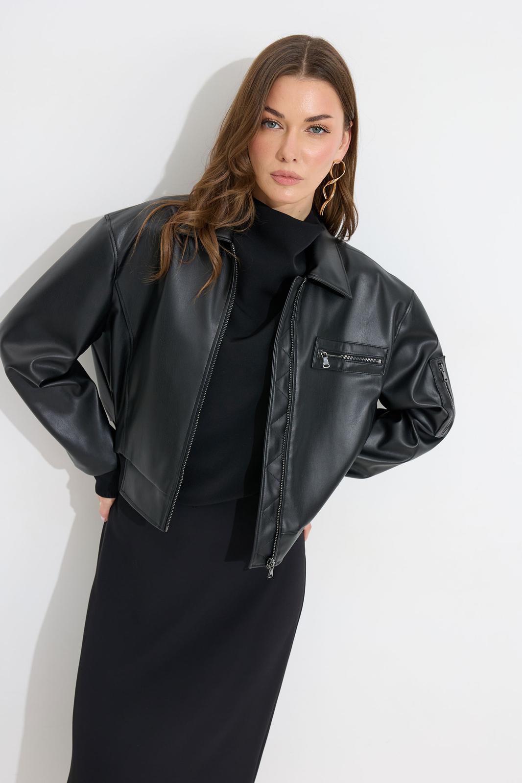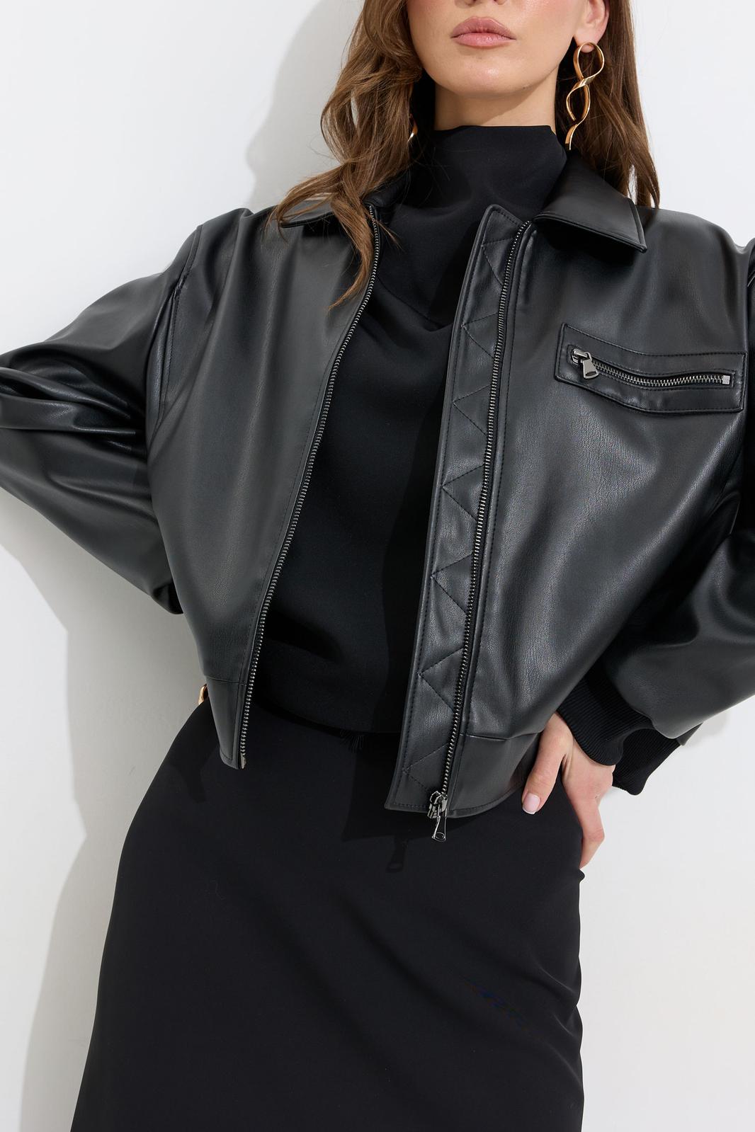Жакет прямого силуэта из экокожи. Воротник отложной, по центру застежка на молнию. Жакет с удлиненной линией плеча, рукав одношовный втачной, по низу рукава манжета (из трикотажного полотна). По переду рельефы с функциональными карманами и декоративный элемент с молнией. На спинке кокетка. По низу жакета притачной пояс (из трикотажного полотна). Жакет на подкладке. Обращаем ваше внимание, что фурнитура может отличаться от фото.