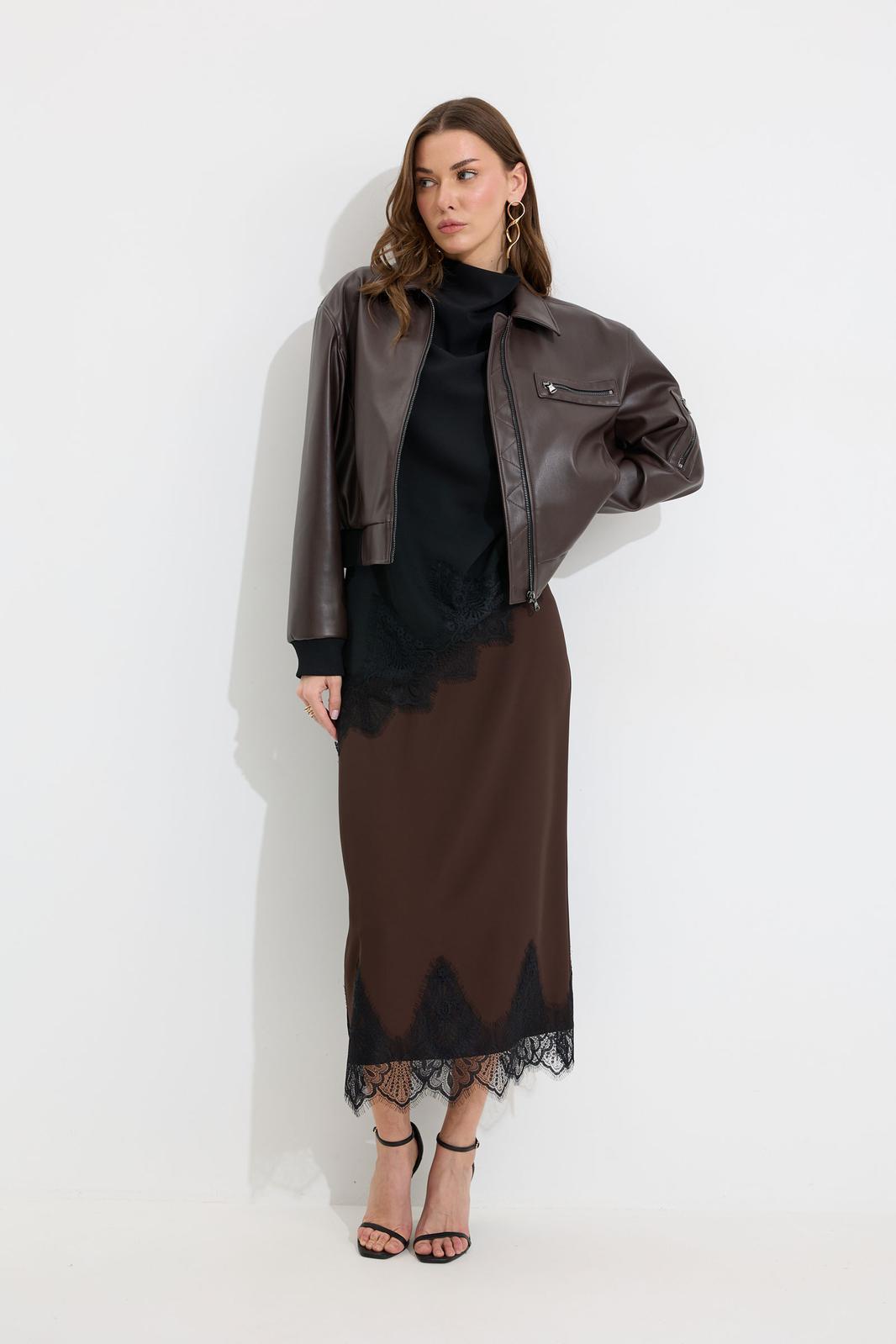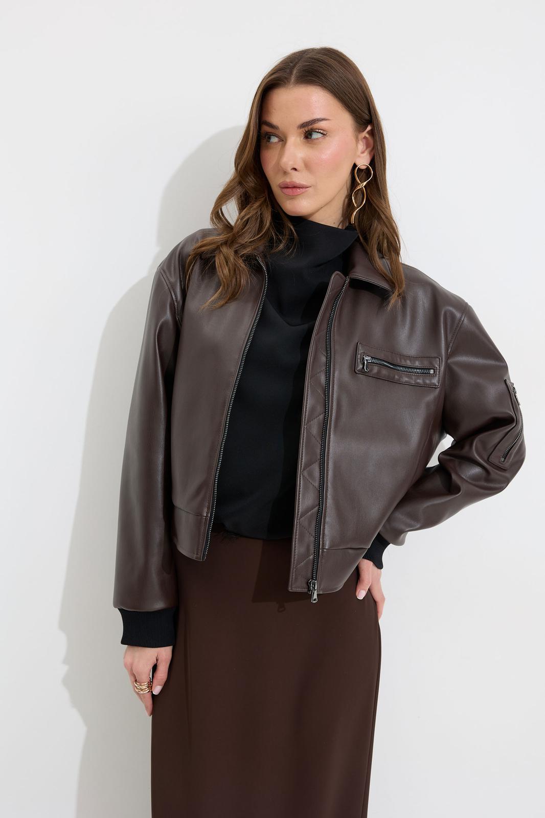 Жакет прямого силуэта из экокожи. Воротник отложной, по центру застежка на молнию. Жакет с удлиненной линией плеча, рукав одношовный втачной, по низу рукава манжета (из трикотажного полотна). По переду рельефы с функциональными карманами и декоративный элемент с молнией. На спинке кокетка. По низу жакета притачной пояс (из трикотажного полотна). Жакет на подкладке. Обращаем ваше внимание, что фурнитура может отличаться от фото.