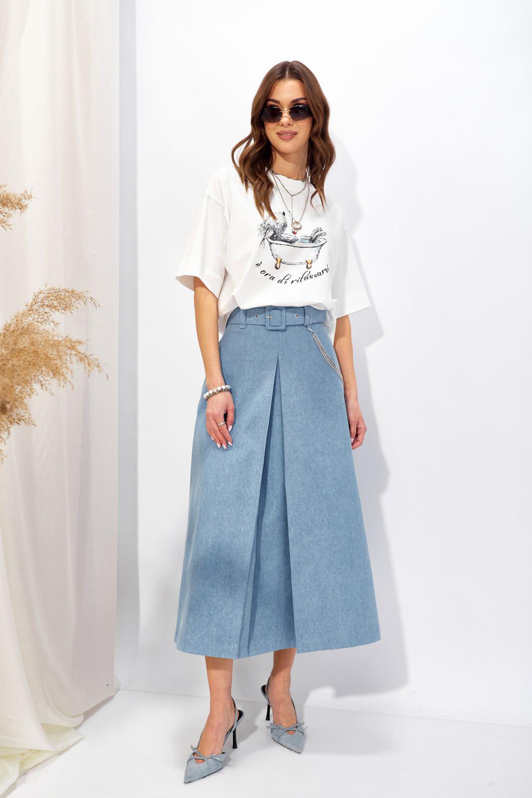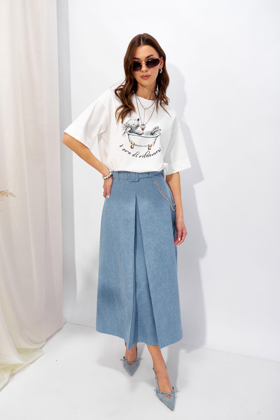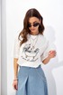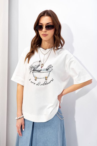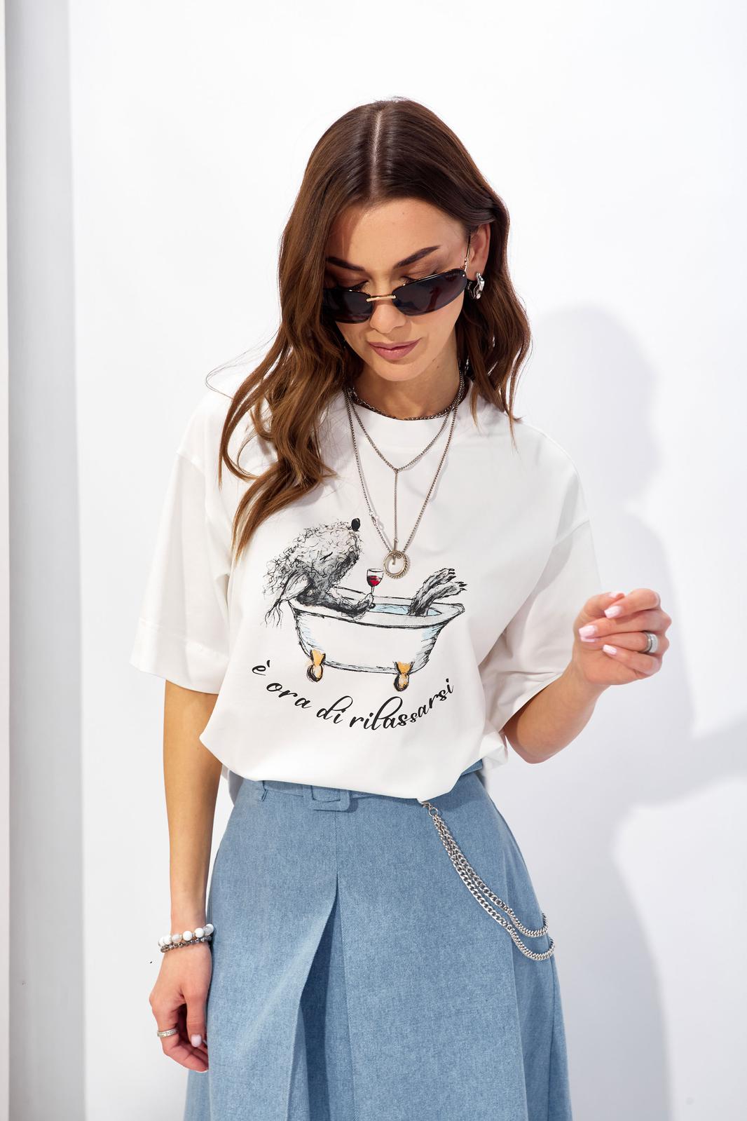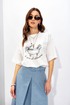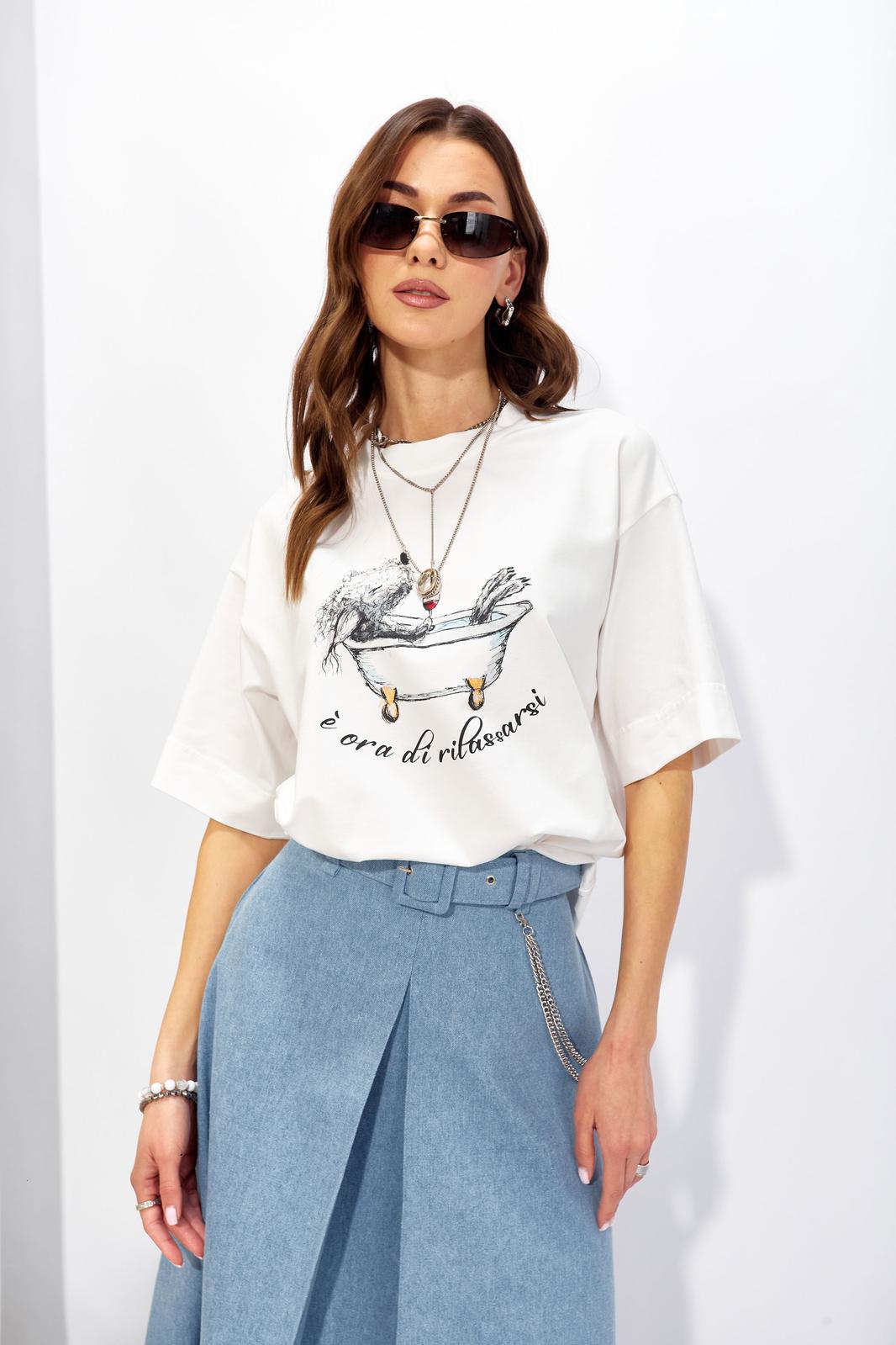 Джемпер прямого свободного силуэта из хлопкового трикотажного полотна. Вырез горловины округлый с притачной бейкой. Рукава втачные короткие. По переду дизайнерская печать.