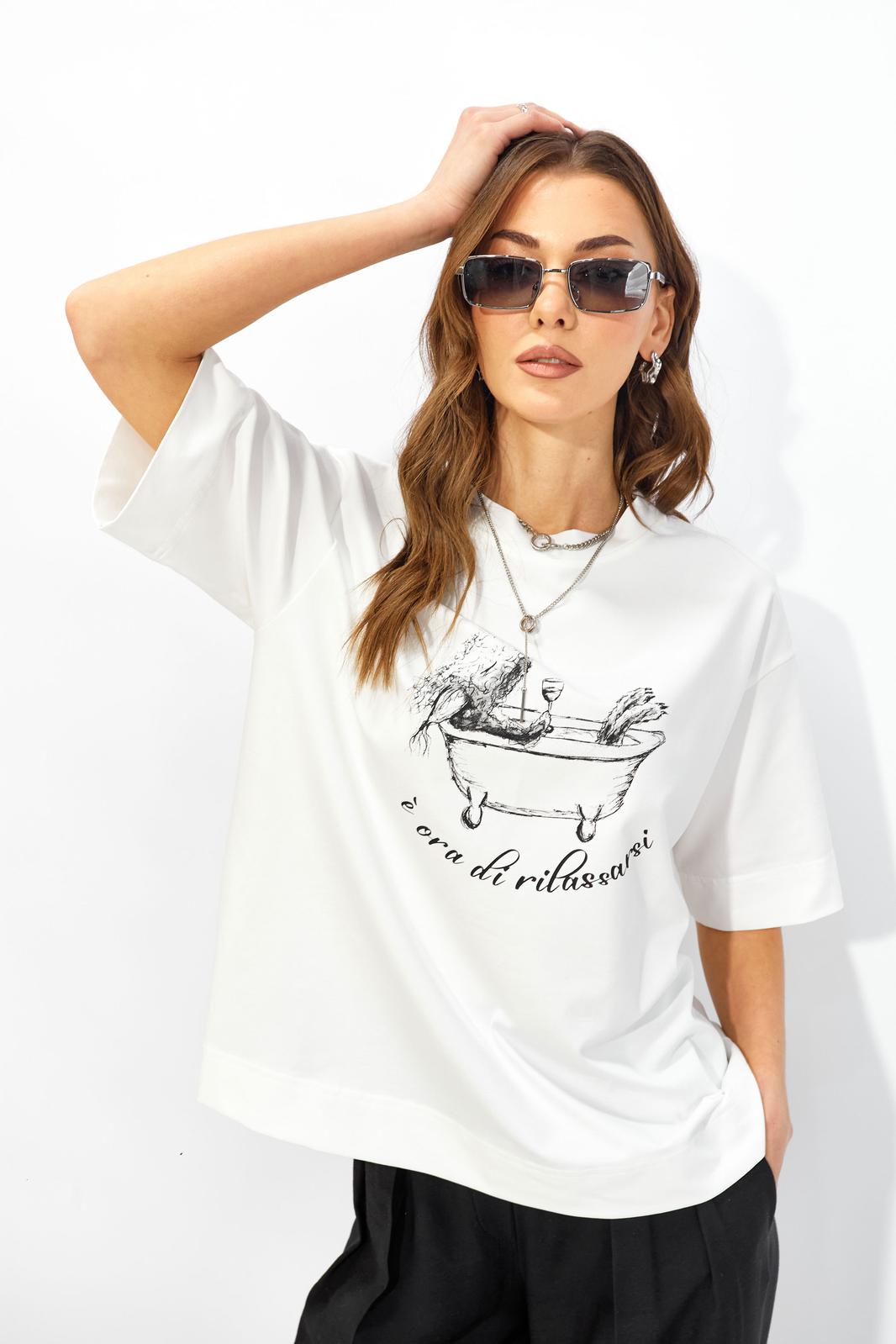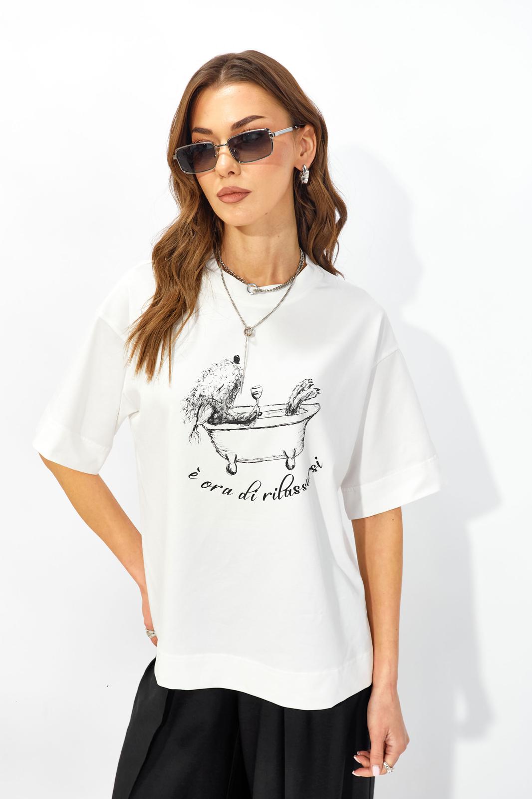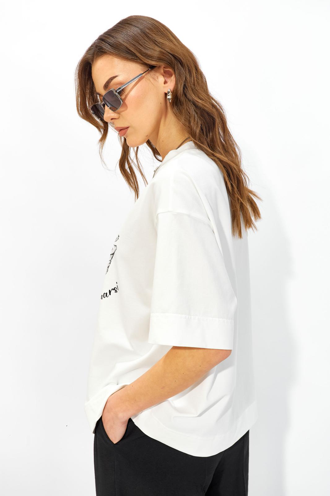 Джемпер прямого свободного силуэта из хлопкового трикотажного полотна. Вырез горловины округлый с притачной бейкой. Рукава втачные короткие. По переду дизайнерская печать.