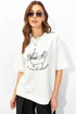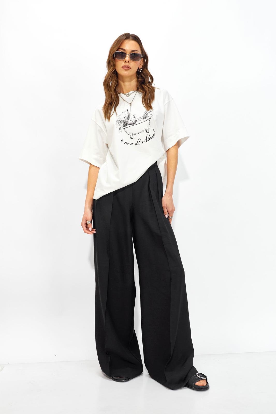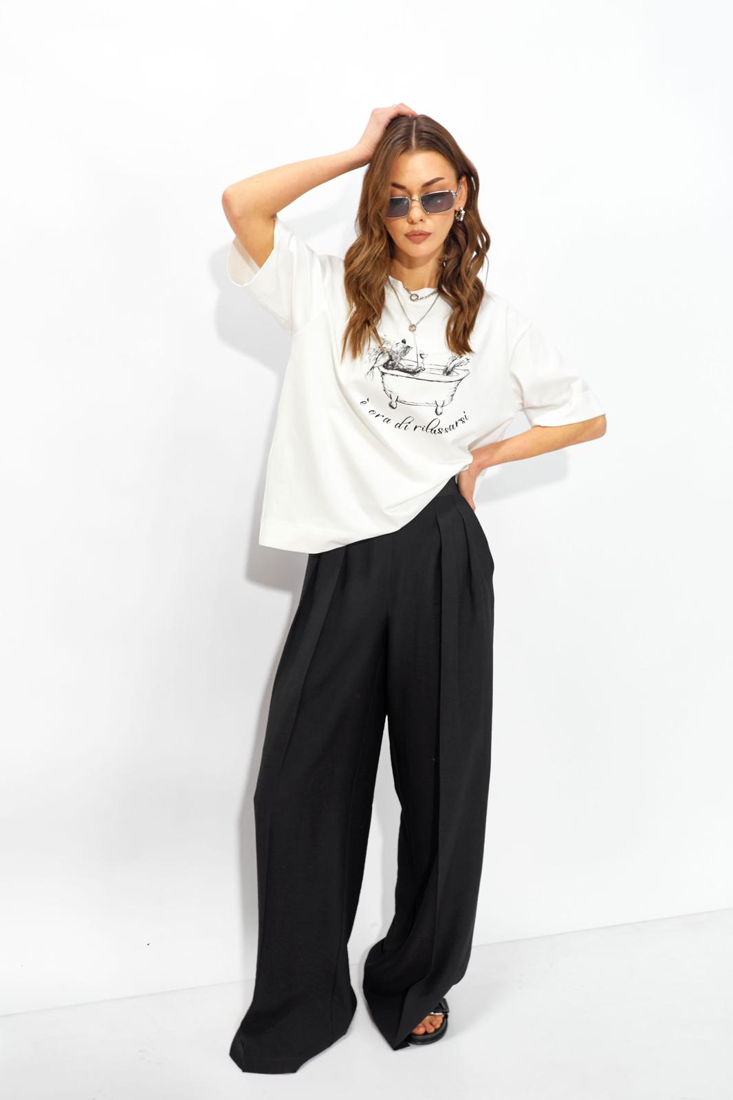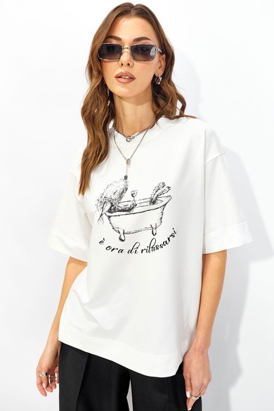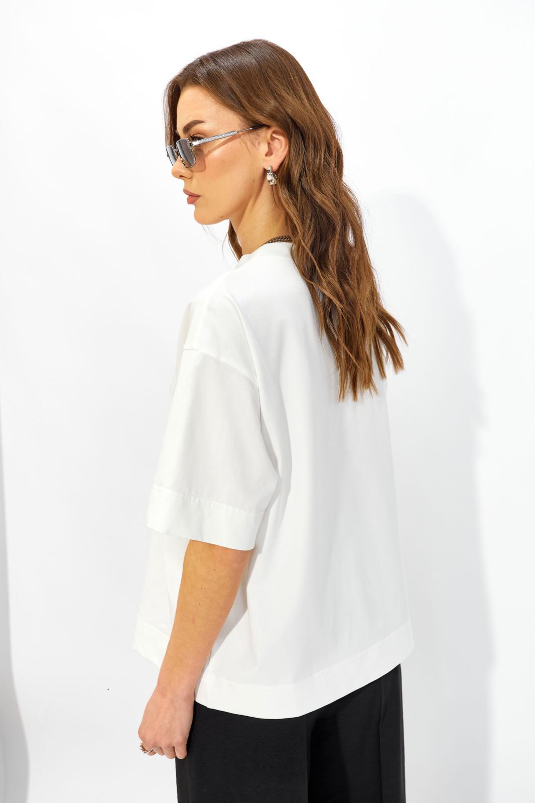 Джемпер прямого свободного силуэта из хлопкового трикотажного полотна. Вырез горловины округлый с притачной бейкой. Рукава втачные короткие. По переду дизайнерская печать.